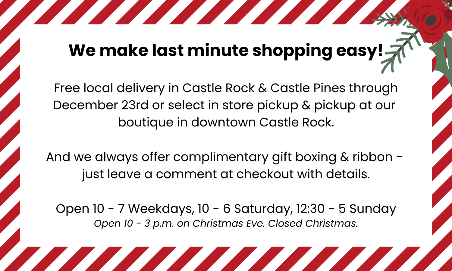 Our friendly retail associates are happy to help you in-store and with your online shopping. Grab your friends and family and come enjoy a comfortable and fun shopping environment in the emerging downtown Castle Rock. With a generous 30 day return policy, you can shop online and in-store with ease.