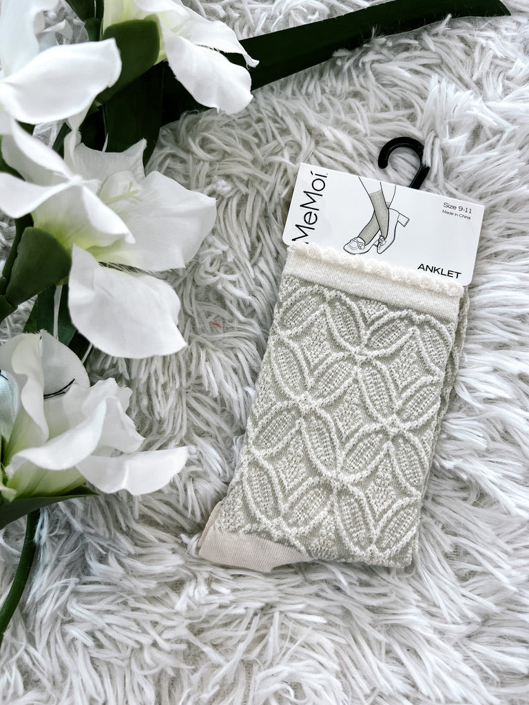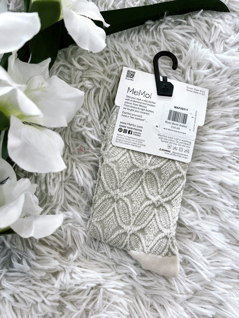 These stylish ankle socks come in two great colors in this abstract floral type print. The moss is a nice soft green color mixed with cream. It has a slight ruffle at the top of the ankle. 76% cotton, 20% polyester, & 4% spandex. These fit women's shoe sizes 4-10.