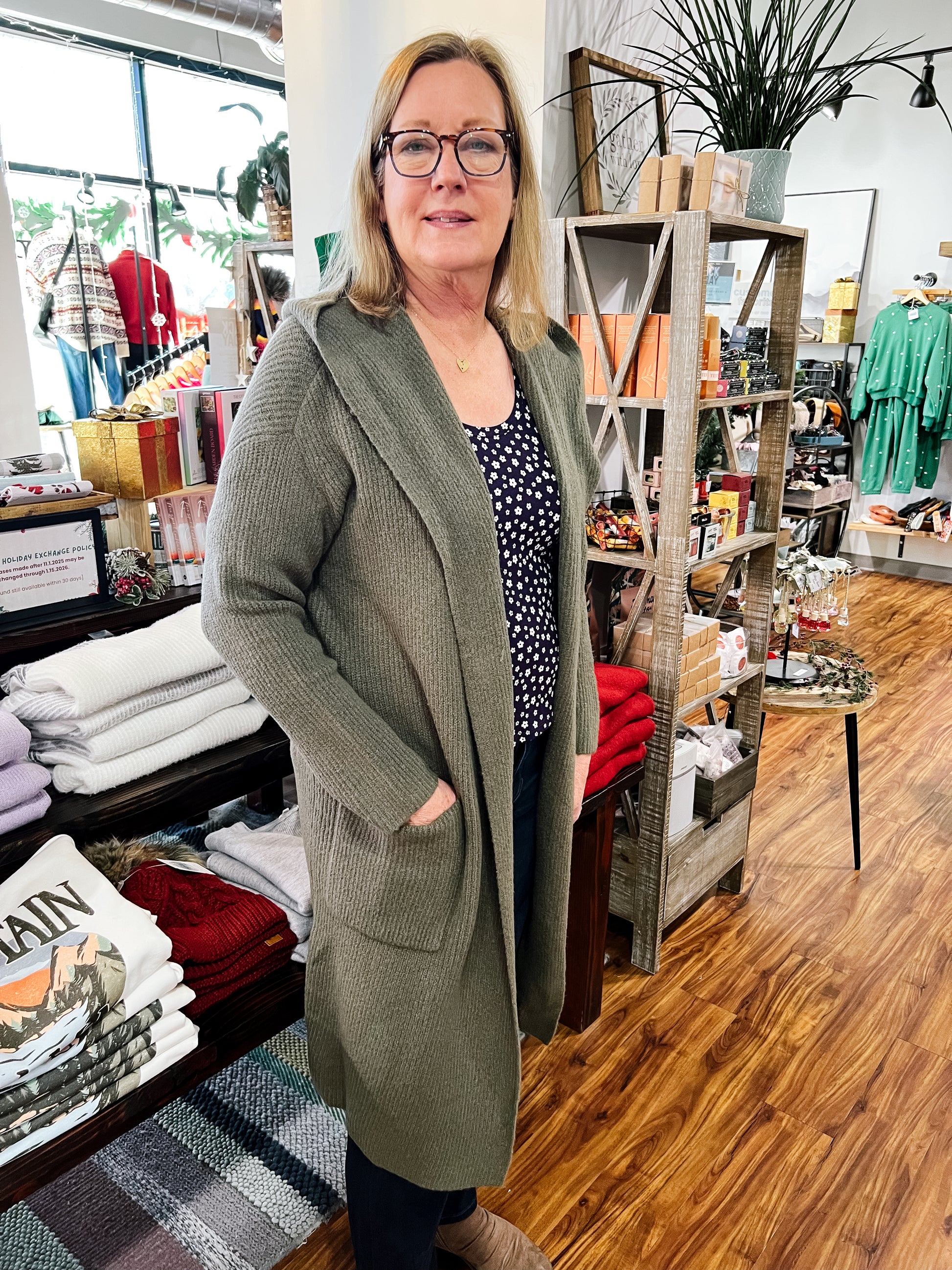 Product Description: Layer up in effortless style with this olive green hooded coatigan — the perfect blend of cozy comfort and sleek versatility. Crafted in a soft ribbed knit, it features an open-front design, two functional front pockets, and a flattering length that hits around the knee. Easy to throw on for school drop-off, weekend errands, or a casual day out, this is a timeless layer you’ll reach for again and again. *Jayne is pictured wearing a size medium.