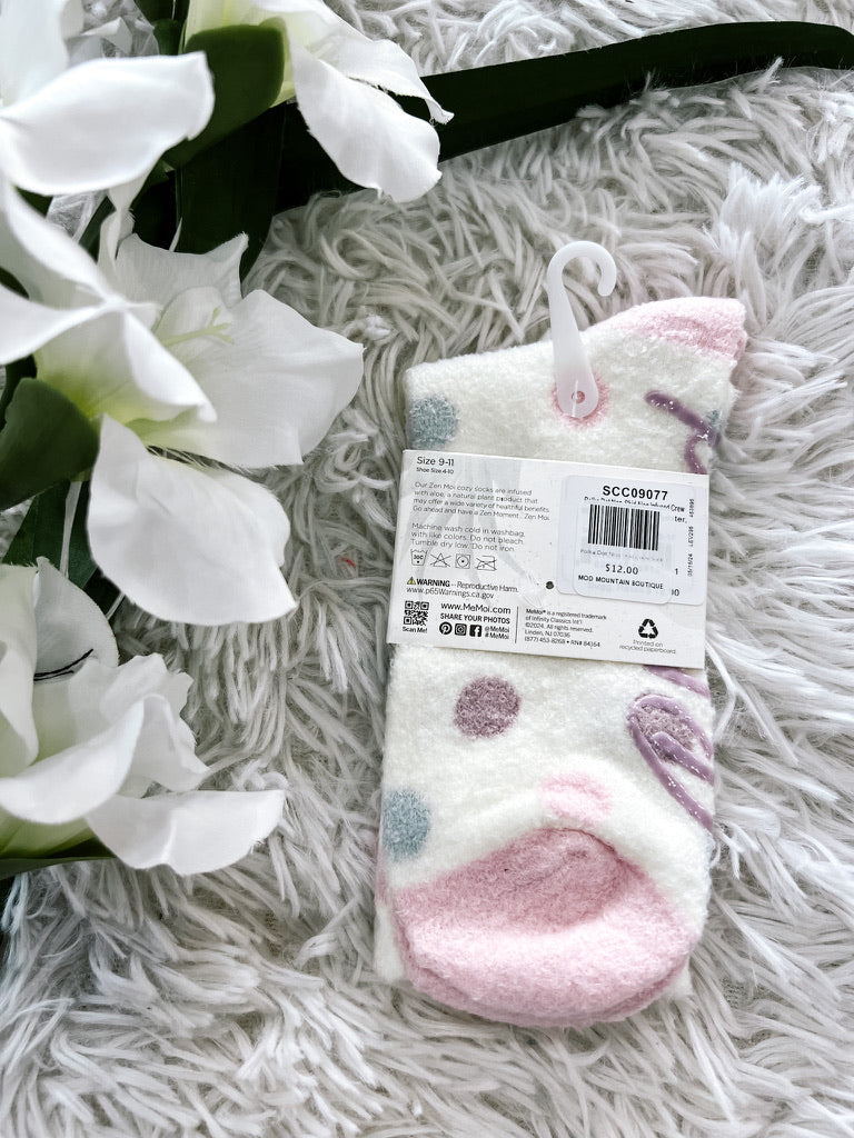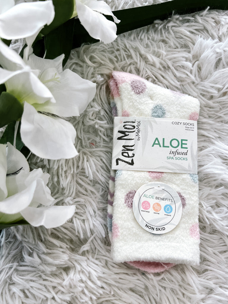 These cozy socks are made even better thanks to their aloe-infused properties. Aloe can moisturize, soothe, and hydrate keep you relaxed and your feet feeling soft. These socks also have the non-skid bottoms. Fit shoes sizes 4-10. 80% nylon, 15% polyester, 5% spandex.