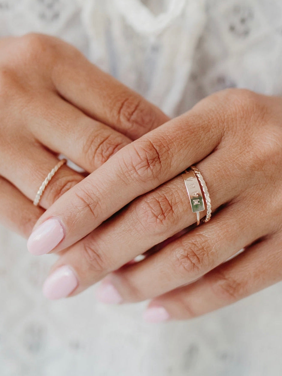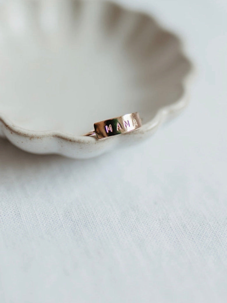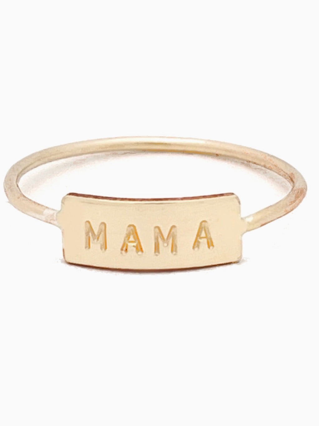 Celebrate motherhood with our Hand Stamped Mama Bar Ring. Featuring a sleek bar design, this ring is hand-stamped with "Mama" for a personalized touch. The 1mm band width makes it perfect for stacking with other rings or wearing alone for a minimalist look. Crafted from hypoallergenic, waterproof, and tarnish-resistant materials, this ring is ideal for everyday wear and makes a thoughtful gift for Mother’s Day or new baby celebrations. • Band width measures about 1mm • Includes one (1) ring • Hypoallergenic, waterproof & tarnish resistant