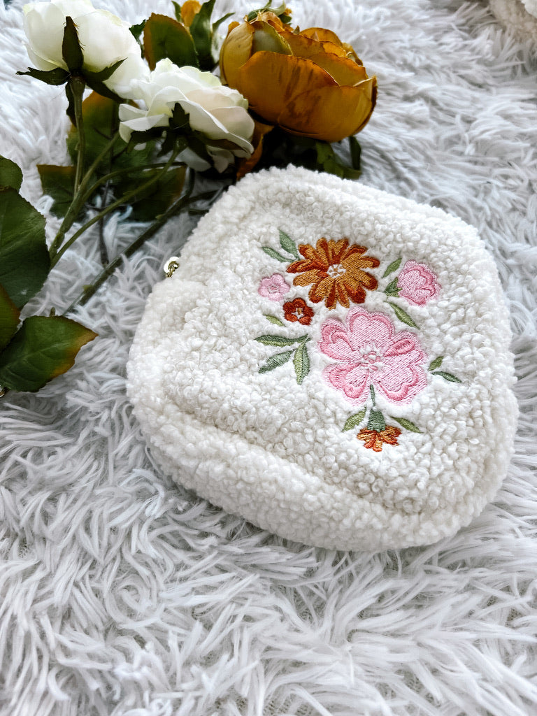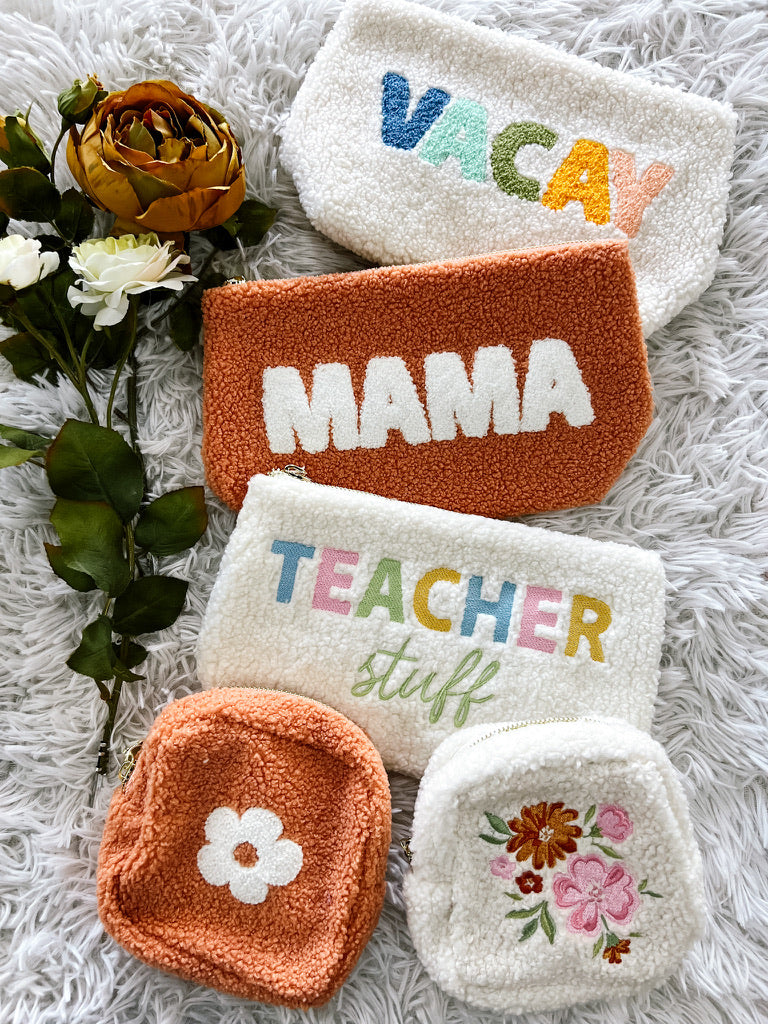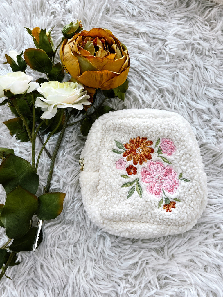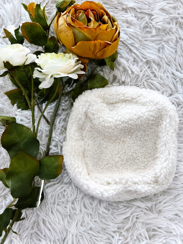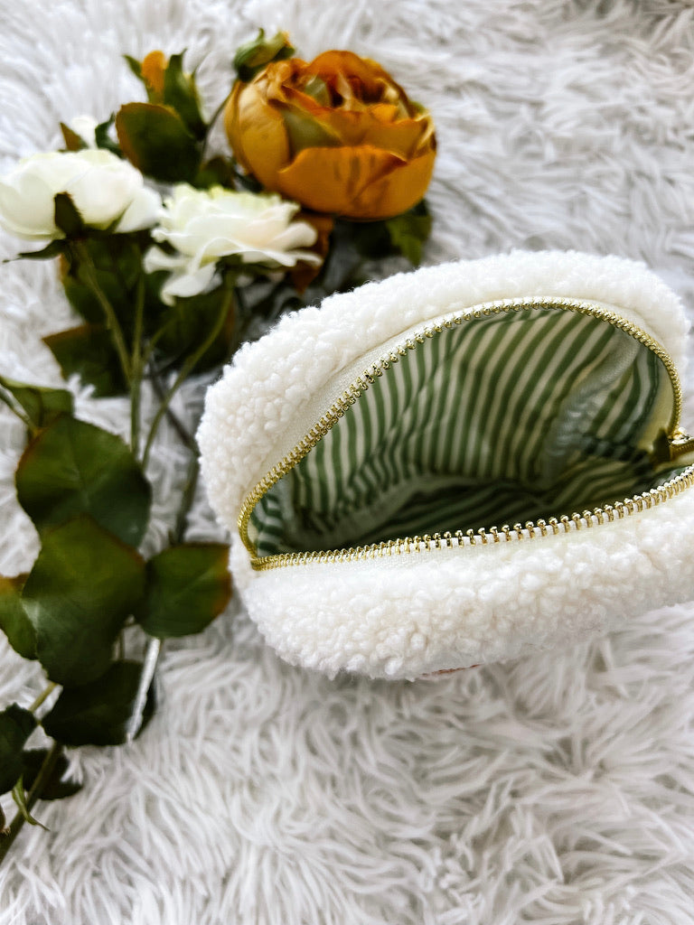 Add a cozy and functional accessory to your collection with our square teddy pouches. Made from soft sherpa fabric, these pouches feature a wipeable lining for easy maintenance and gold zippers and hardware for a touch of elegance. The interior is lined with a printed fabric, adding a fun surprise inside. The medium square size is perfect for keeping smaller essentials organized, and it pairs effortlessly with our rectangle or circle options.