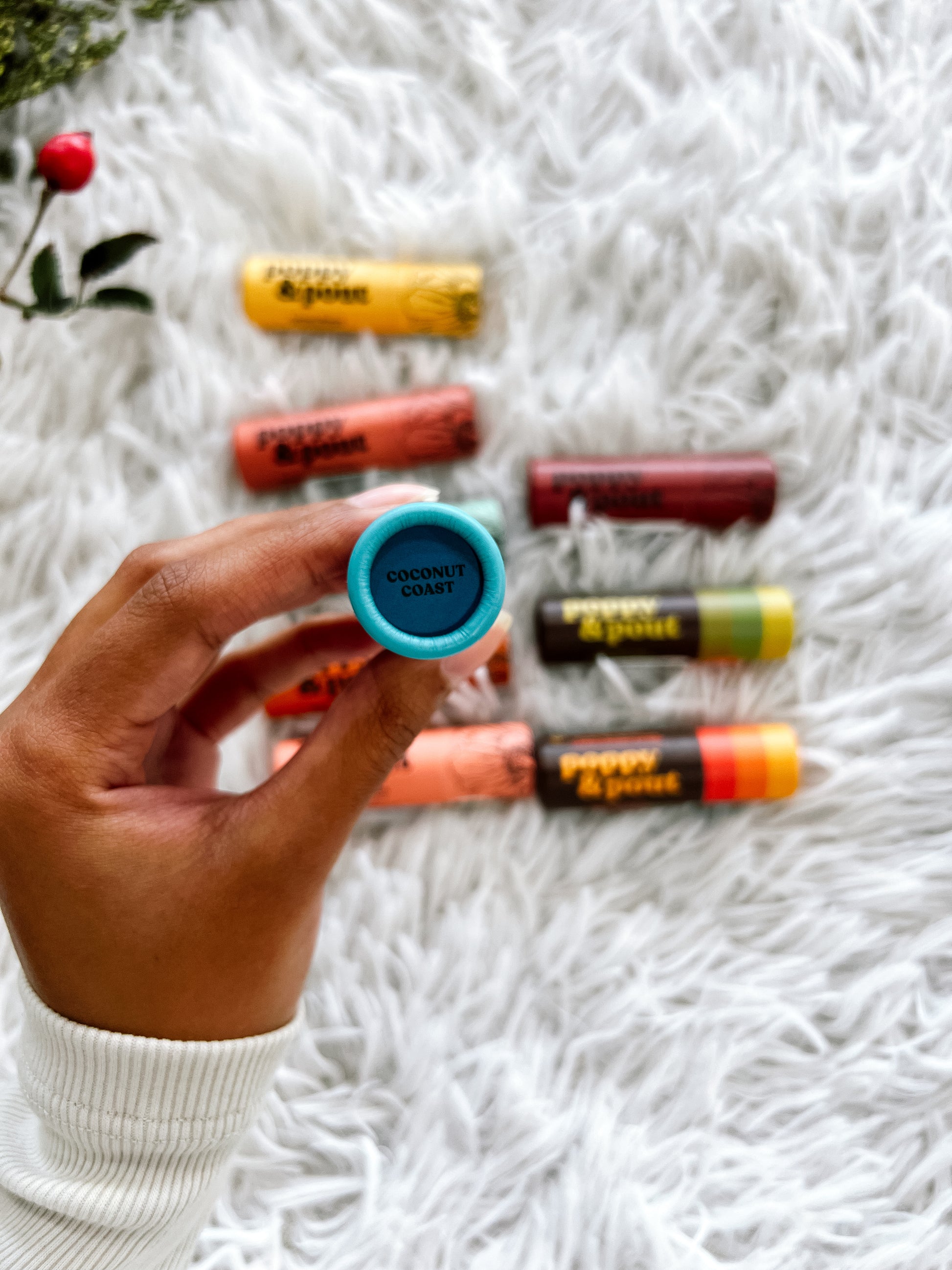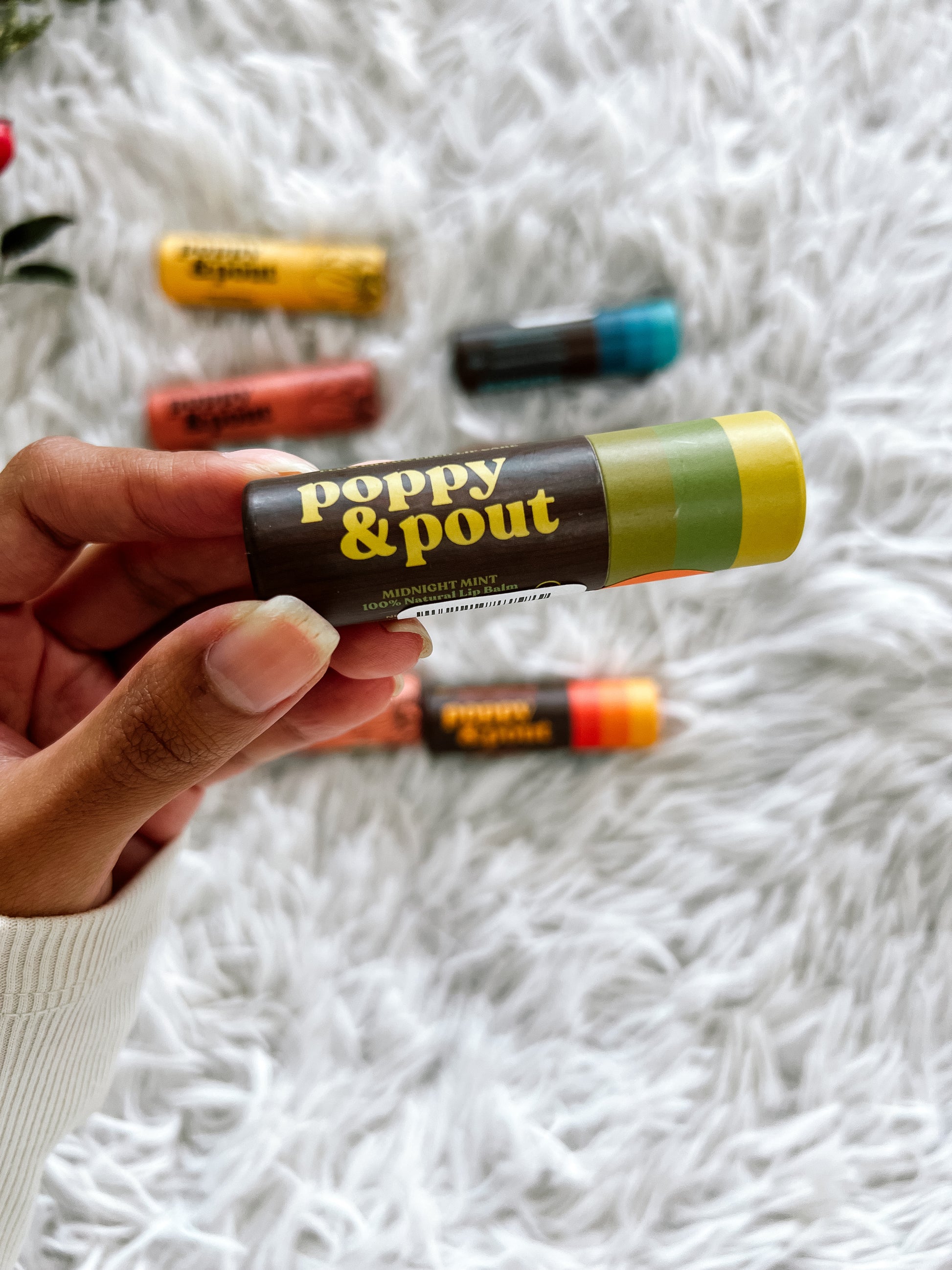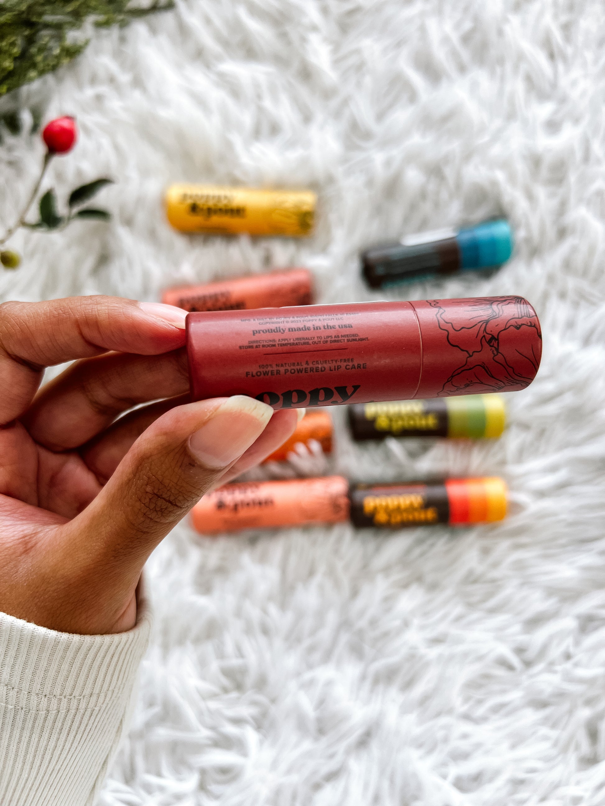 Product Description: Meet your new everyday essential! These clear lip balms from Poppy & Pout are made with all-natural ingredients to keep your lips soft, smooth, and hydrated. Each balm comes in an eco-friendly cardboard tube, making it as kind to the planet as it is to your lips. Available in an assortment of delicious flavors, these balms are perfect for stashing everywhere you need them—keep one in your purse, car, and nightstand so you’re never without a touch of moisture and shine.