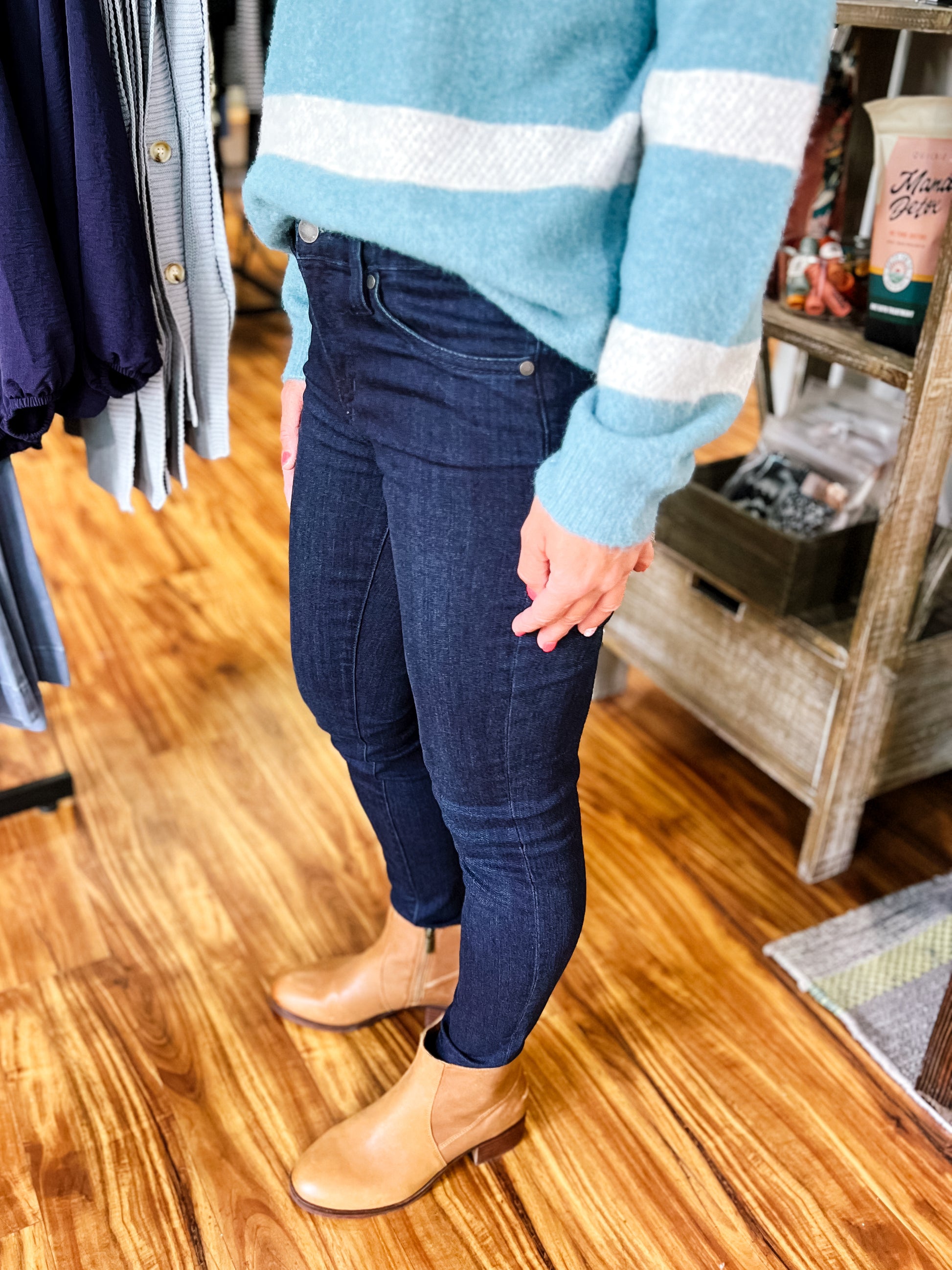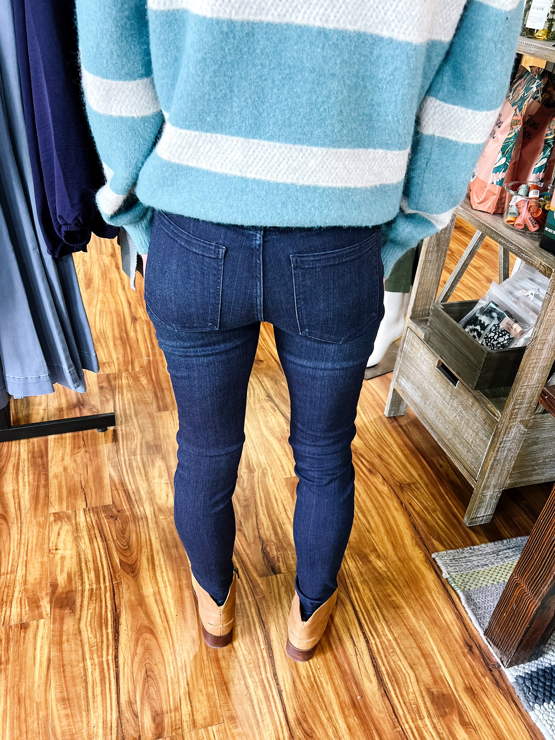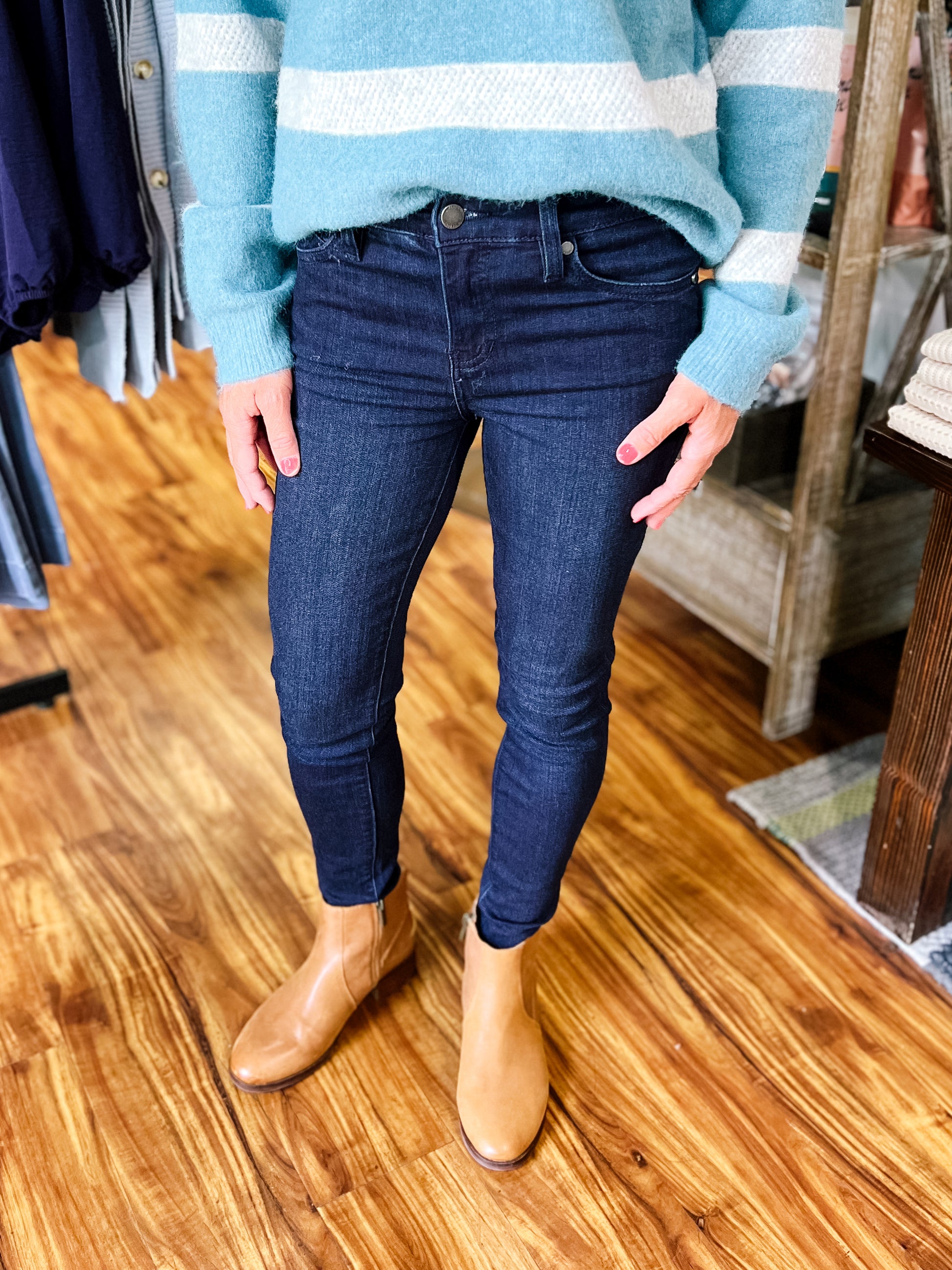 Product Description: These dark wash ankle skinny jeans are a timeless wardrobe staple with a flattering fit. Designed with a 9-inch rise and 27.5-inch inseam, they feature classic pocket styling and blue stitch detailing. The soft denim with great stretch ensures all-day comfort while keeping its sleek shape. Perfect for pairing with everything from cozy sweaters to dressy blouses.