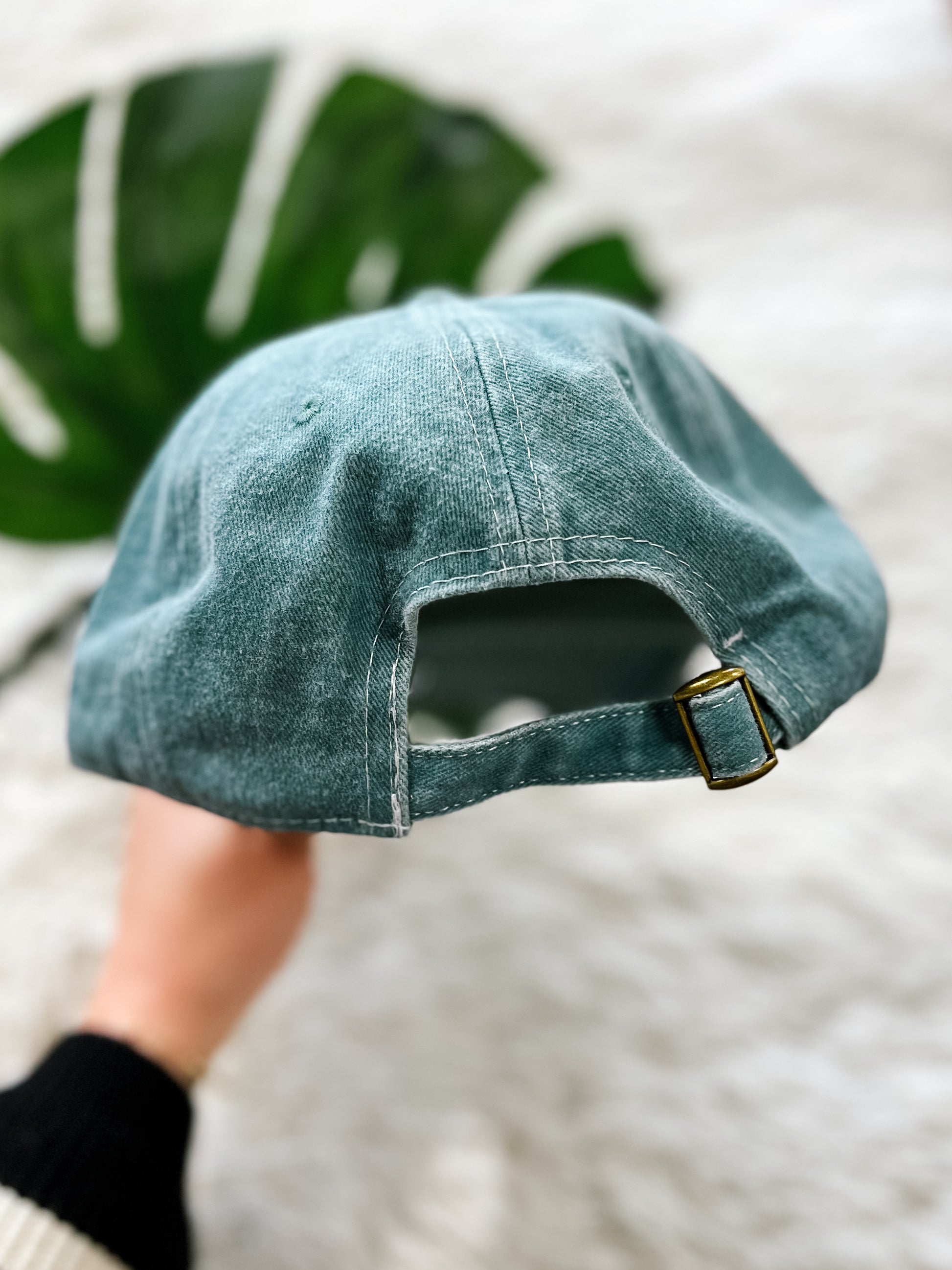 Product Description: A cotton baseball cap with an adjustable brass closure on the back. Features "Beach Please" sentiment embroidered in cream onto a weathered light blue base. Perfect addition to your vacation bag!