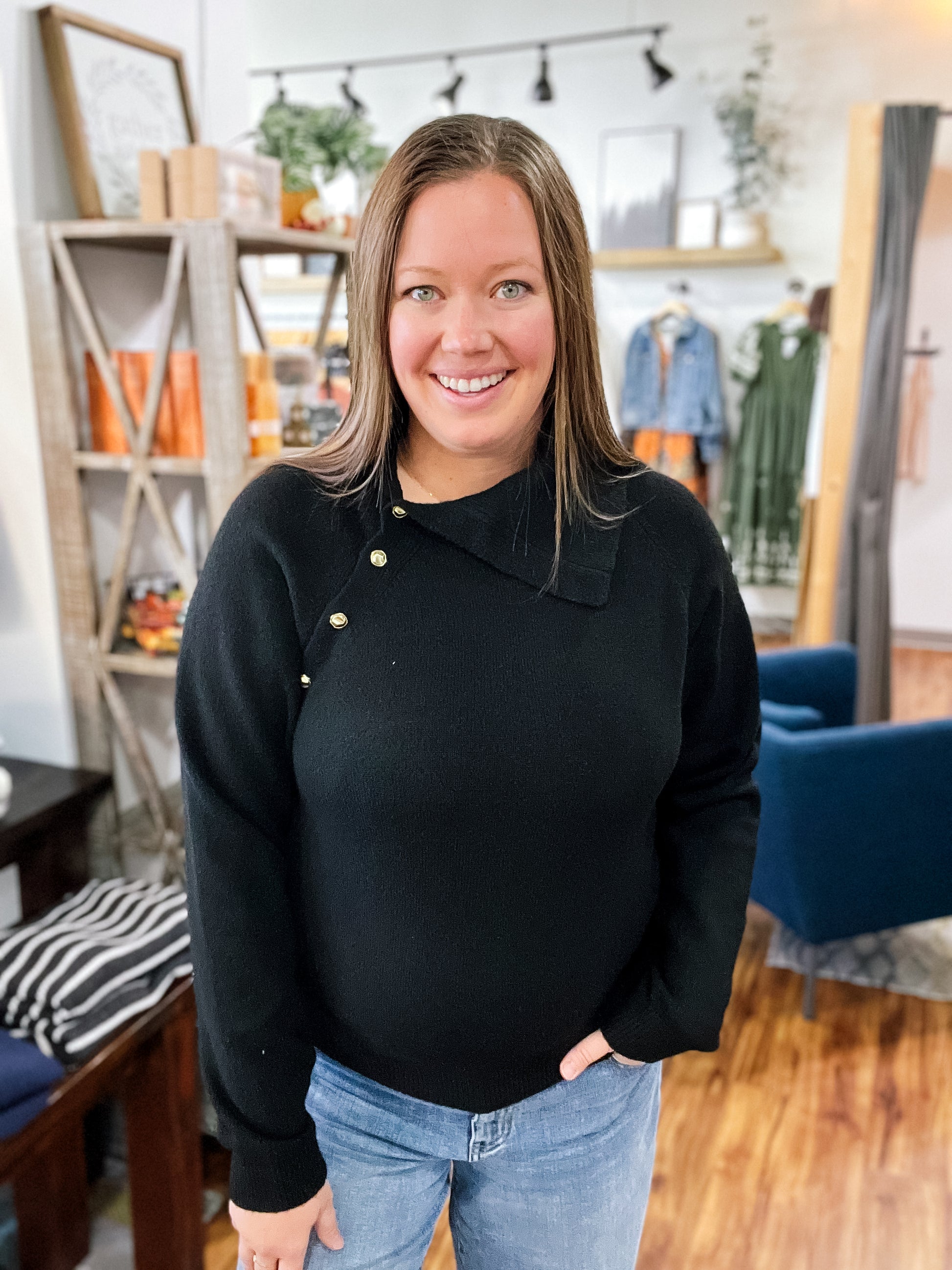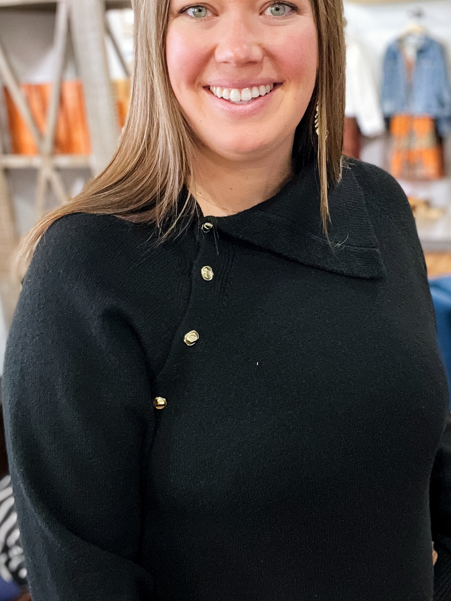 Product Description: Effortlessly elegant, this lightweight black knit sweater brings a timeless charm with its peter pan–style collar and flattering fit. A diagonal line of matte gold buttons adds a chic, modern twist — open a few for a more relaxed look or keep them closed for classic polish. Finished with a ribbed waistband and cuffs for subtle structure, it’s the perfect piece to dress up denim or pair with tailored pants for a refined touch.