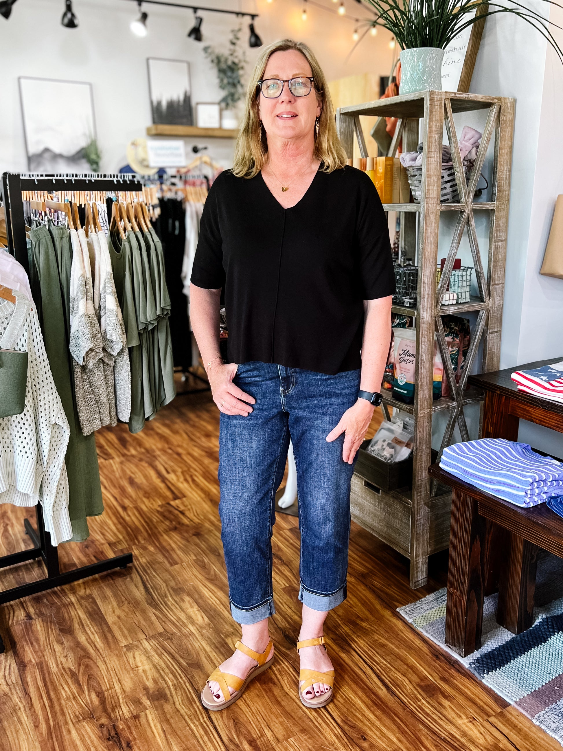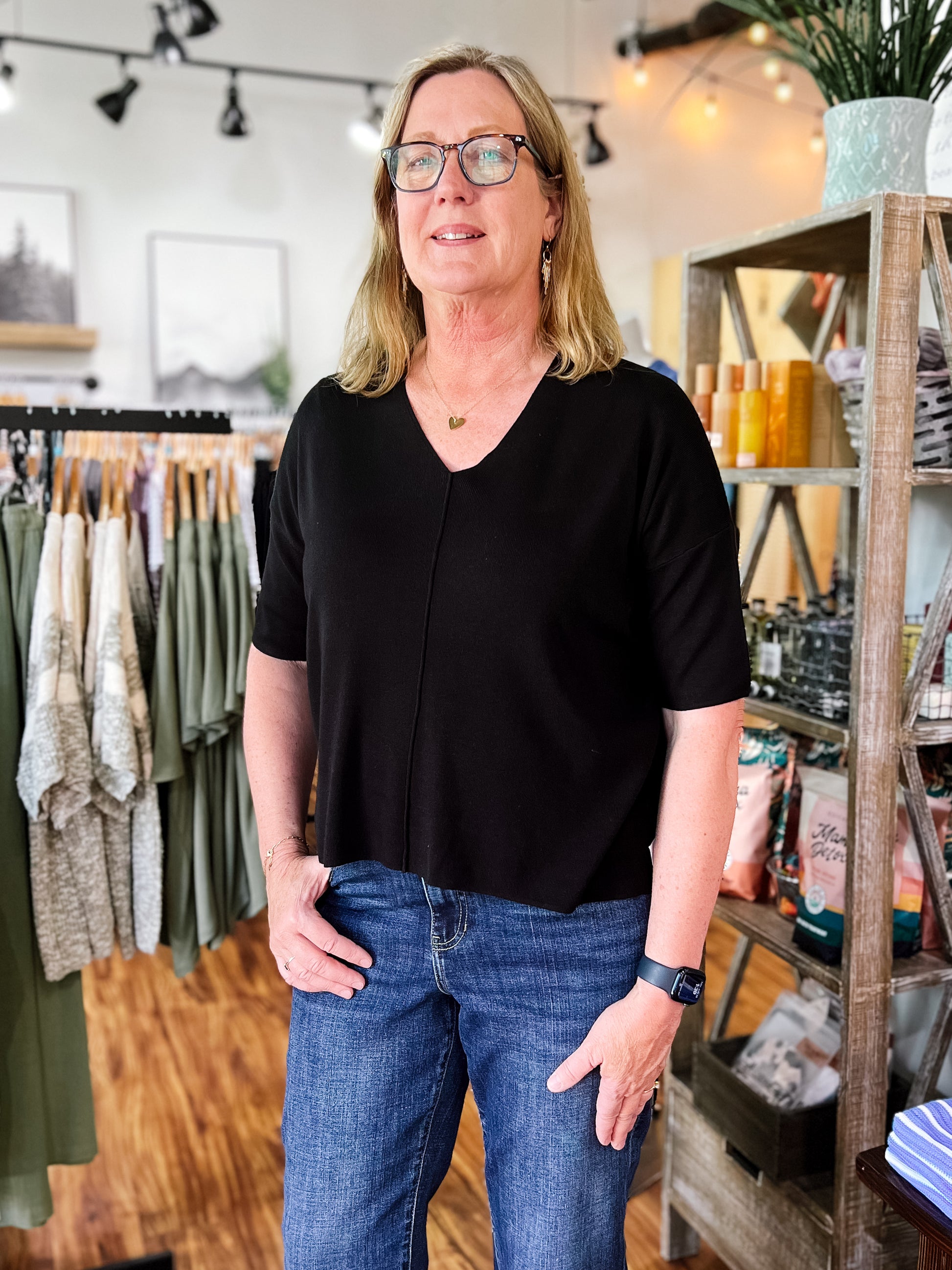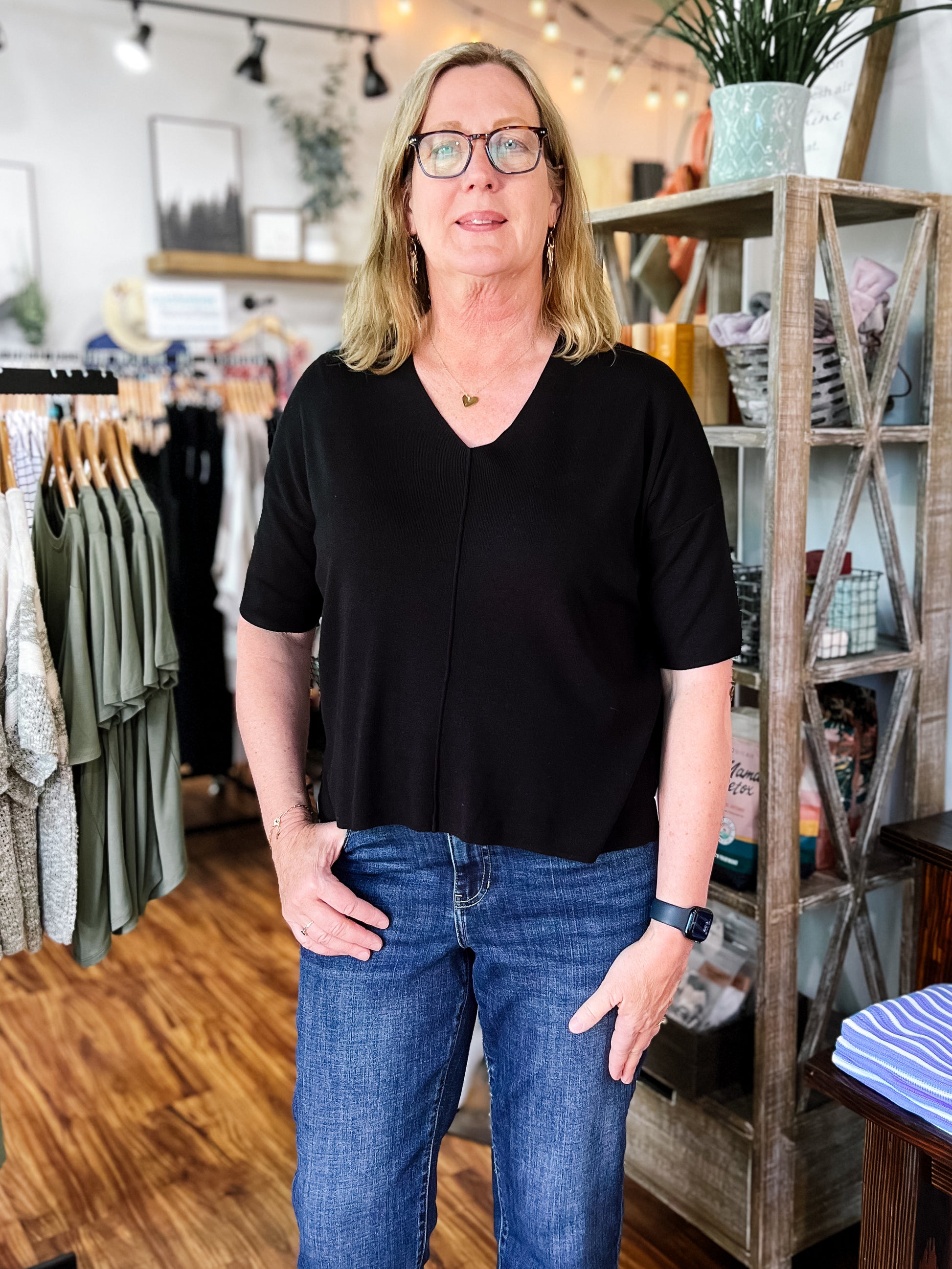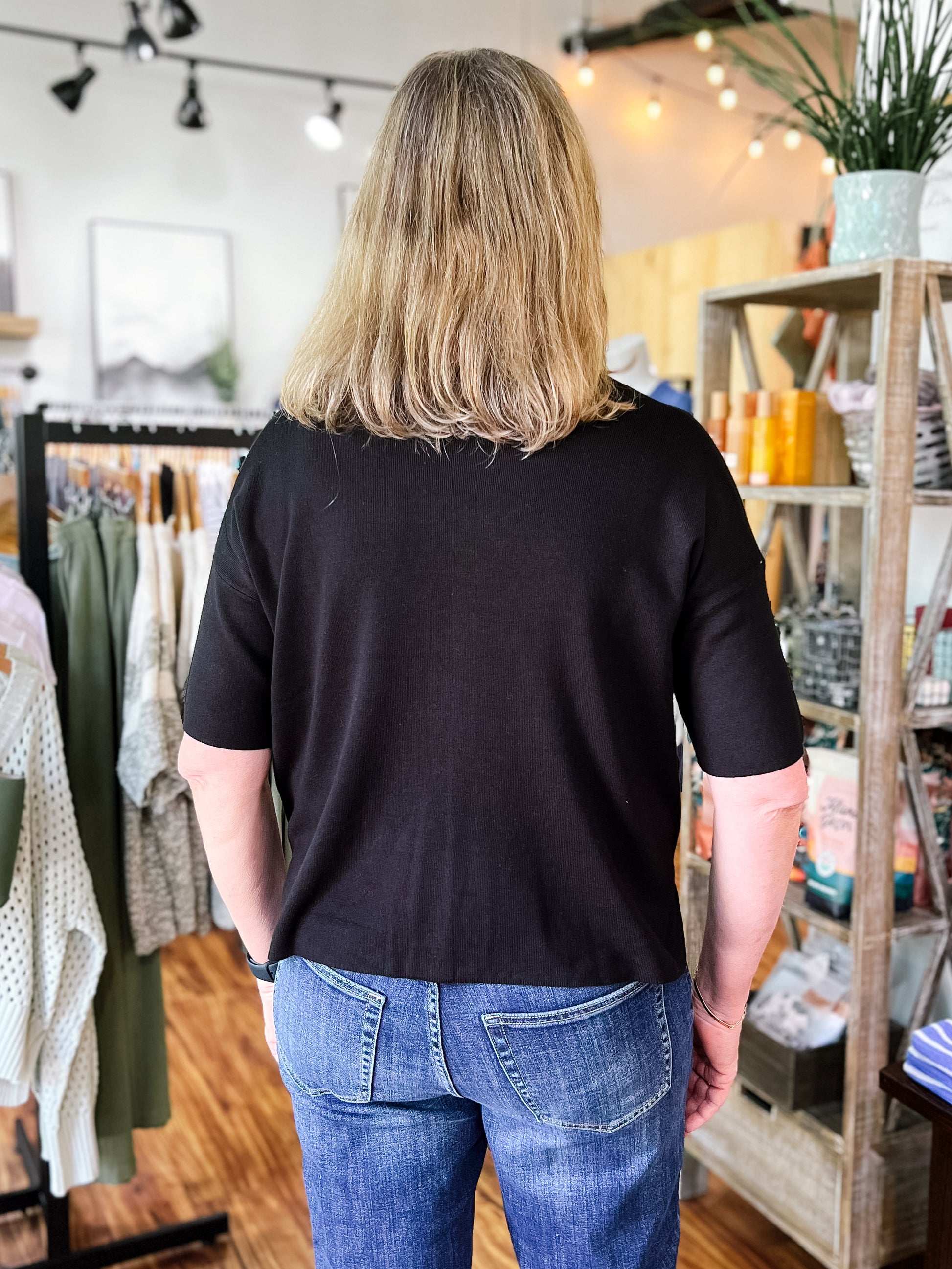 Product Description: This black short sleeve sweater features a relaxed drop shoulder design and a loose, flowy fit. The v-neckline and front seam add subtle detail, while side slits offer easy movement. A lightweight and effortless piece perfect for warm-weather layering.