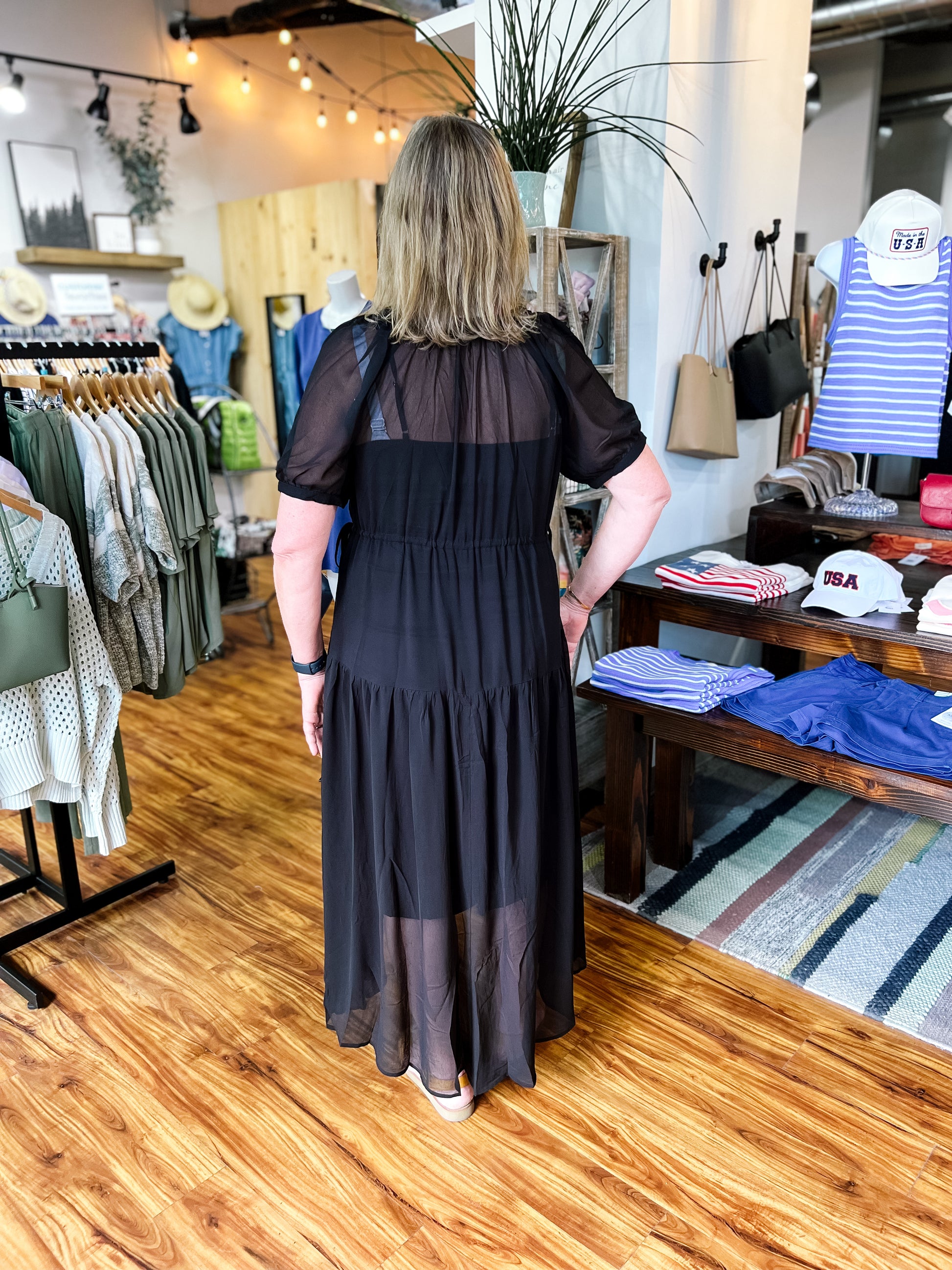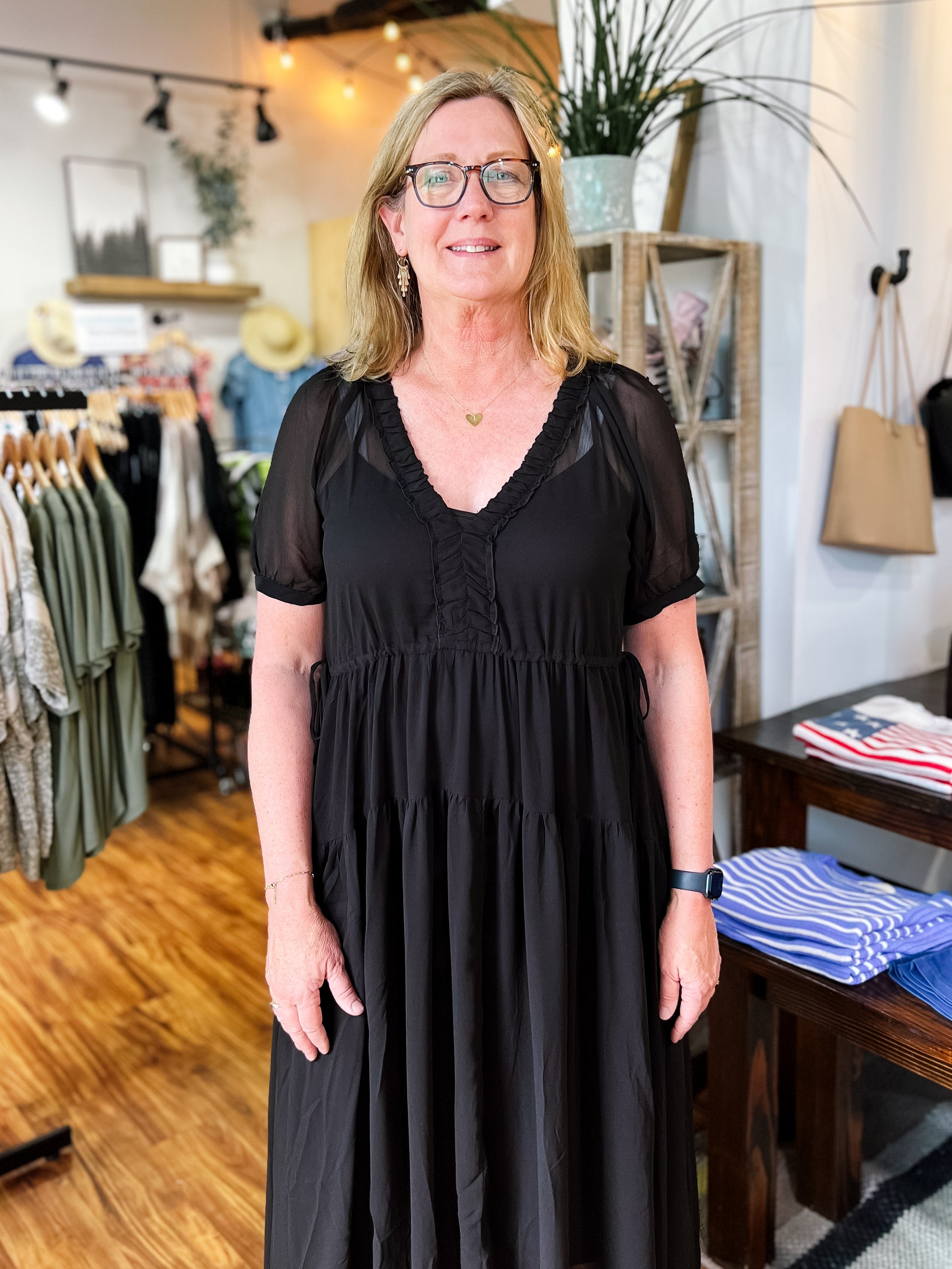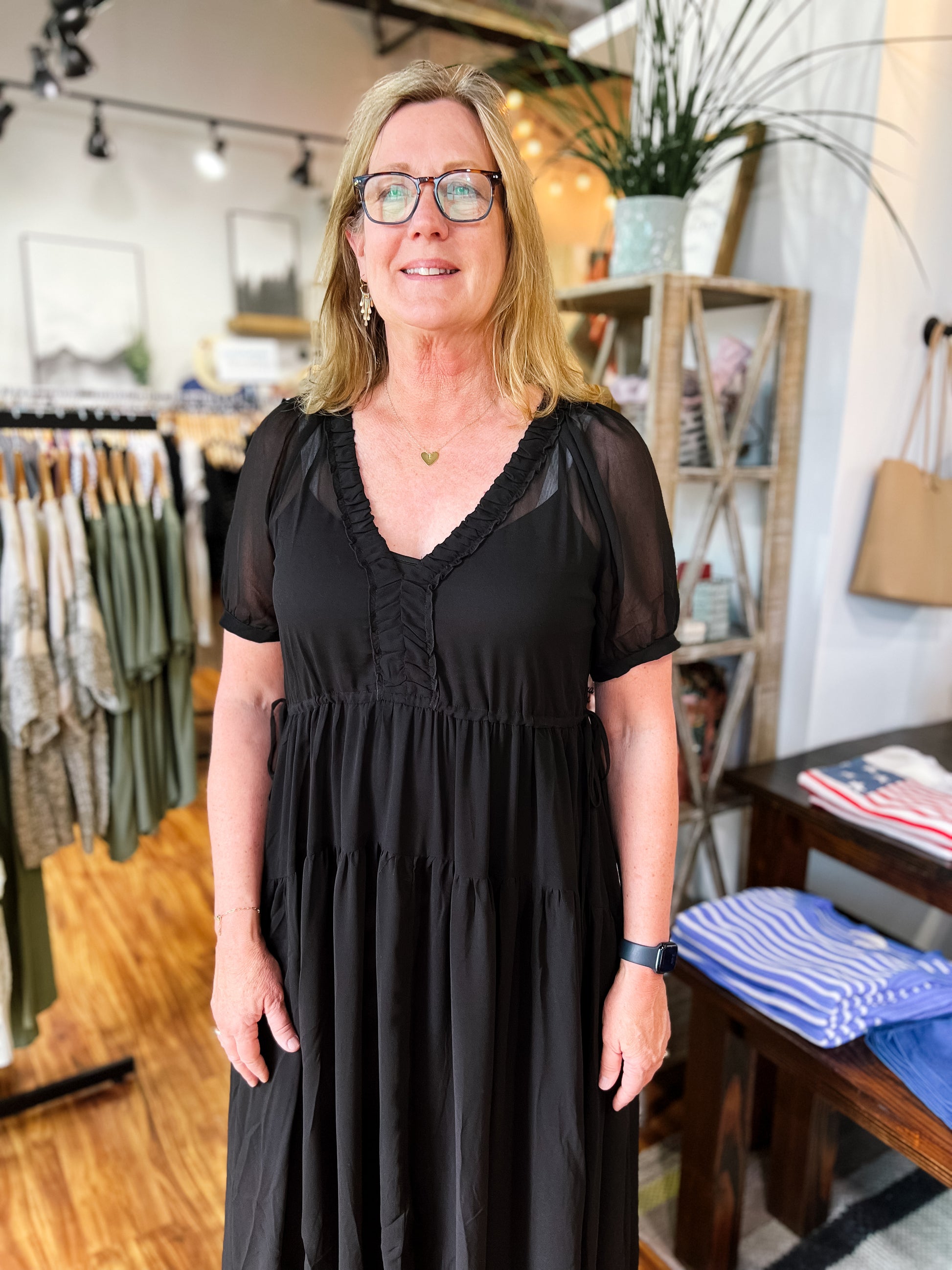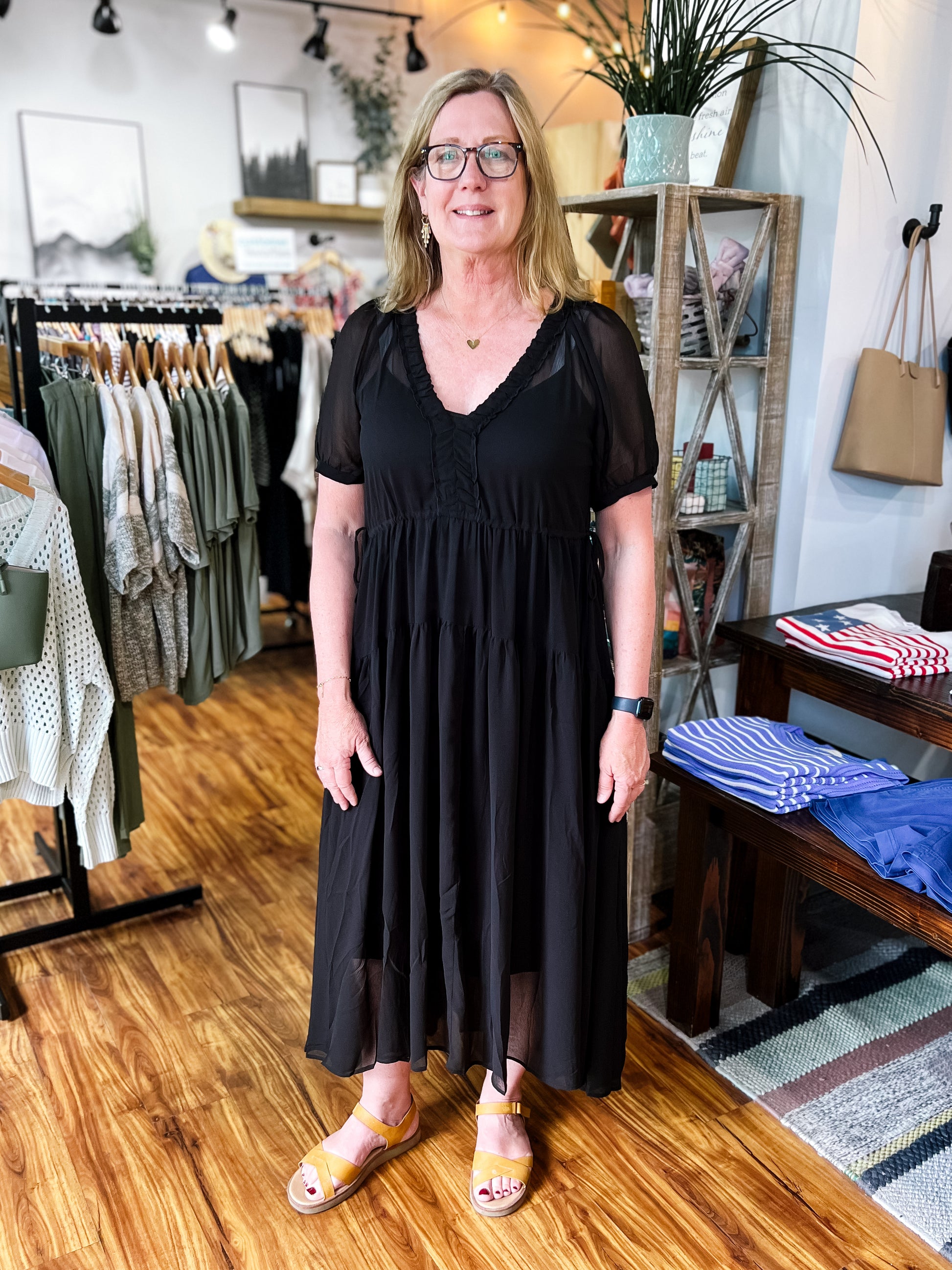 Product Description: This black V-neck midi dress brings together elegance and ease with its lightweight, sheer fabric that’s fully lined for coverage. The ruffle detail along the neckline adds a romantic touch, while the tiered high-low silhouette and subtle side cinching flatter the waistline. Flowy and feminine, it's a versatile piece for day or night.