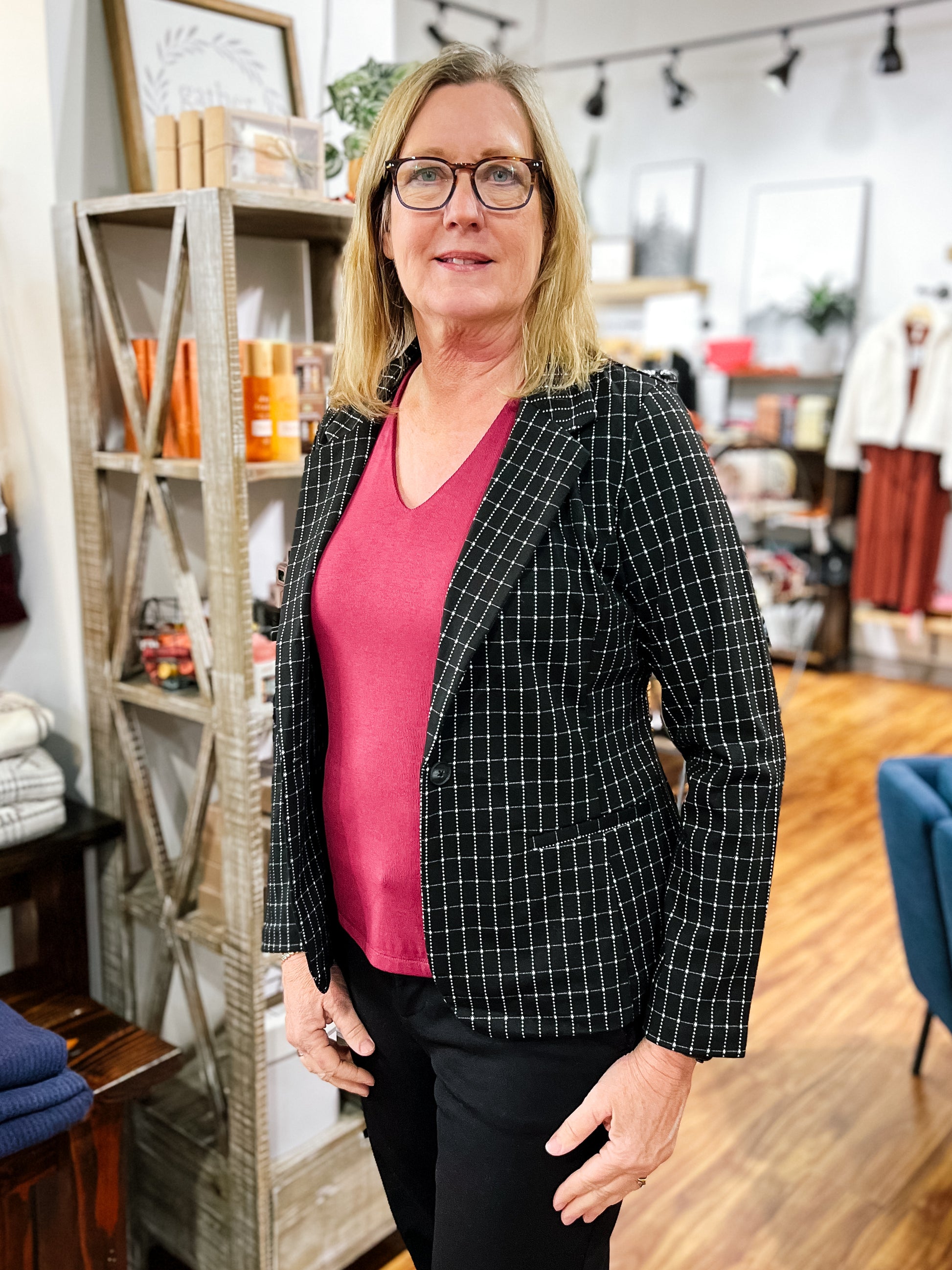 Product Description: A sleek black fitted blazer with white stitched check detailing throughout for a modern, tailored look. Features a button-front closure and two functional front pockets. Polished yet versatile — perfect for dressing up denim or completing a professional ensemble.