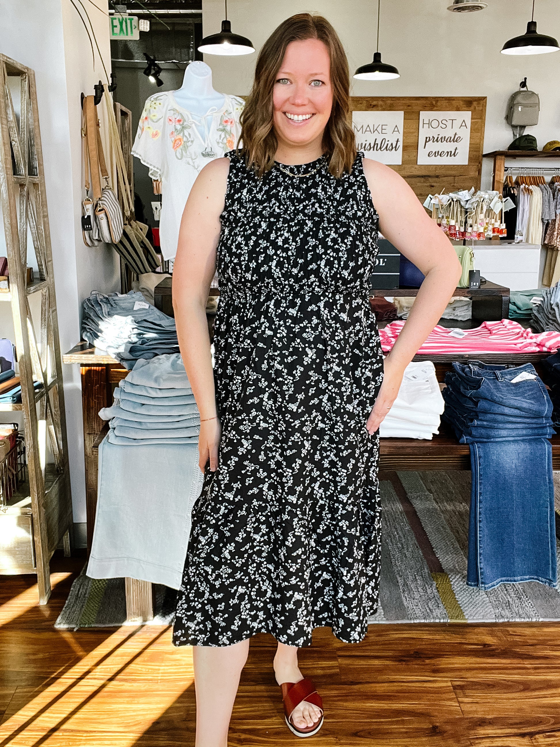 Product Description: This sweet black sundress features a delicate white floral print for an effortlessly feminine look. The smocked tank-style bodice offers plenty of stretch for a comfortable, flattering fit, while the flowy, subtly tiered skirt adds soft movement. Finished with side pockets and a single button closure at the back of the neck for easy wear. Pair it with sandals or white sneakers for the perfect warm-weather outfit.