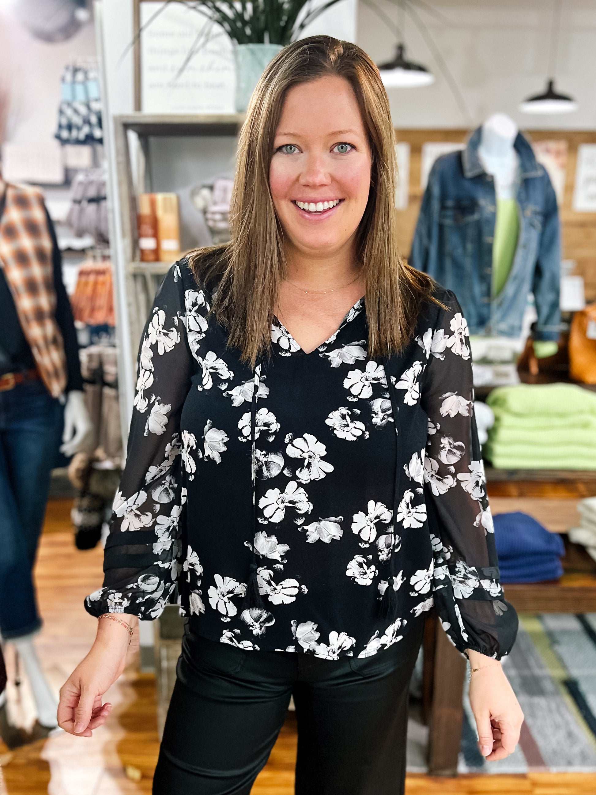 Product Description: A black backdrop with delicate white florals makes this blouse effortlessly feminine. The long balloon sleeves are sheer and airy, finished with gentle ruffle details for added charm. A ruffled collar with a keyhole neckline and tassel ties creates a soft, romantic touch. Designed in a loose, flowy fit that moves beautifully with you—perfect for dressing up or wearing casually with jeans.