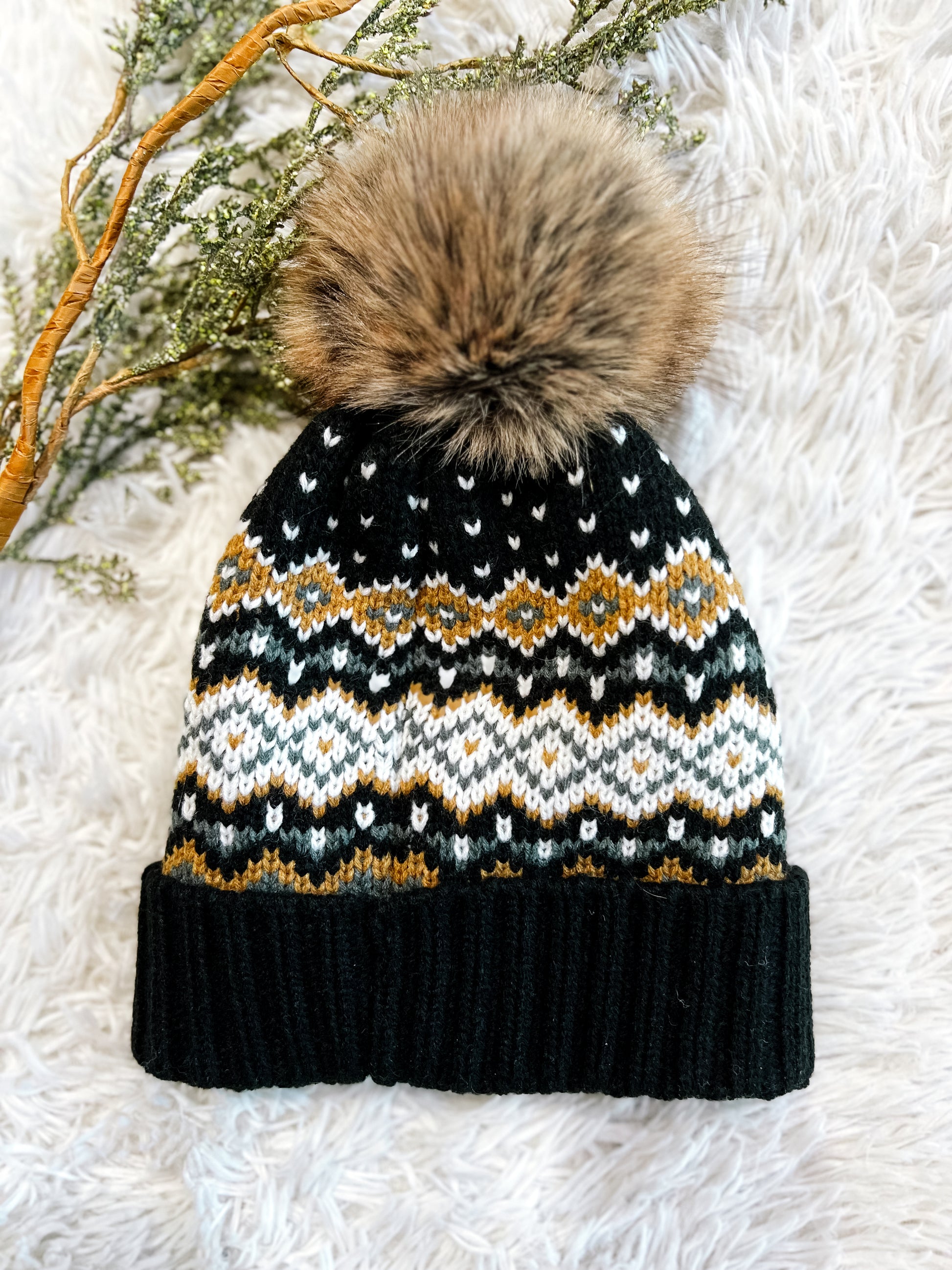 Black, White, Mustard & Blue Patterned Pom Beanie