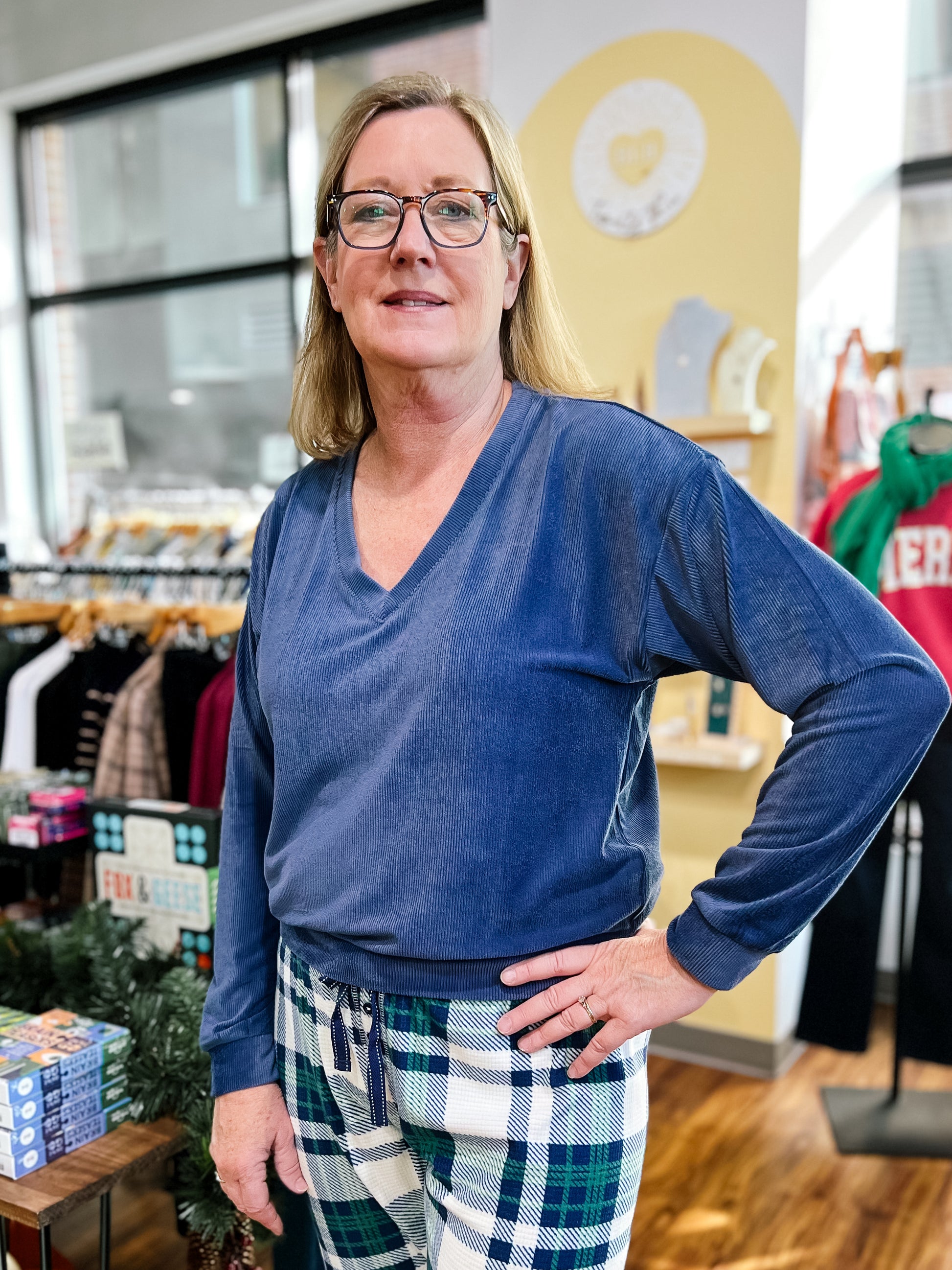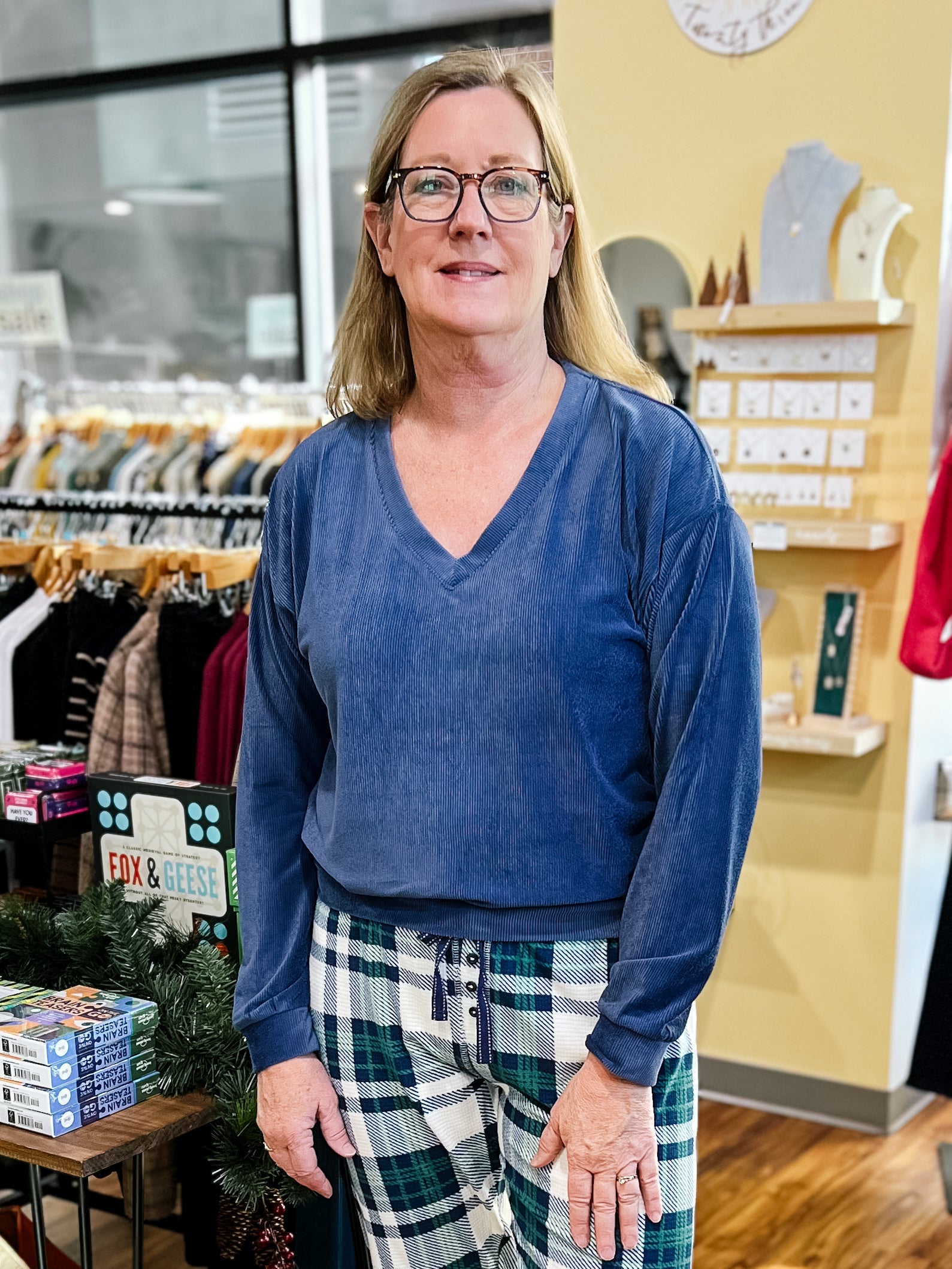 Product Description: This long sleeve top combines classic style with cozy comfort in a soft denim blue corduroy fabric. The flattering V-neck adds a touch of elegance, while the supple material makes it perfect for layering or wearing on its own. Soft, versatile, and easy to dress up or down, it’s a go-to top for casual outings or relaxed weekend vibes.