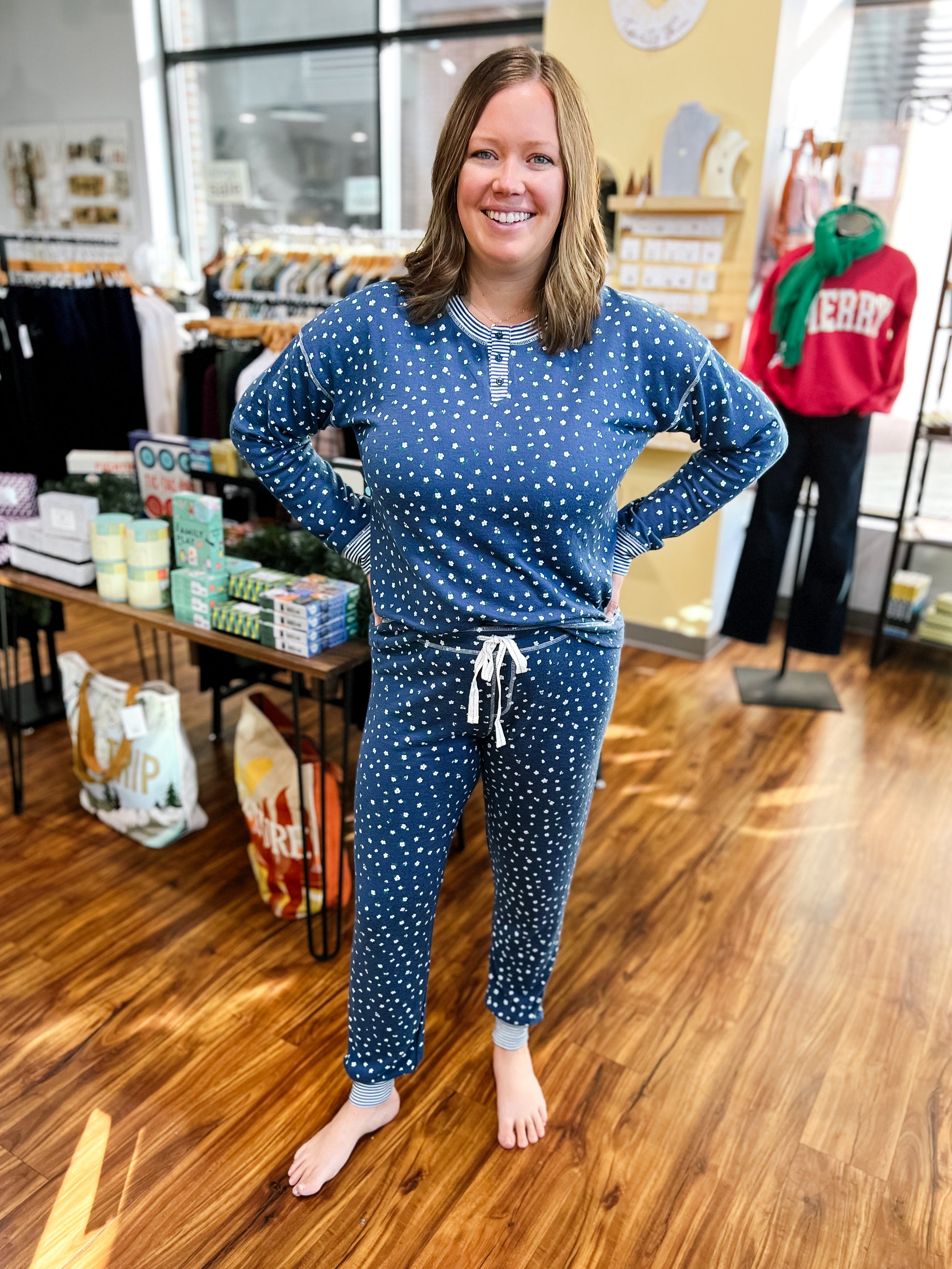 Product Description: Sweet, soft, and so easy to wear — this blue long sleeve top features a charming white floral print and coordinating striped details.Designed in an ultra-soft fabric, it has a round neckline with button accents and blue-and-white striped trim at the neck and cuffs for a fun, finished look. Pair it with the matching joggers for a cute, cozy set perfect for lounging.