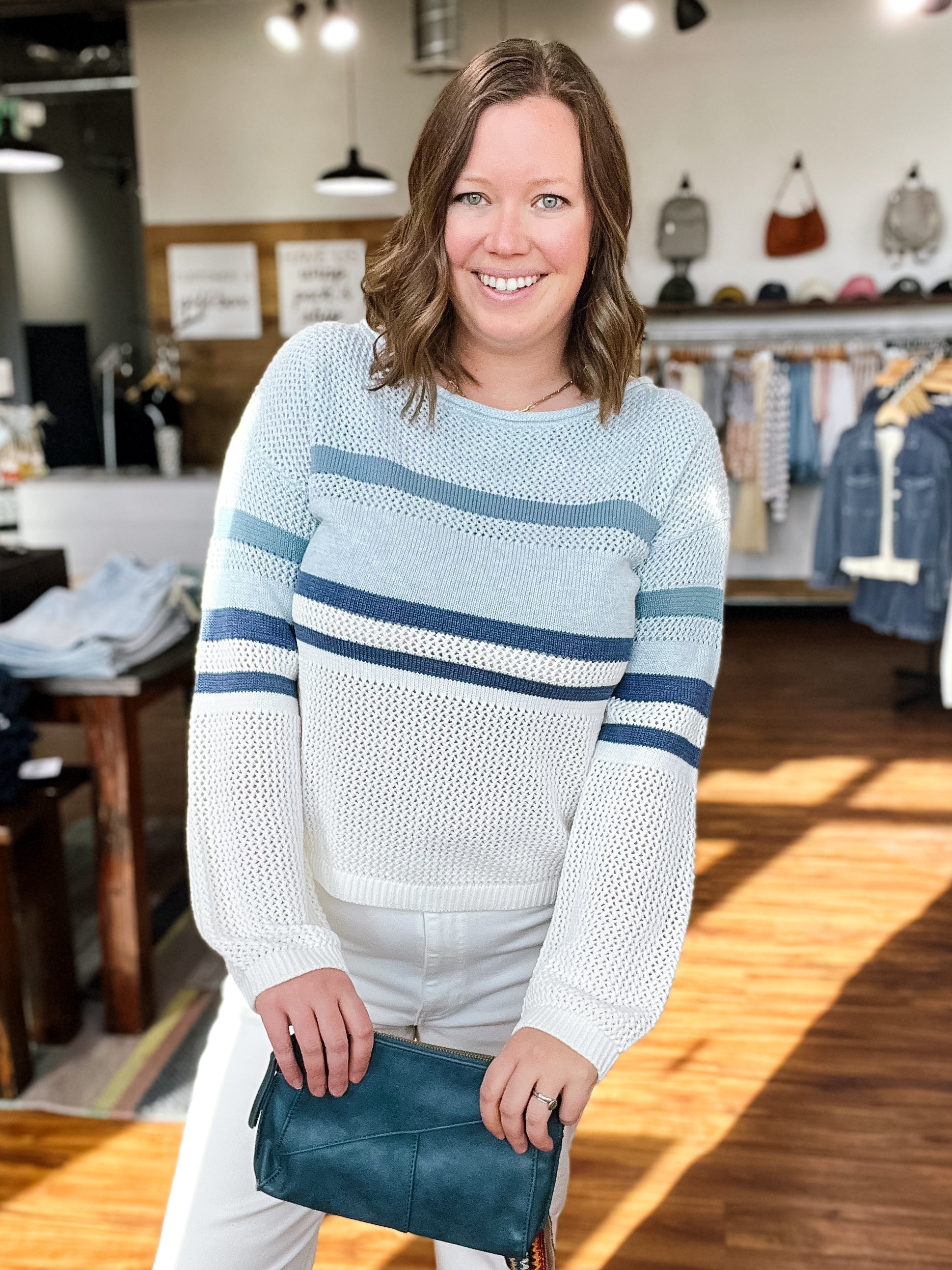 Product Description: Stay effortlessly stylish in this mixed open knit boatneck sweater, designed with a relaxed silhouette and a softly rolled neckline for a touch of casual charm. The lightweight knit makes it the perfect layering piece for spring, offering just enough warmth without feeling heavy. Wear it on its own with your favorite denim or drape it over your shoulders for an easy, fashion-forward look. A versatile sweater that adds texture and laid-back polish to any outfit.