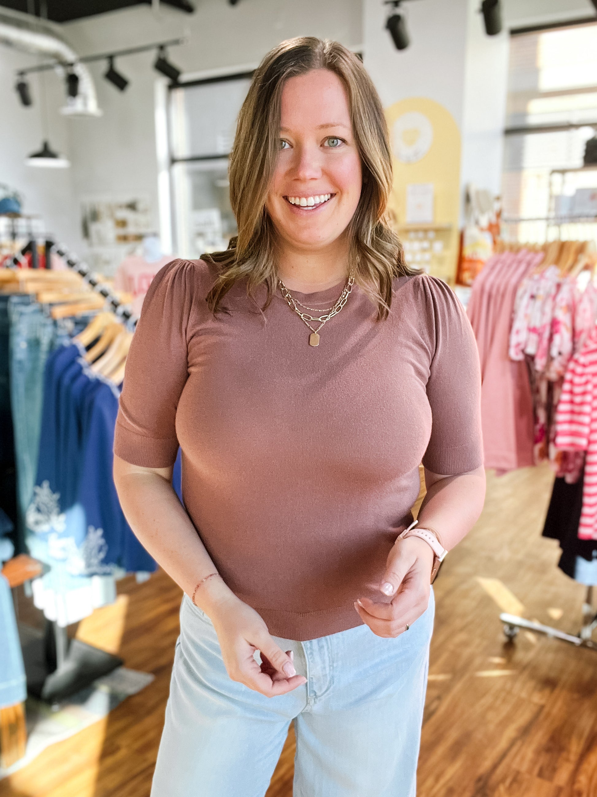 Product Description: A soft shade of brown knit top designed with effortless charm. This short sleeve style features delicate pleated shoulder detailing that adds just the right touch of texture and femininity. Lightweight and comfortable, it’s an easy everyday piece that pairs beautifully with denim, trousers, or skirts for a relaxed yet put-together look.