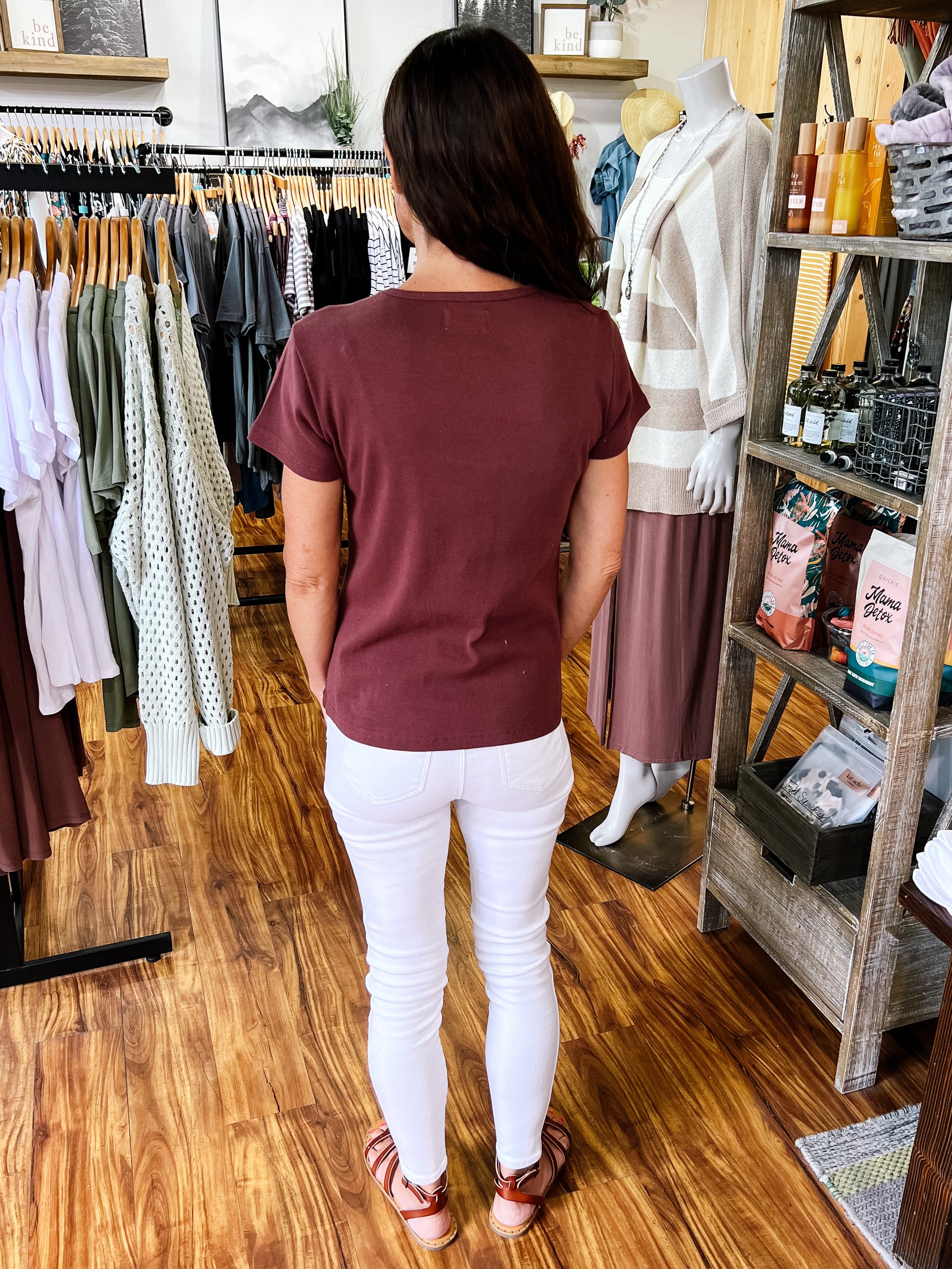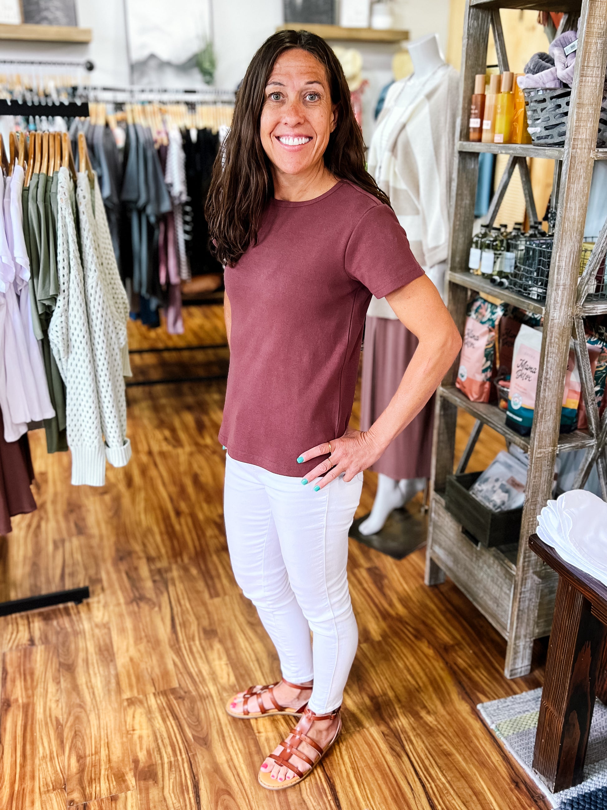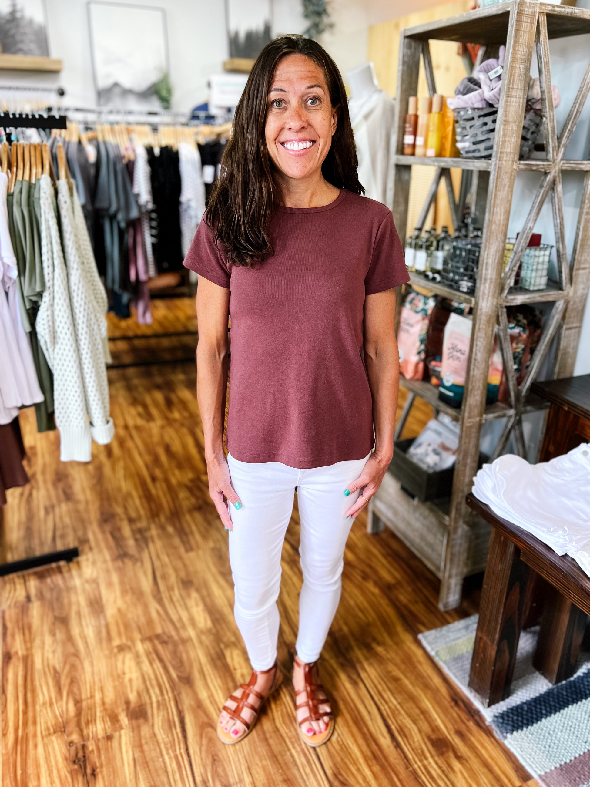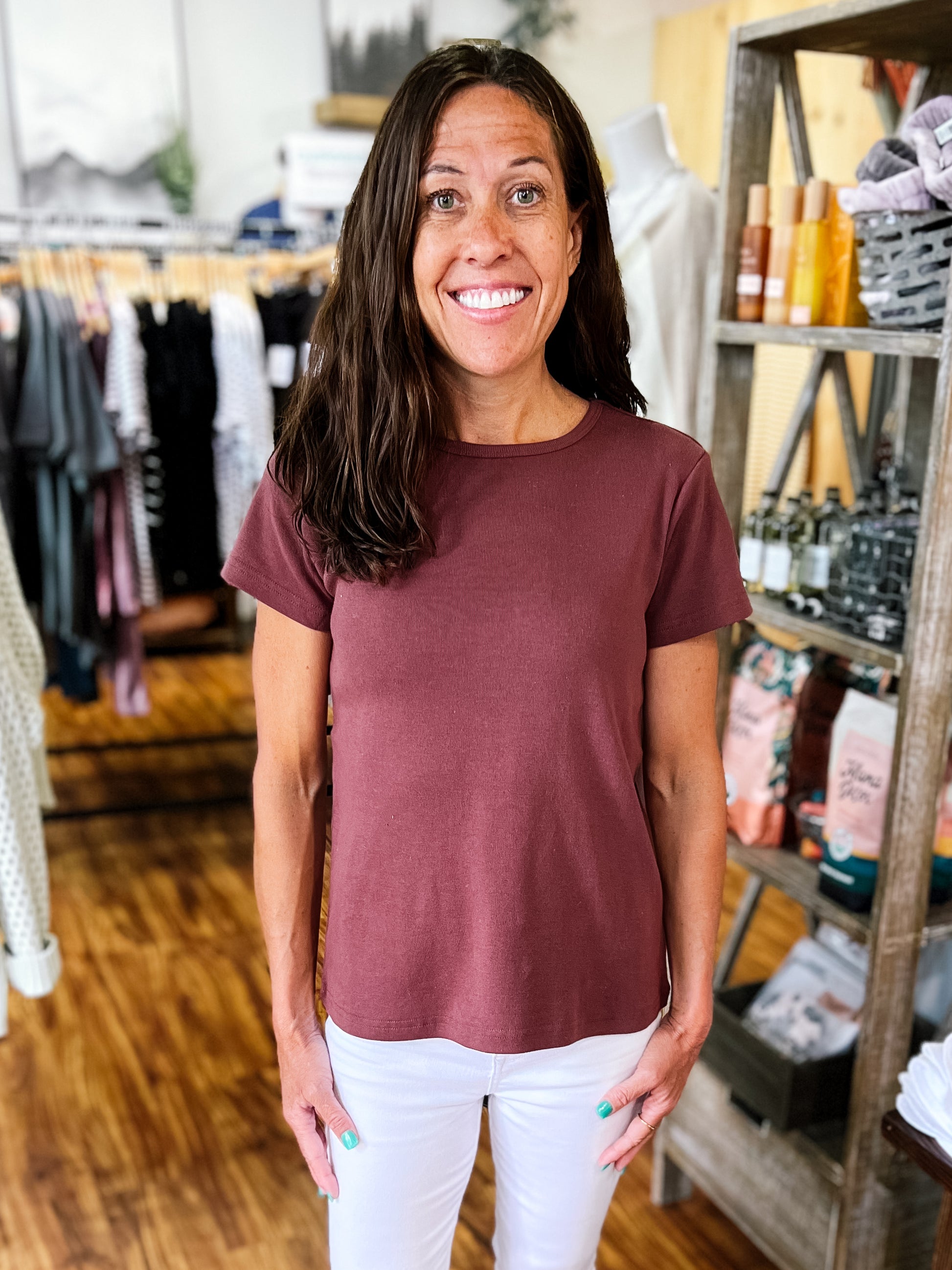 Product Description: A wardrobe essential in a rich chocolate brown, this short sleeve tee features a small ribbed texture for added interest. Designed with a classic round neckline and a soft, stretchy fit, it's perfect for layering or wearing on its own.