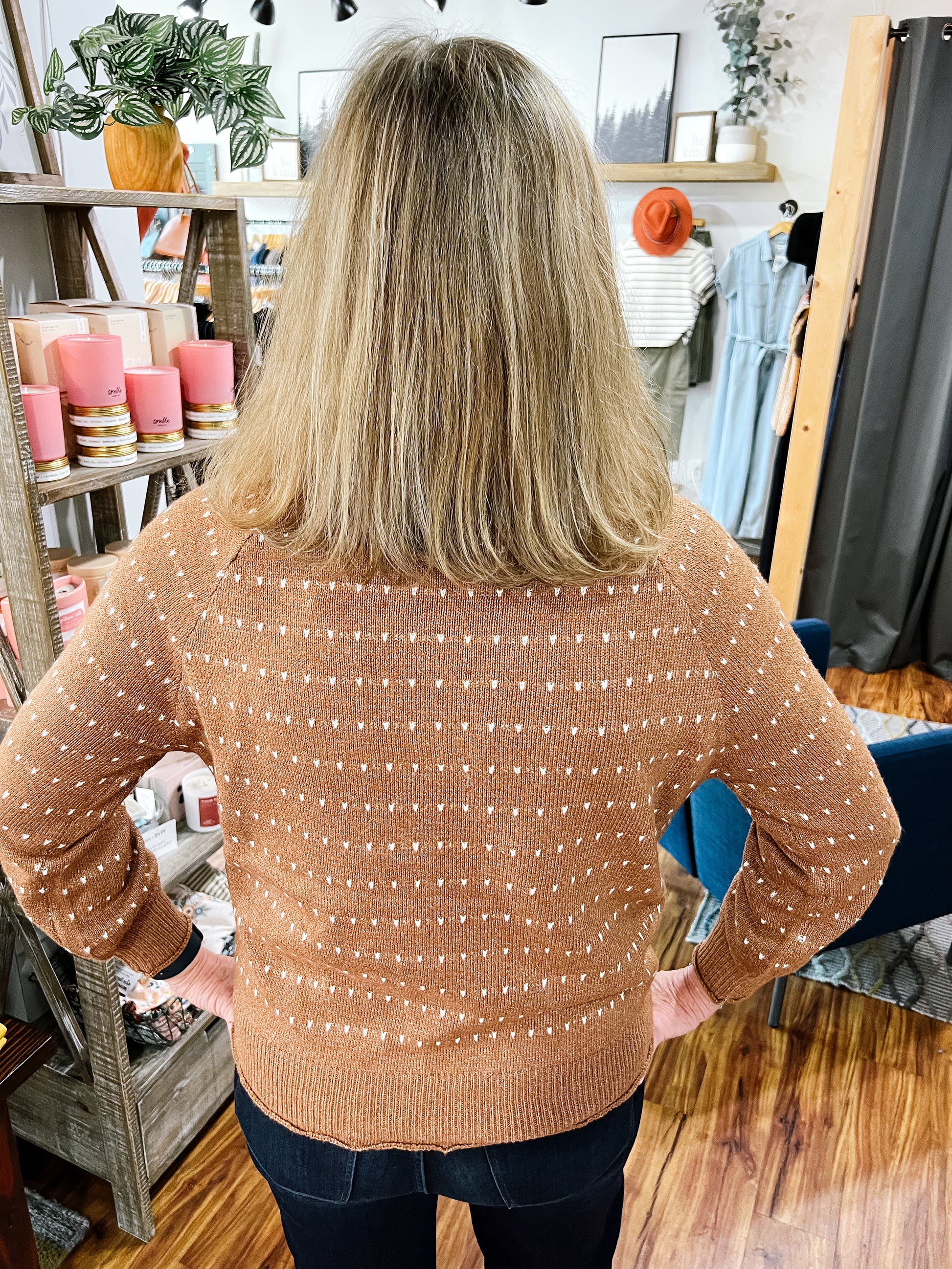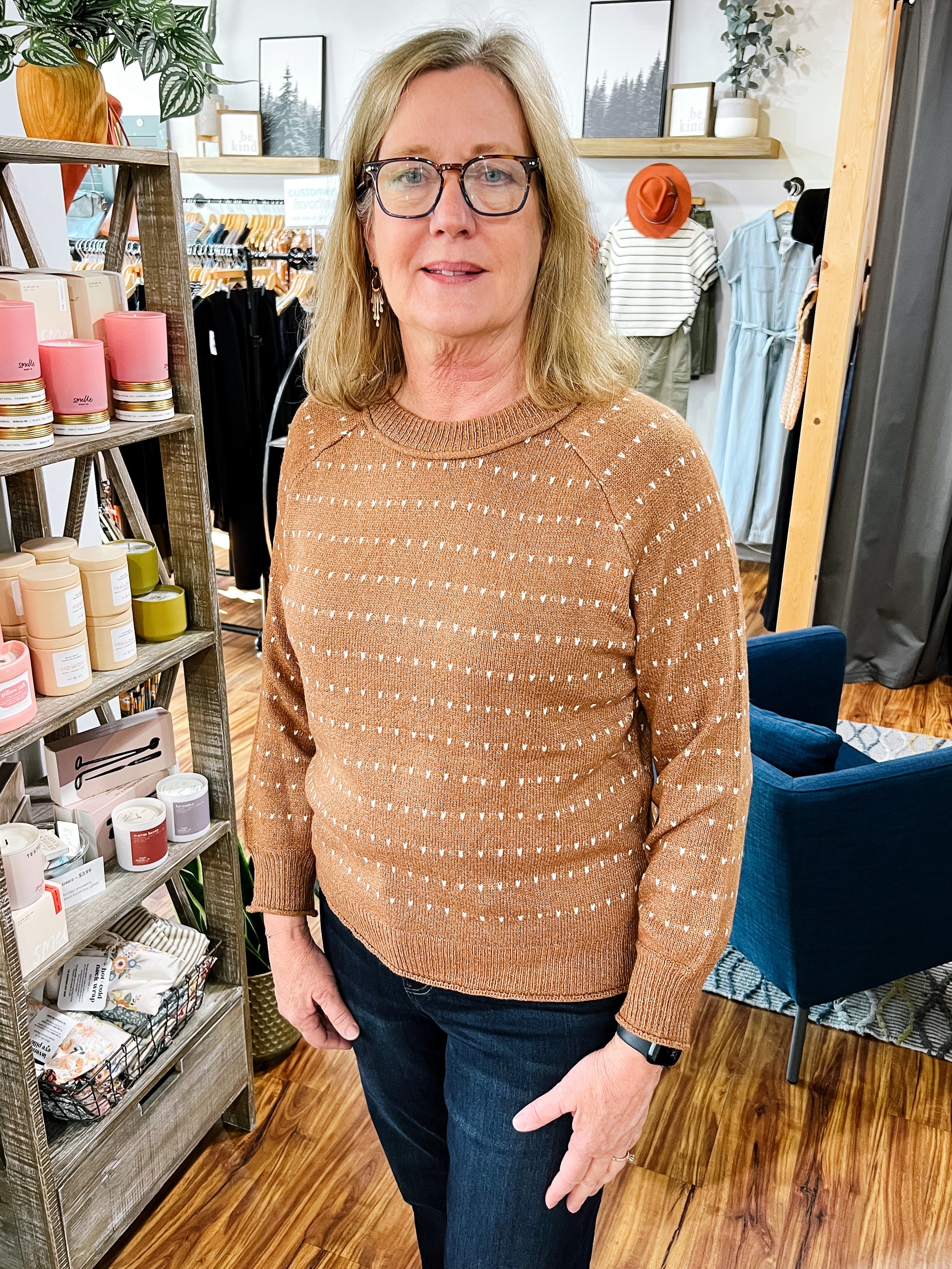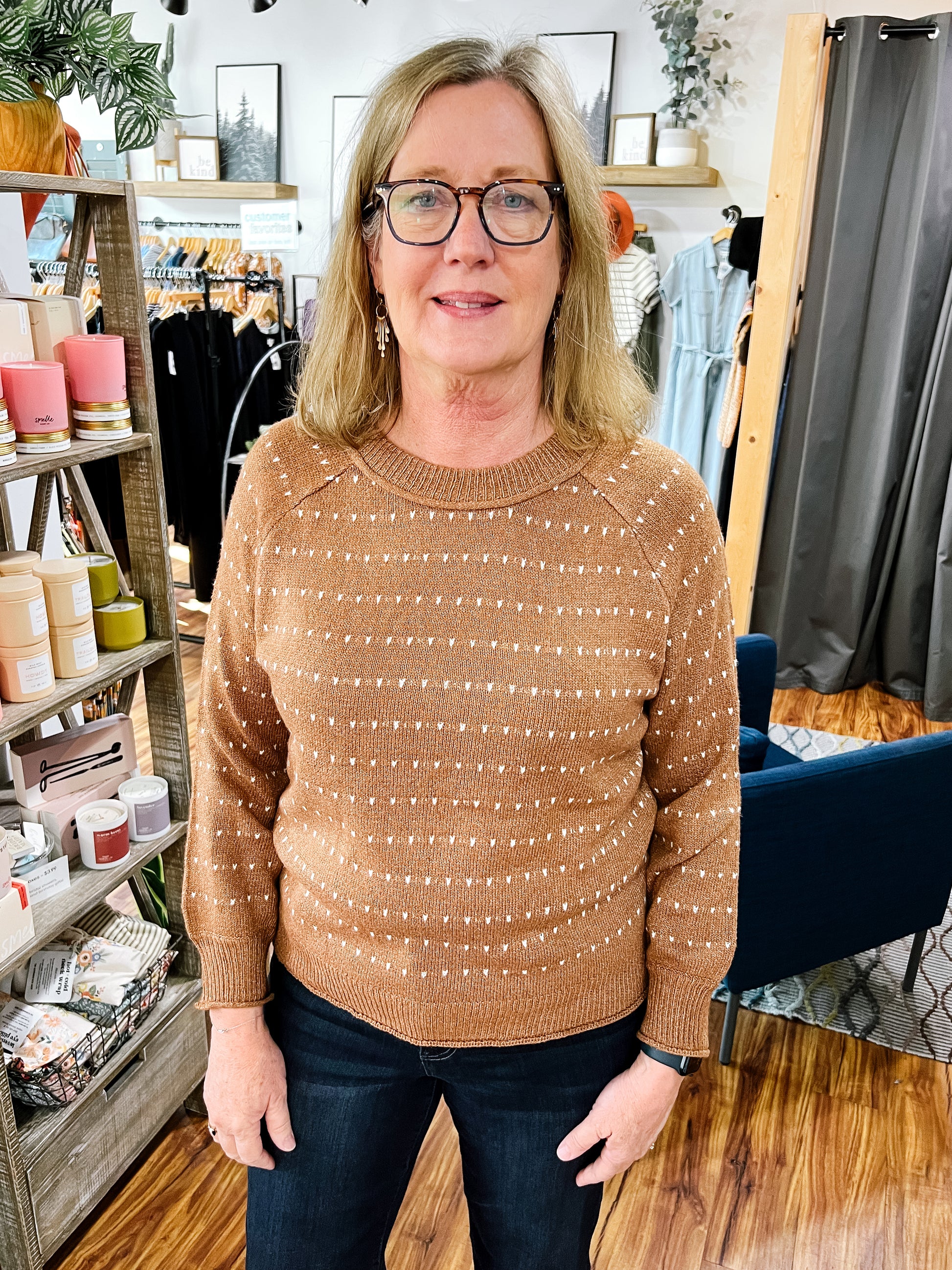 Product Description: Soft and cozy with a classic round neck and long sleeves. Features subtle ivory textured stripes against a warm camel background for a timeless, versatile look. Perfect for layering or wearing on its own.