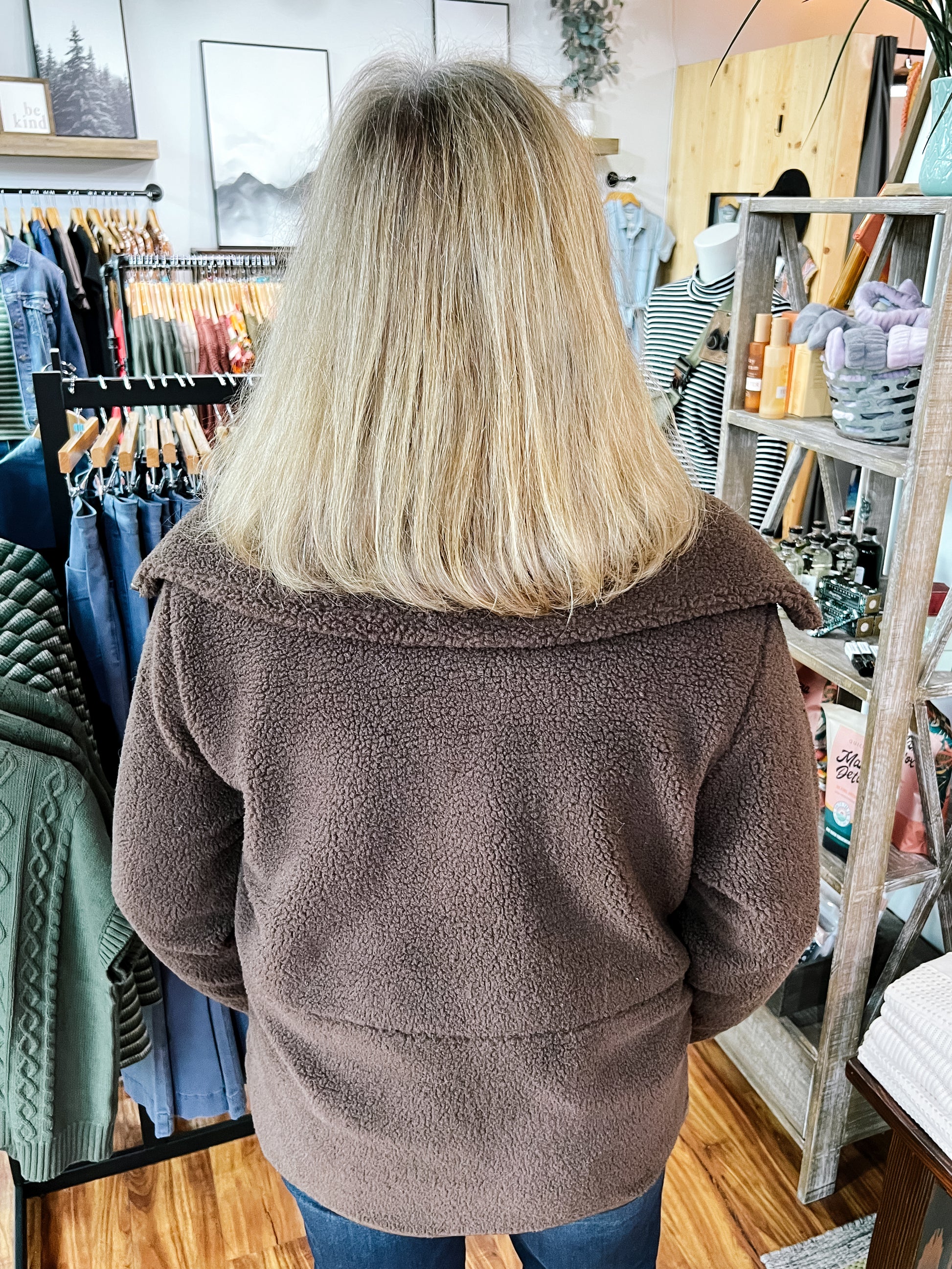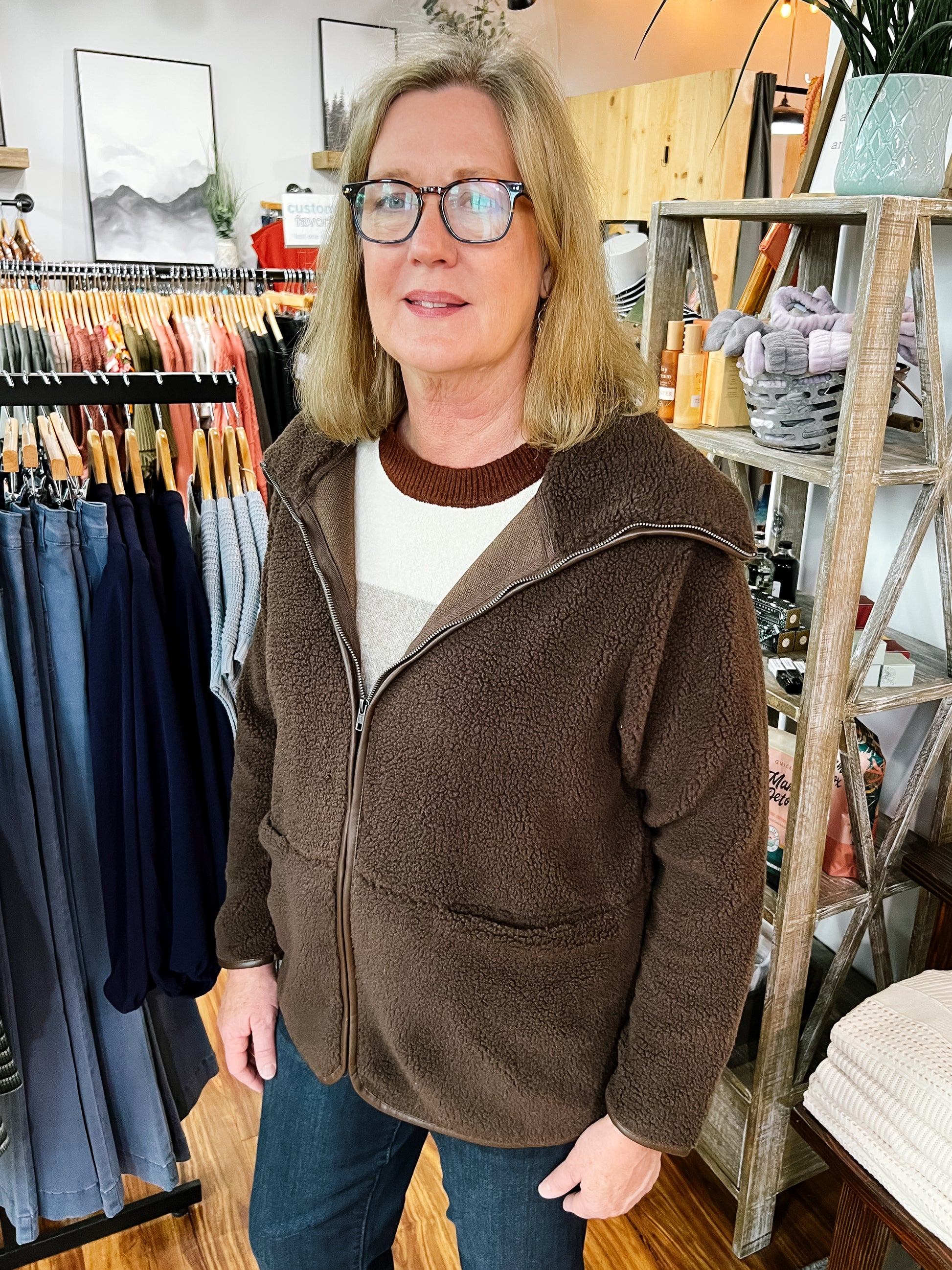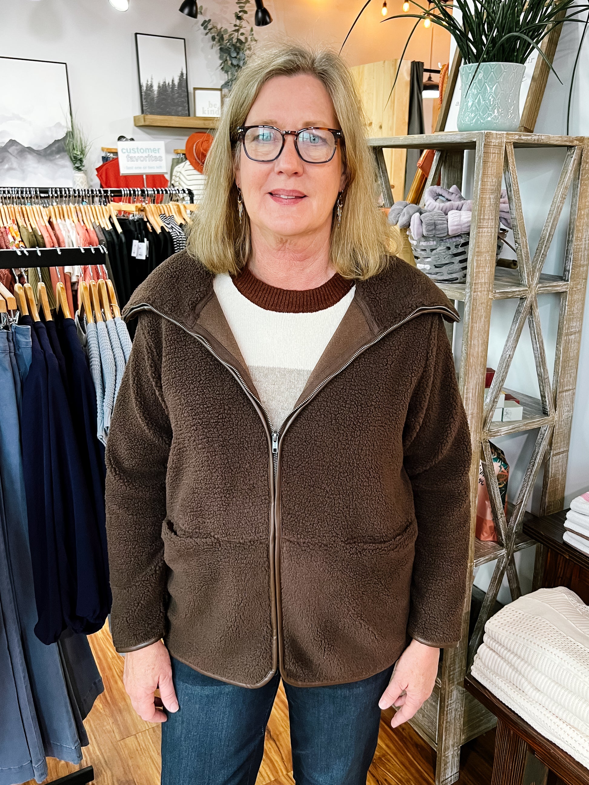 Product Description: Ultra-soft fleece in a rich chocolate brown gives this zip-front jacket its cozy, teddy bear feel. Designed with faux leather trim at the zipper and cuffs for a touch of contrast, it’s the perfect blend of comfort and style for chilly days.