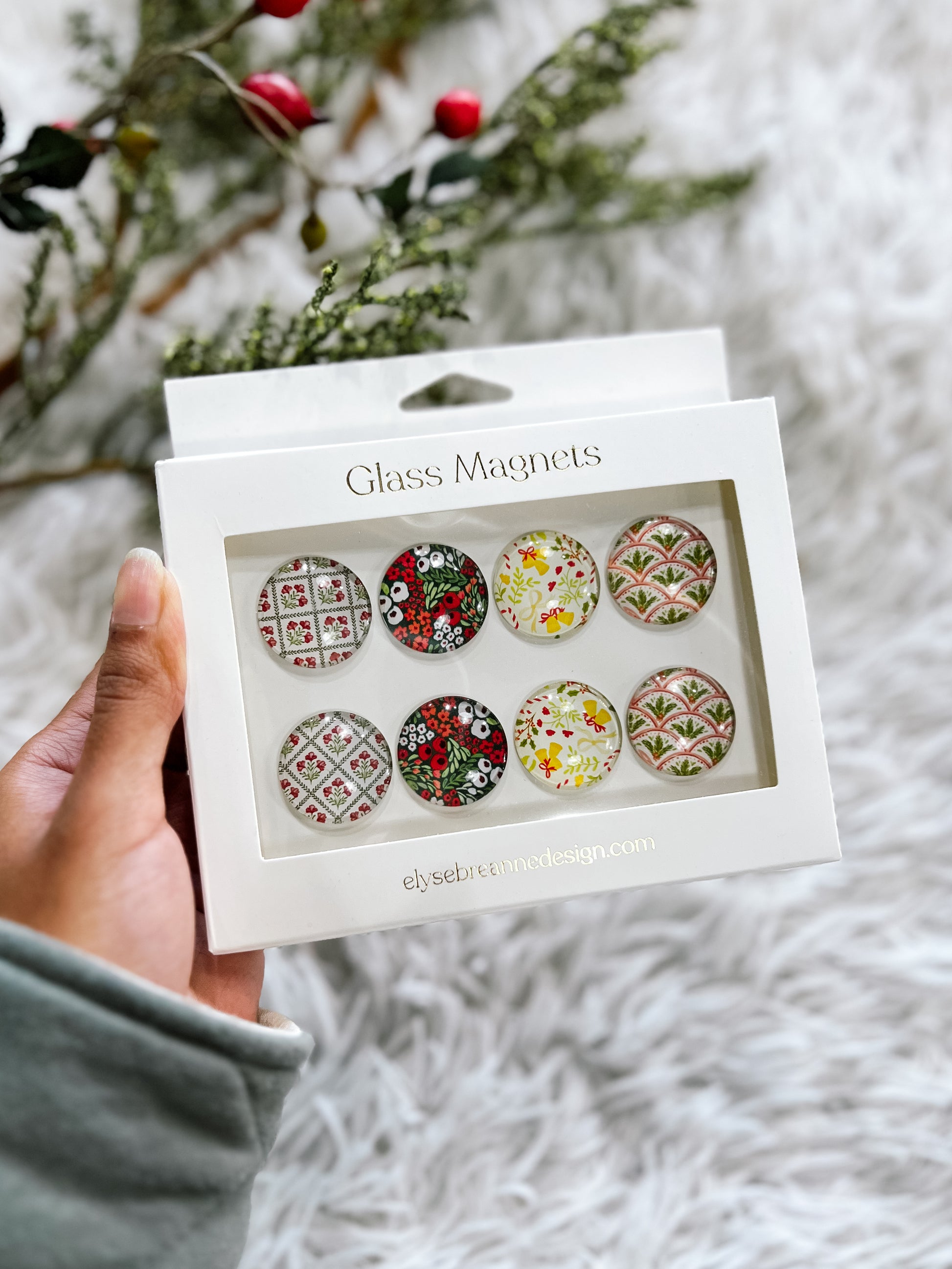 Product Description: This gift-ready set includes eight round glass magnets, featuring holiday patterns that add a touch of charm to any space. Perfect for brightening up your fridge, whiteboard, or magnetic calendar, these sturdy magnets combine function and beauty. Packaged for easy gifting, they make a lovely choice for teachers, coworkers, or anyone who loves a little floral flair in their everyday routine.