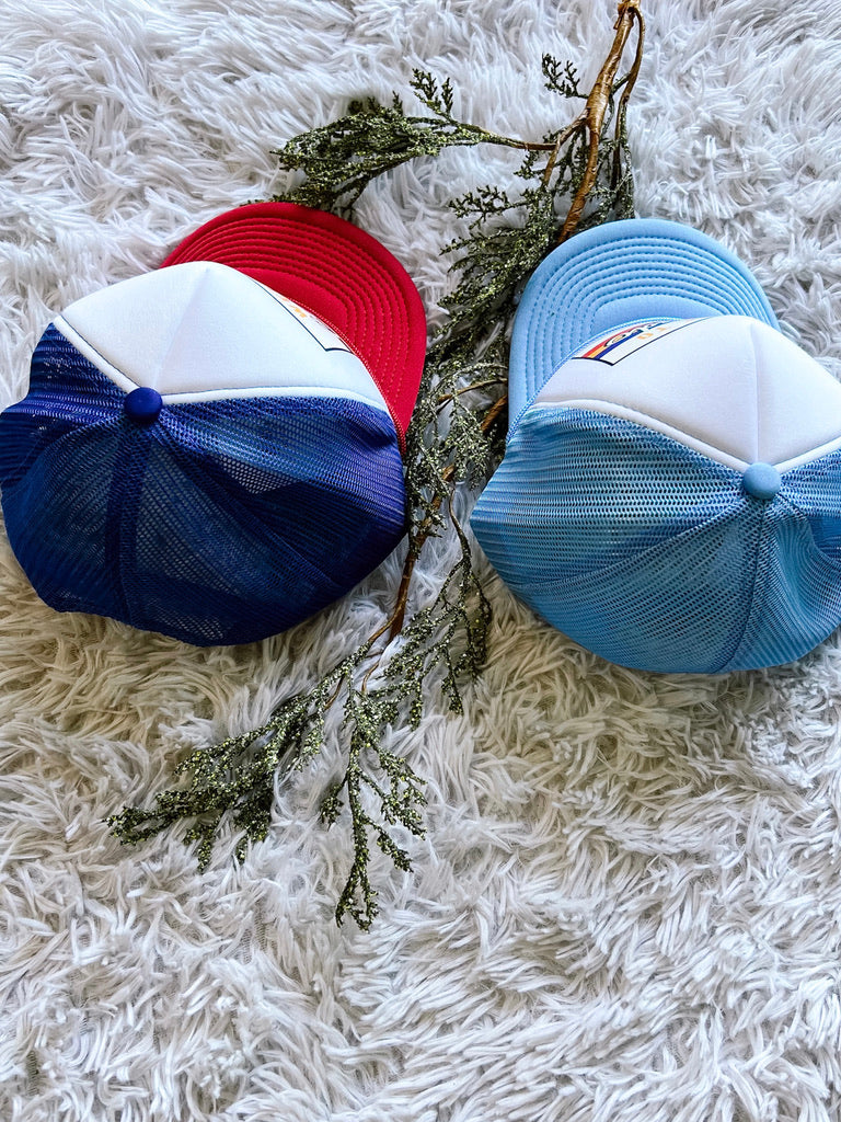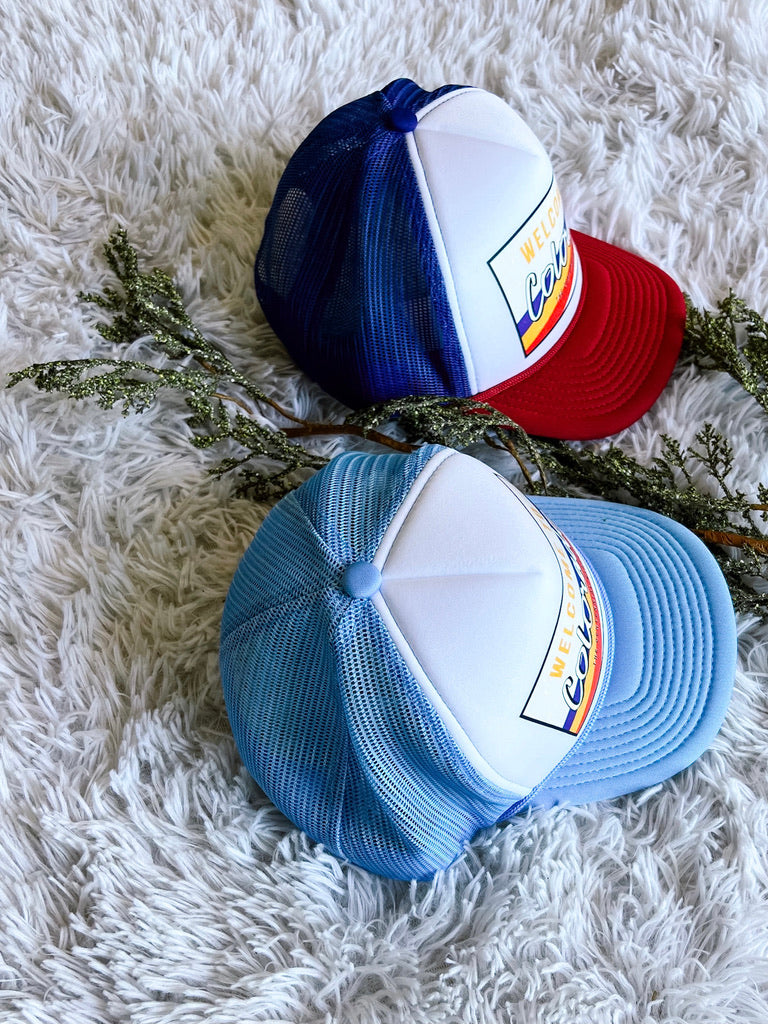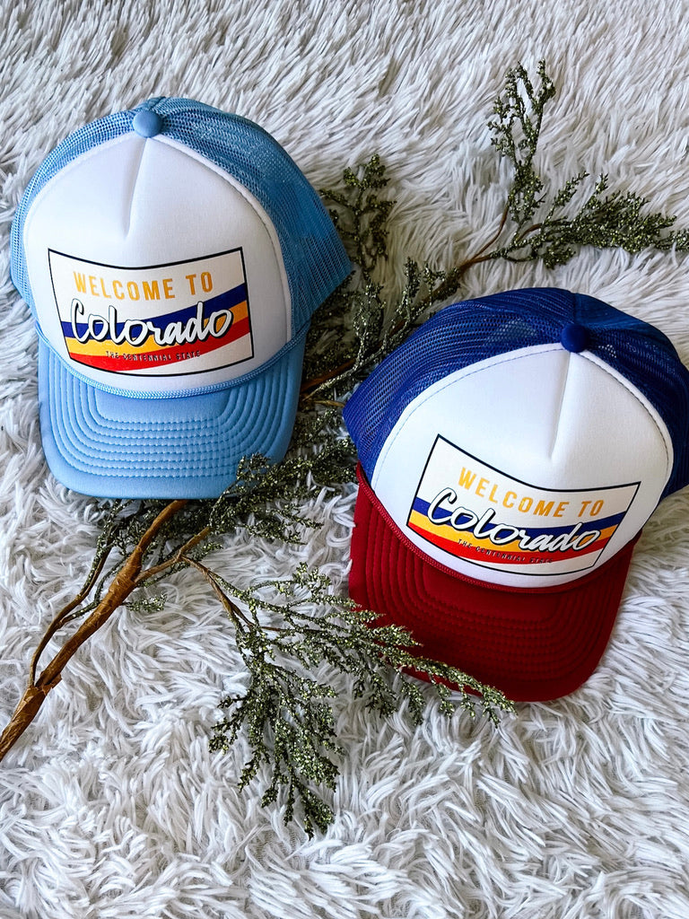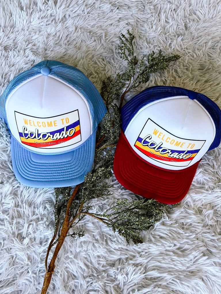 Our new 'Welcome to Colorado' trucker hat is available in two great colors - light blue & white and red, white, and blue! These hats have a soft foam front with a mesh back with adjustable snap and ponytail opening. They have a comfortable fit and beautiful flag inspired/retro artwork on the front.