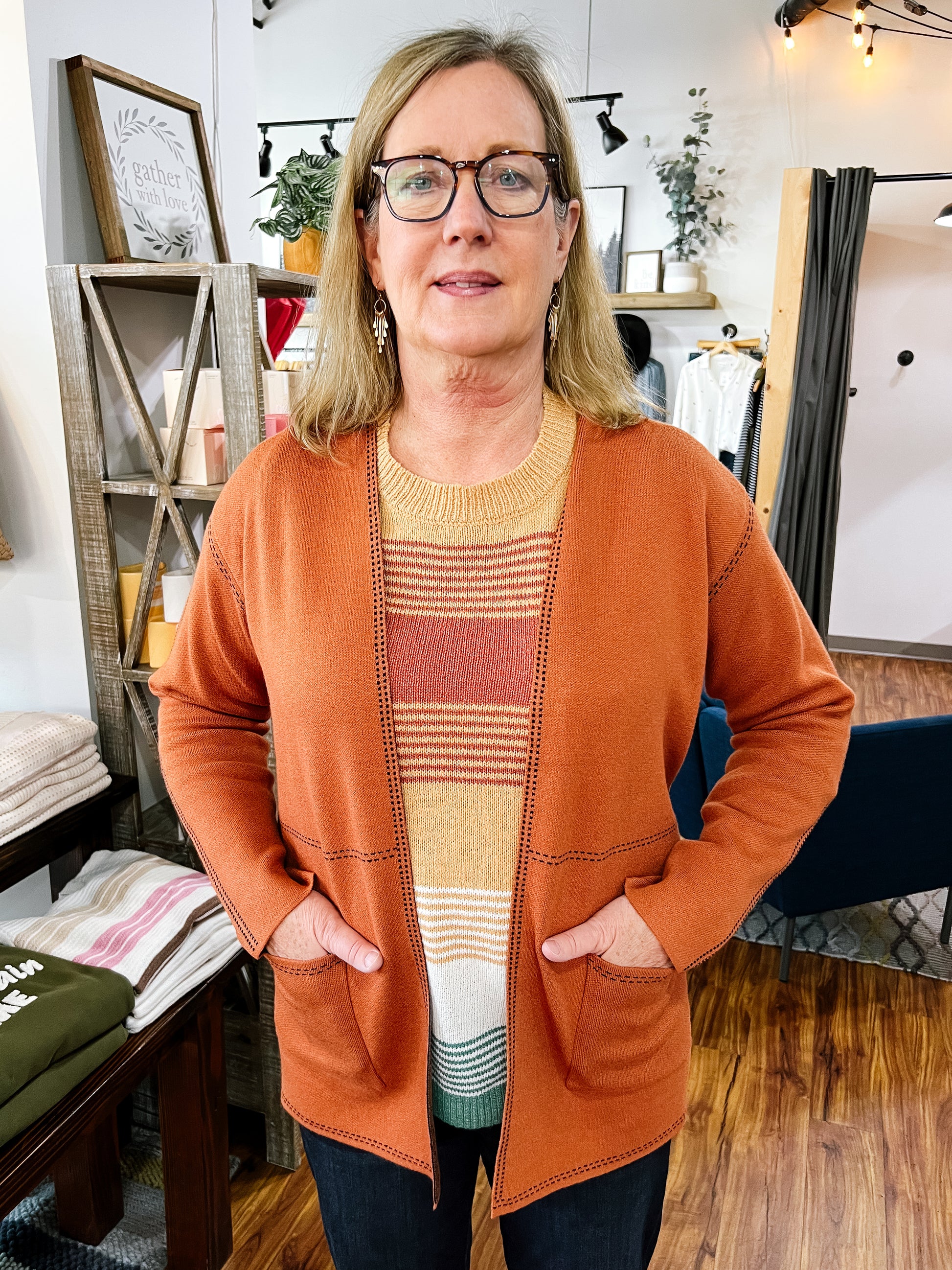 Product Description: A warm rust hue makes this cardigan a fall favorite. Designed with an easy open front, two front pockets for functionality, and finished with black contrast stitching that adds a subtle touch of detail. Perfect for layering over tees, blouses, or sweaters.