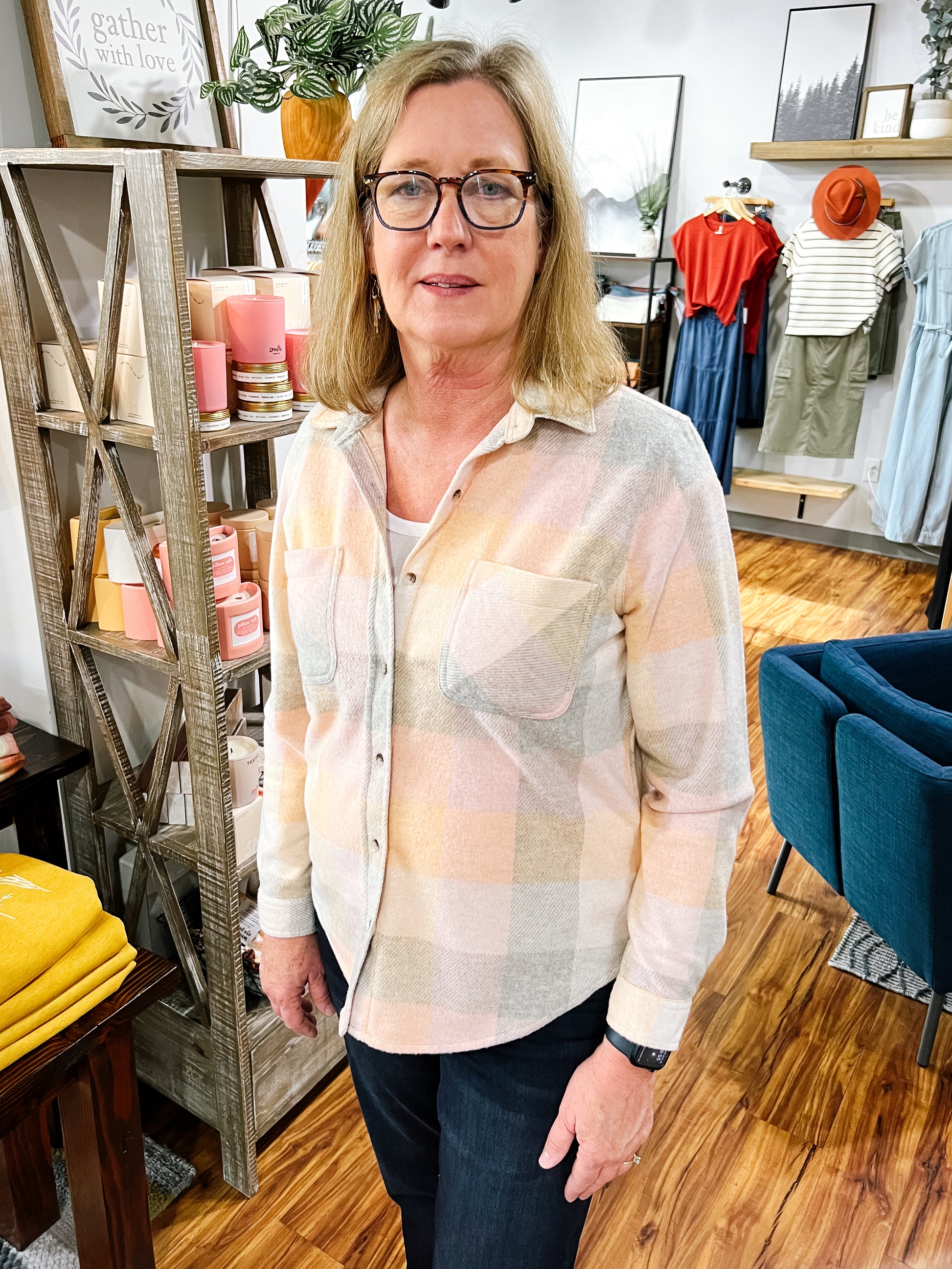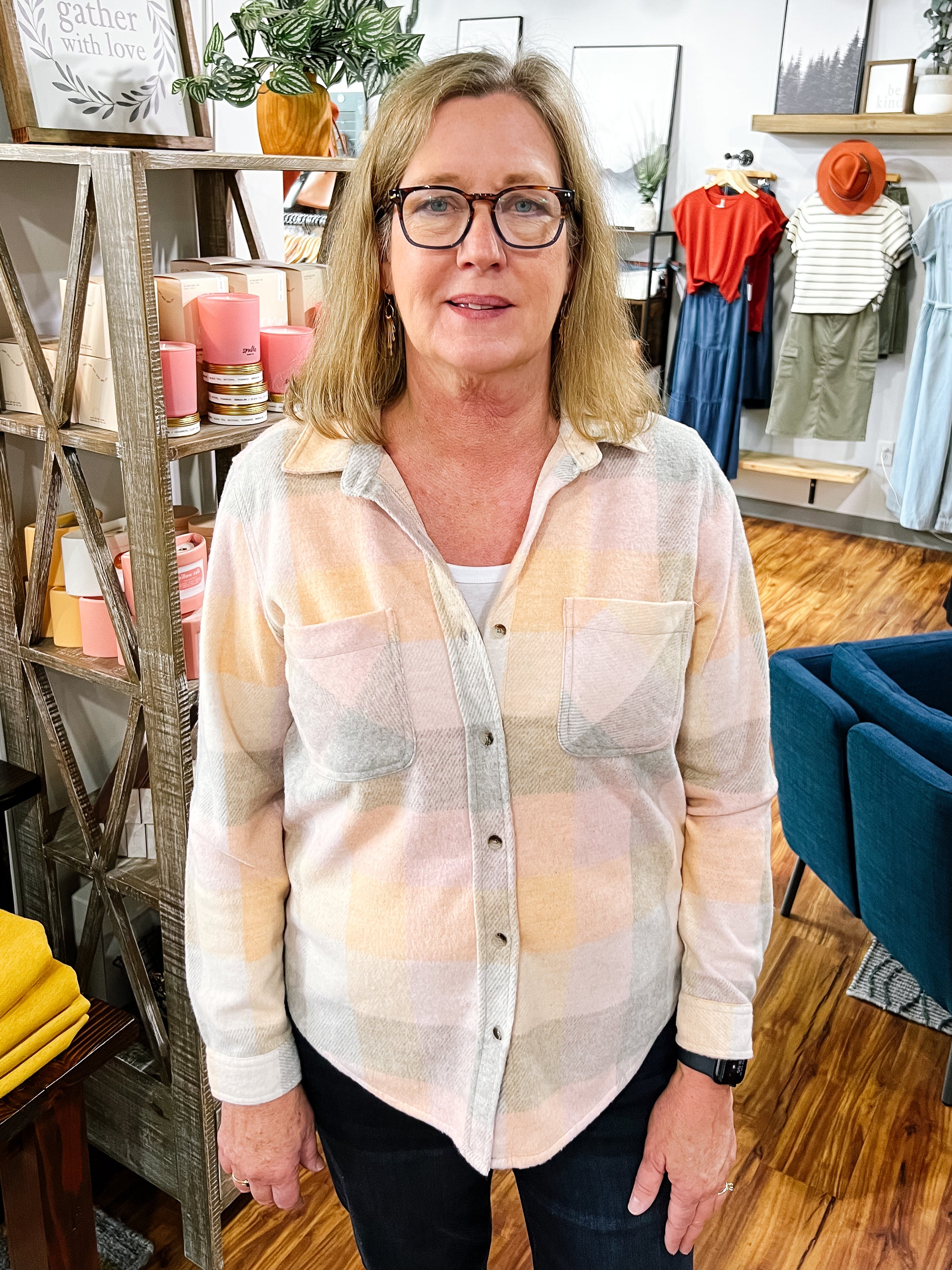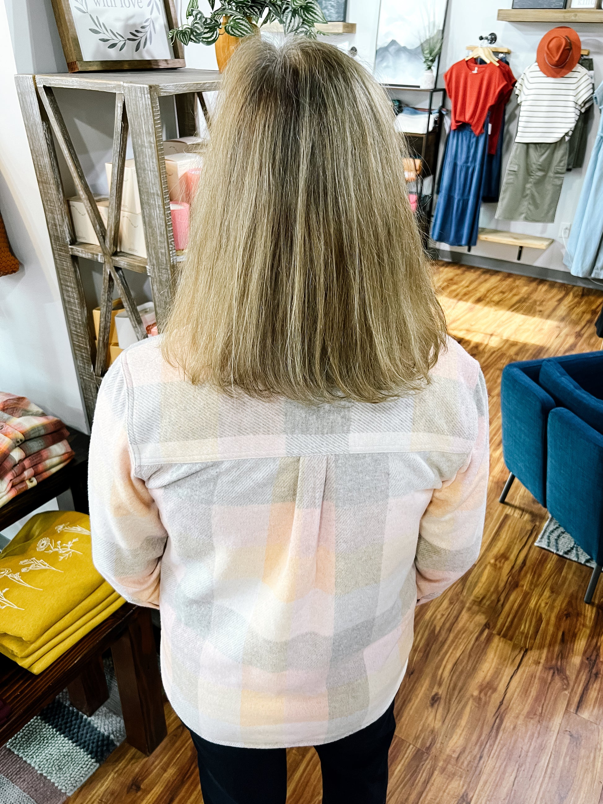 Product Description: This ultra-soft flannel shirt features a coral, pink, and gray plaid design with a classic button-down front. Finished with chest pockets for a timeless touch, it’s the perfect cozy layer for casual days.