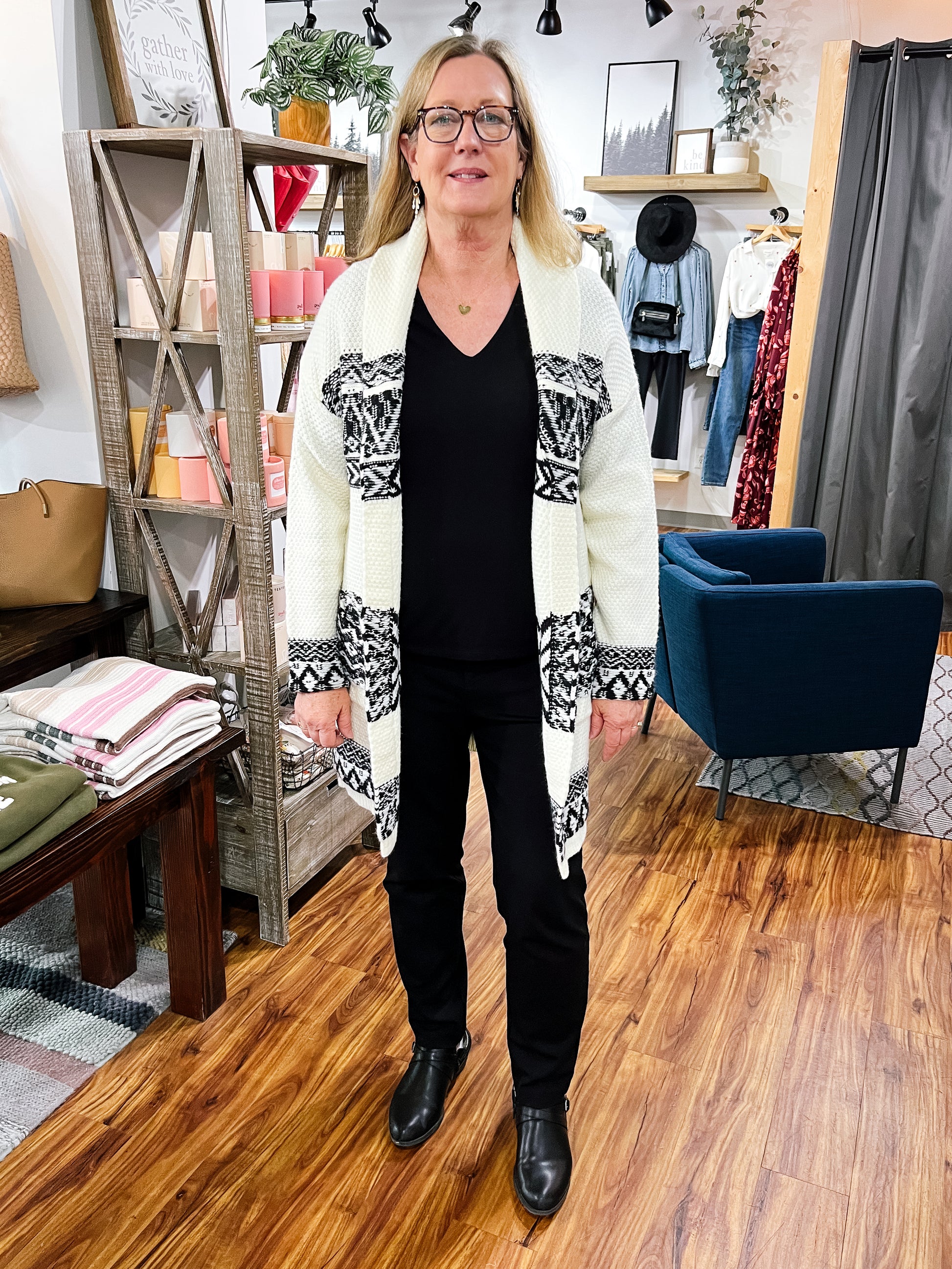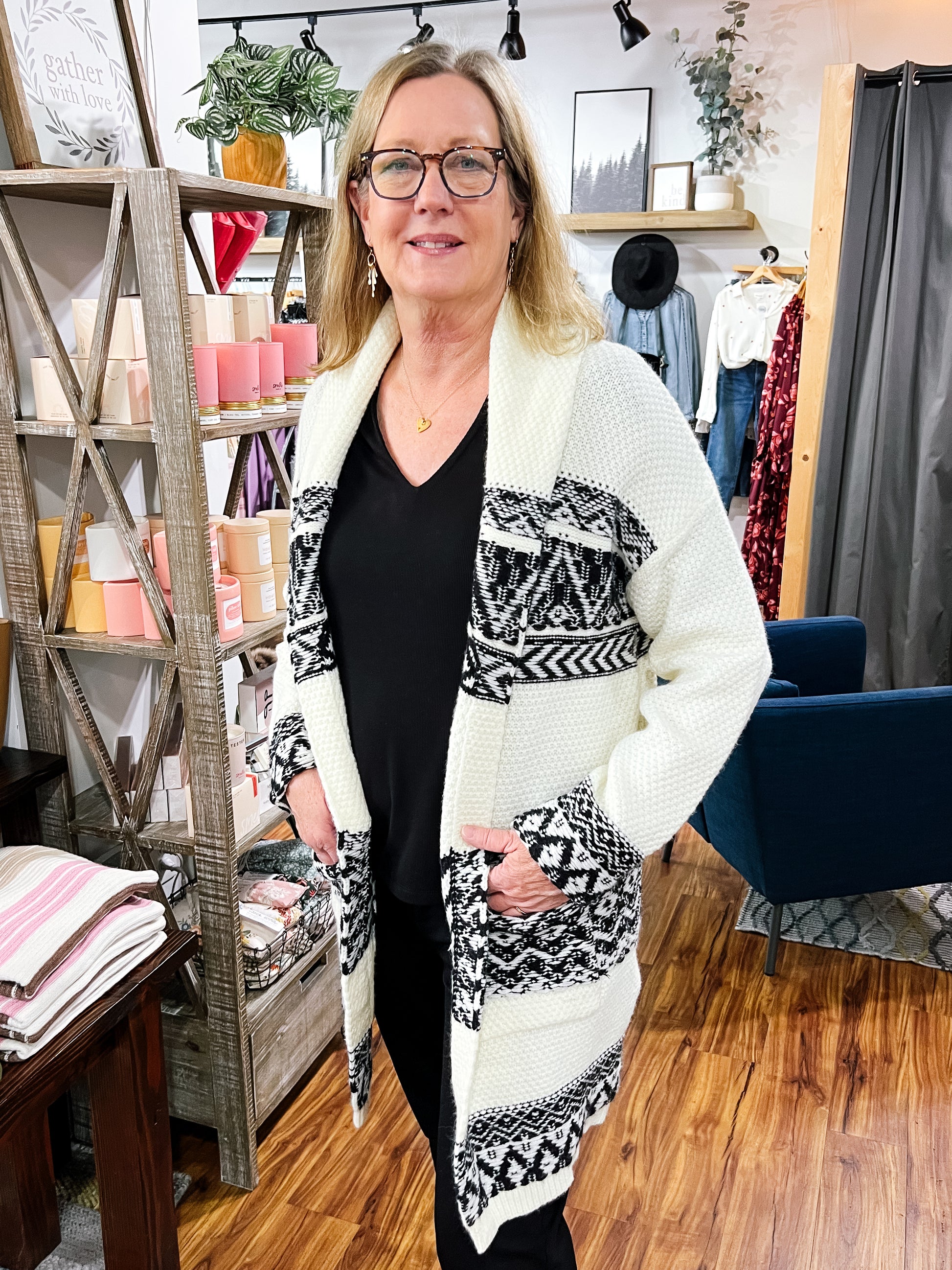 Product Description: A statement layering piece with a cozy feel. Featuring a collared neckline, open-front design, and two front patch pockets, this coatigan blends the comfort of a cardigan with the structure of a coat. The bold black and white Aztec-inspired pattern stands out beautifully against the cream base, making it perfect for cool-weather styling. Hits at the knee.