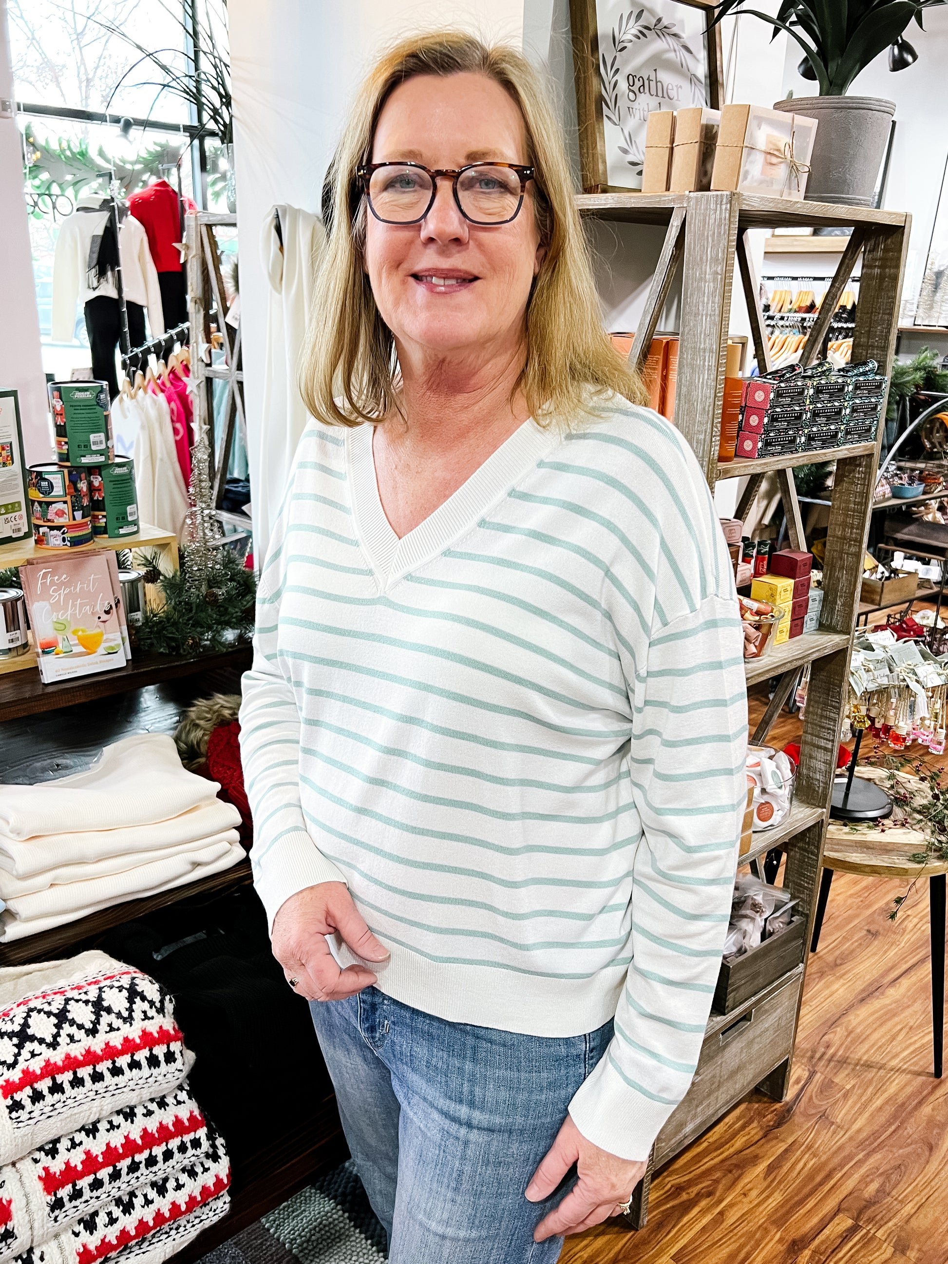 Product Description: A fresh pop of color for everyday wear. This lightweight, ultra-soft sweater features cream and mint green stripes with a classic V-neckline—perfect for a breezy, easygoing look. A comfy layer you’ll reach for from coffee runs to casual days out.