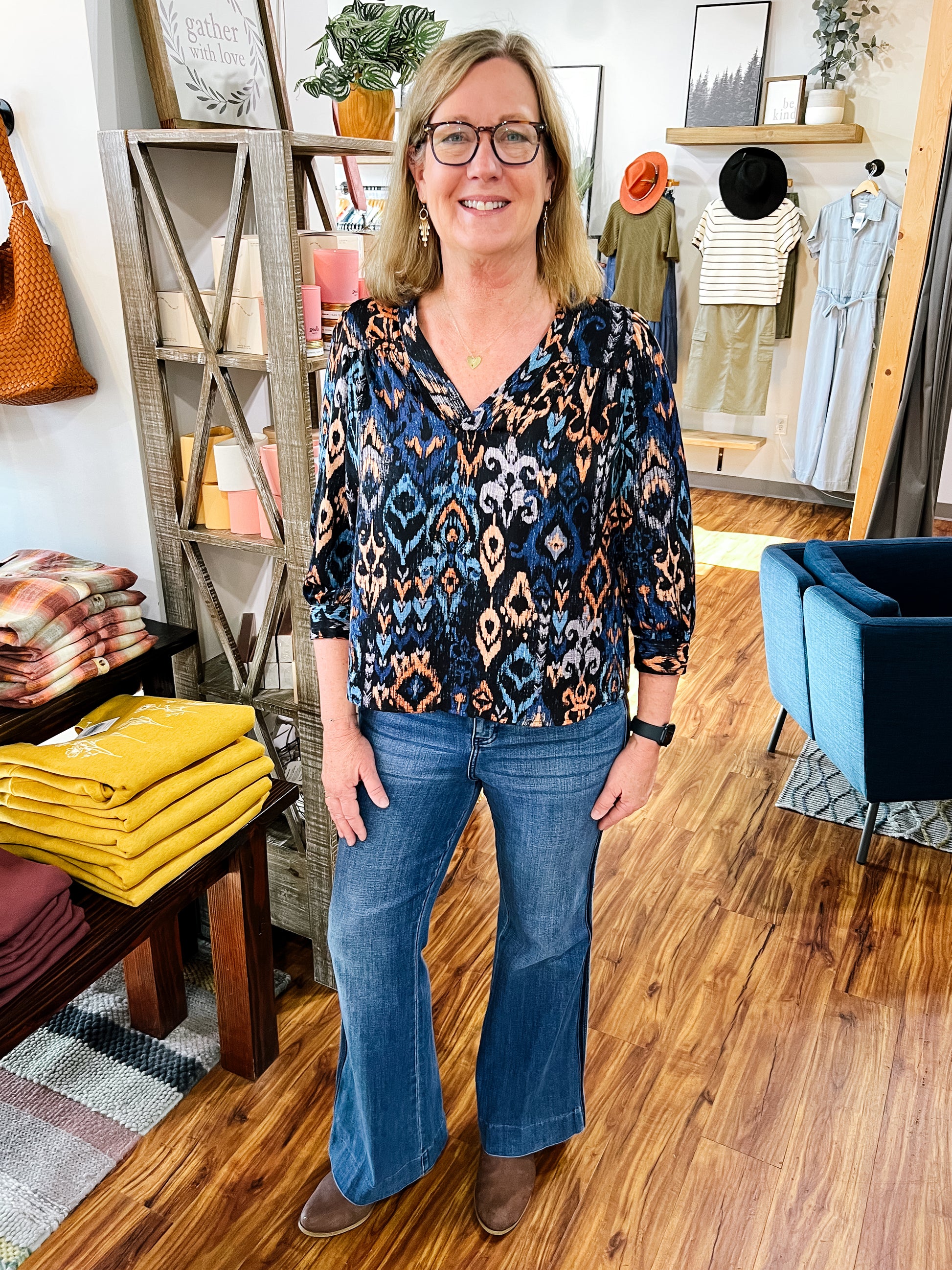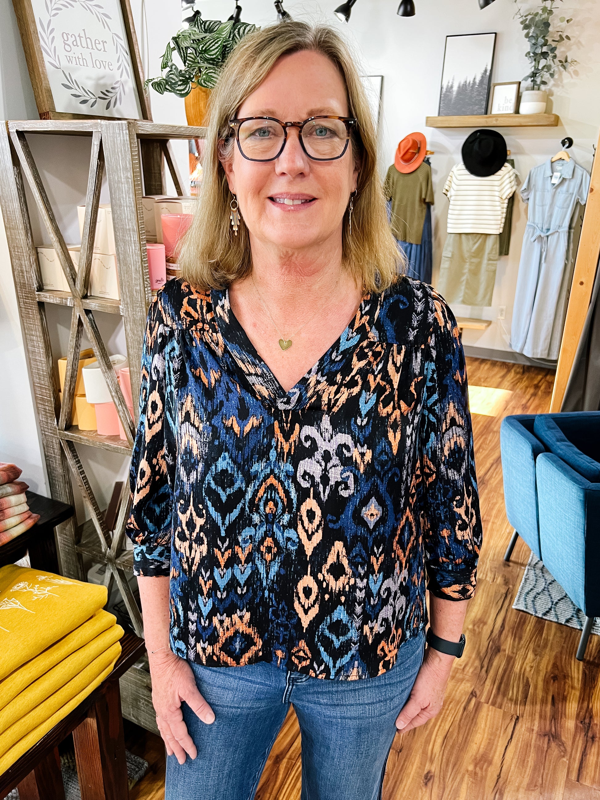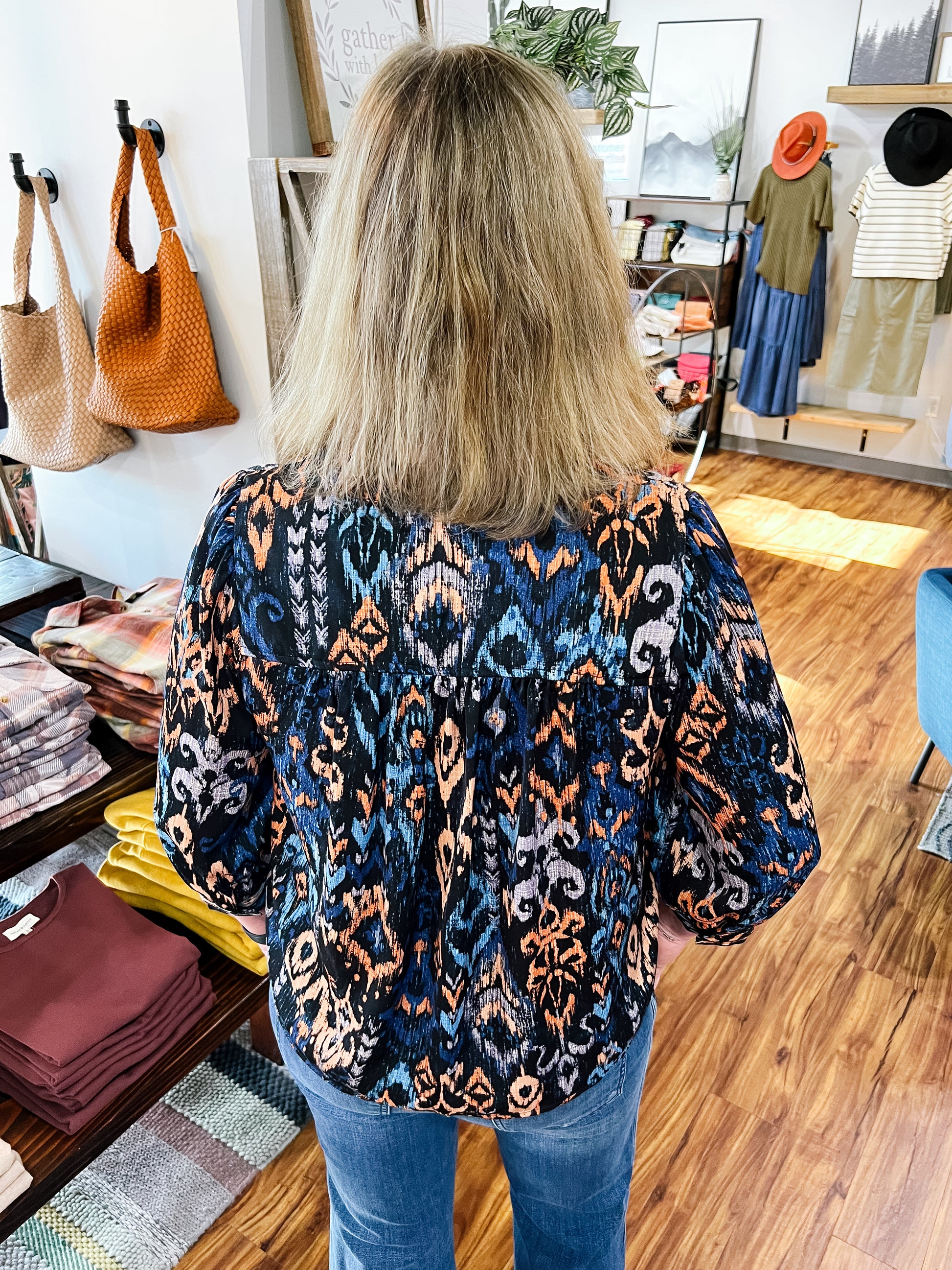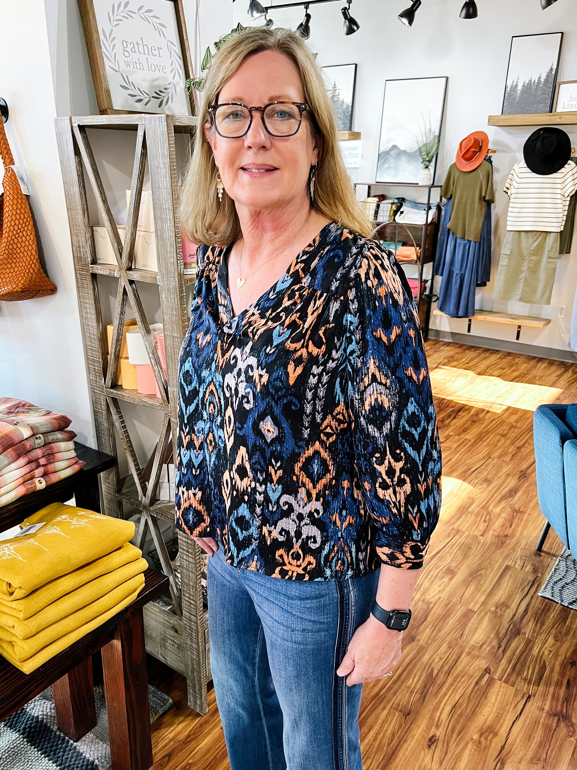 Product Description: This dark navy popover blouse features a rich jacquard print in rust, peach, and blue tones for a striking look. Designed with a flattering v-neckline, 3/4 sleeves, and flowy gathers across the shoulders and back, it drapes beautifully. A versatile blouse that can be dressed up for work or styled casually with denim.