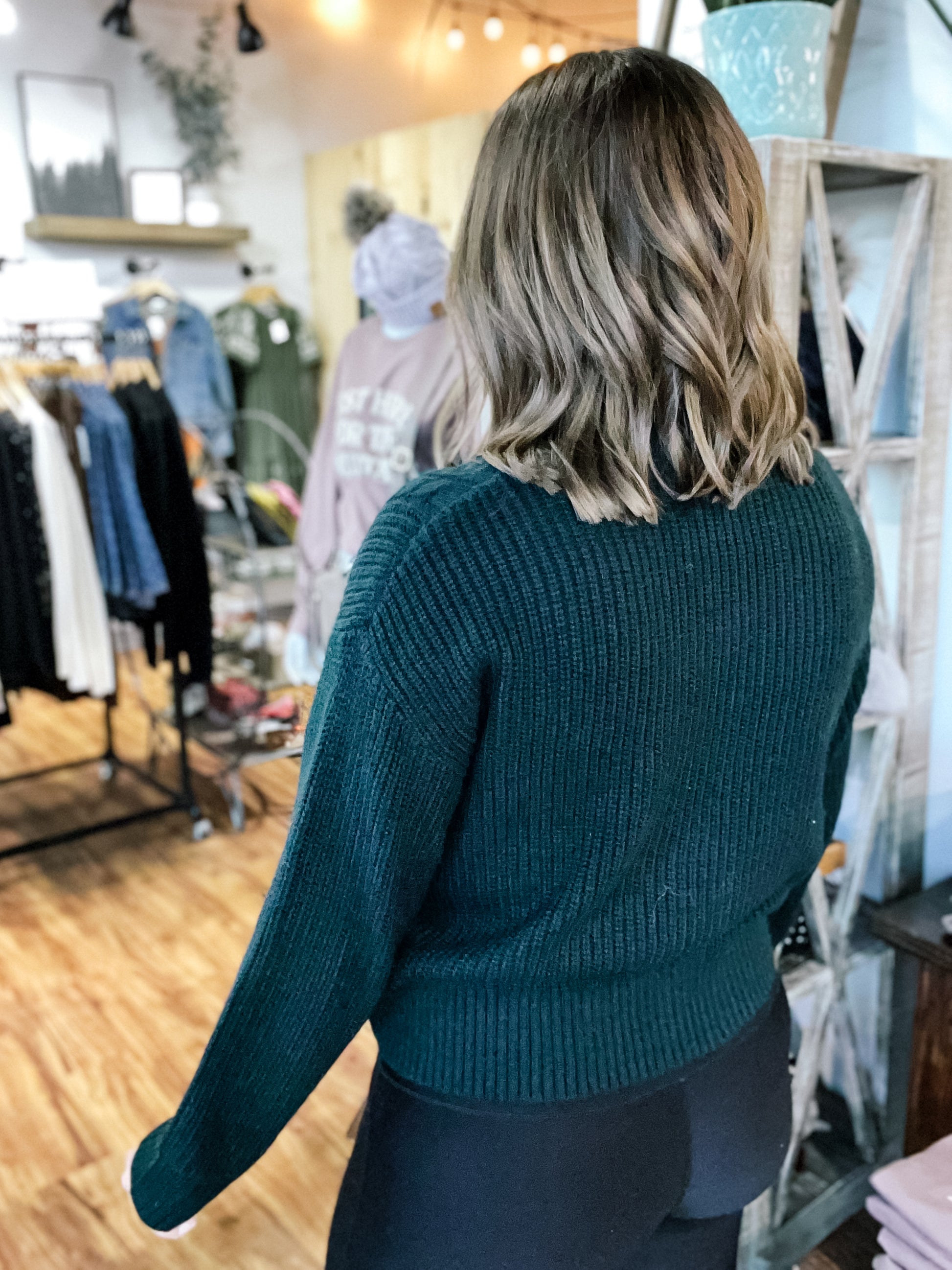 Product Description: Cozy meets classic in this deep teal knit sweater. It features a flattering V-neckline and beautiful cable knit detailing down the front for timeless texture. The slightly shorter length makes it perfect for pairing with high-waisted jeans, skirts, or trousers. Soft, warm, and effortlessly stylish—this sweater is an easy favorite for cool-weather days.