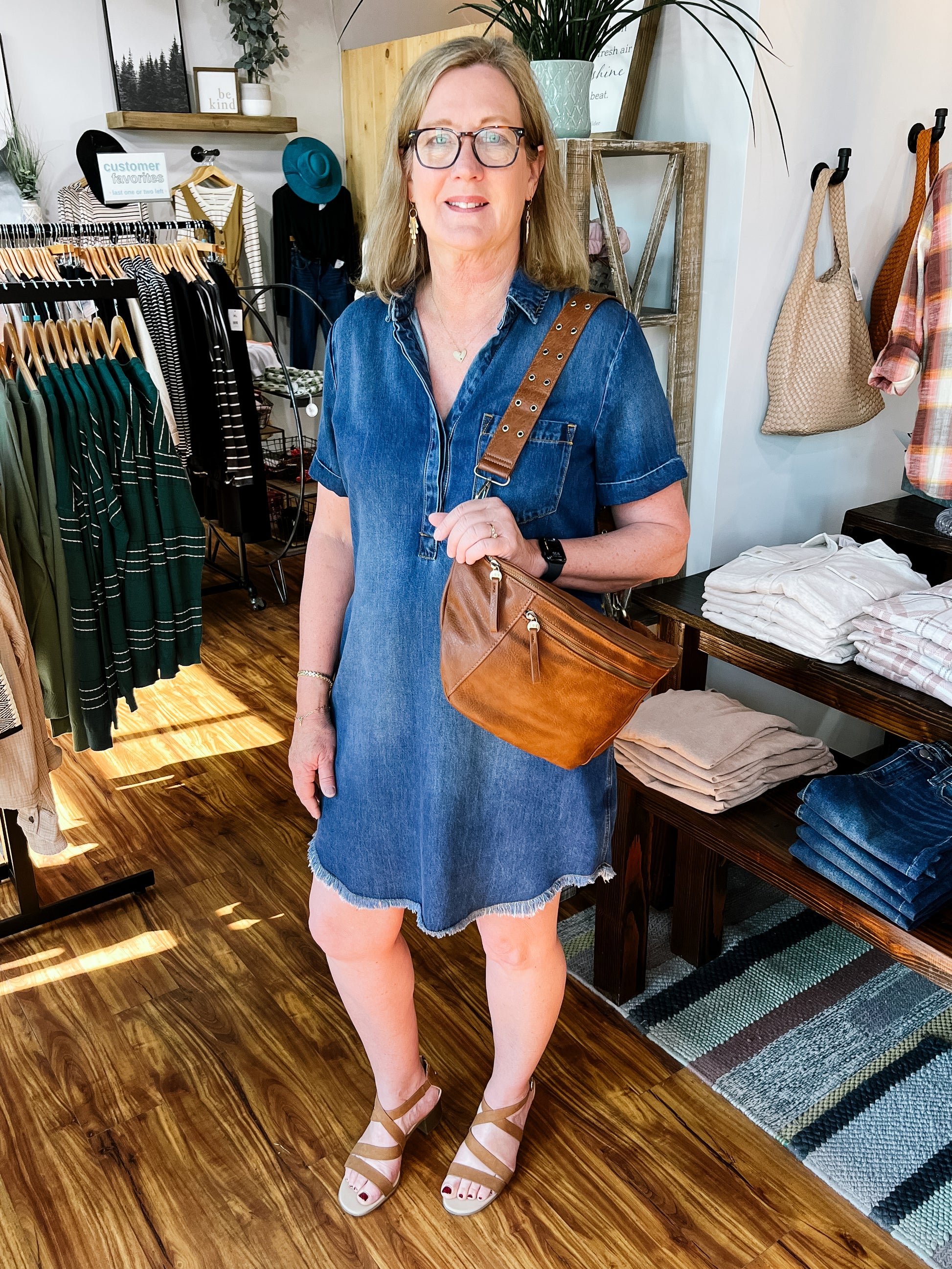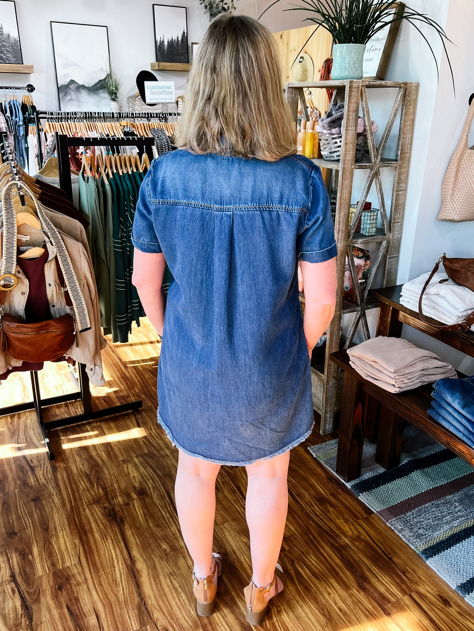 Product Description: This medium wash denim popover shirt dress is an easy everyday piece with classic charm. It features a raw edge hem, rolled short sleeves, a 3/4 button closure, and one breast pocket. Side pockets and classic gold stitching add both function and timeless denim style. Wear it solo or layer it with leggings and a jacket as the seasons shift.