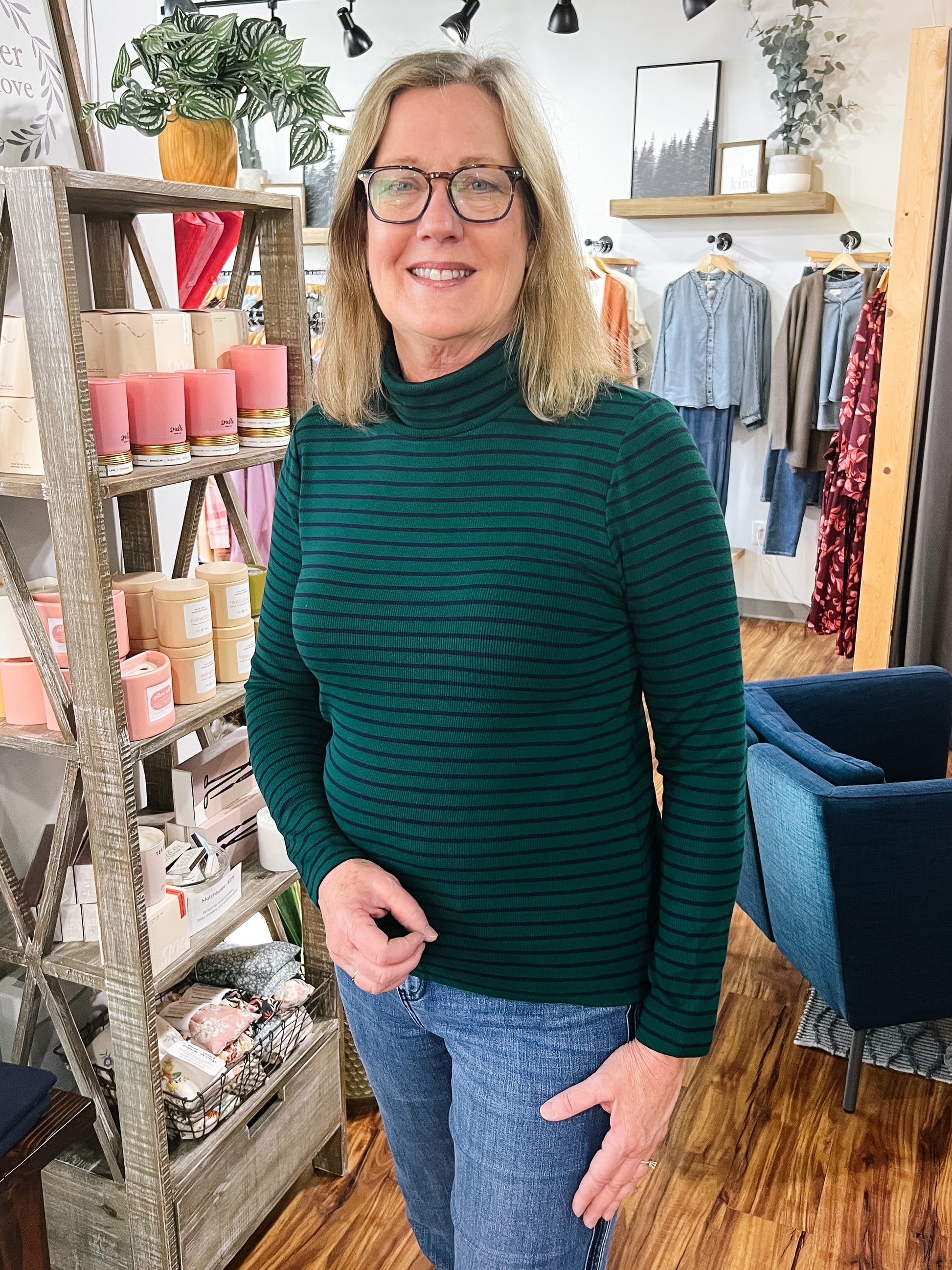 Product Description: This green turtleneck sweater with navy striping is a cozy classic with a modern touch. Designed with just the right amount of stretch, it offers all-day comfort while keeping its shape. Easy to pair with denim or trousers, it’s a versatile piece for cooler days.