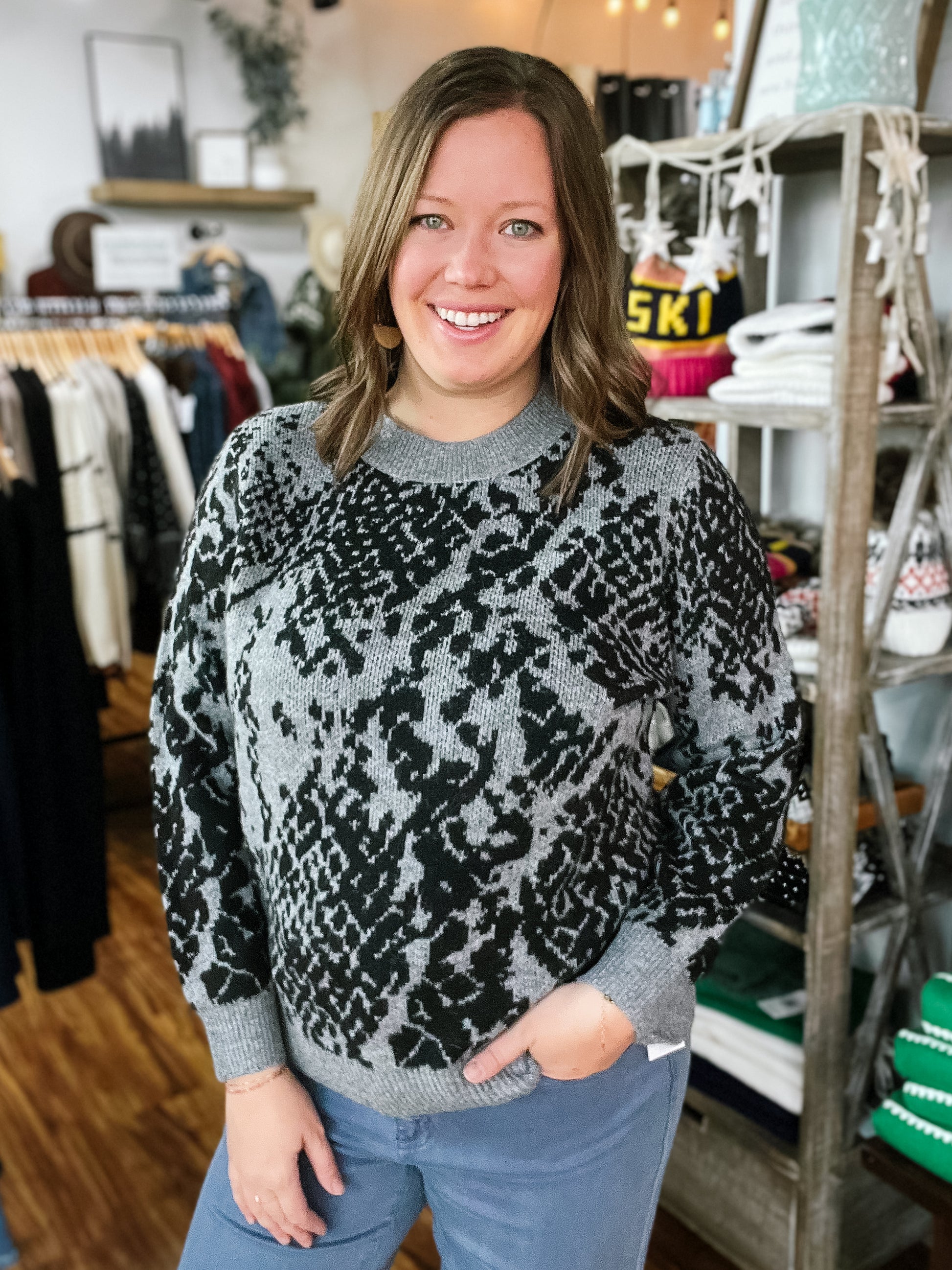 Product Description: This gray sweater features a bold black pattern that makes a chic statement while keeping things cozy. The ribbed waistband and cuffs give it a polished fit, and its versatile style makes it easy to dress up for holiday parties with trousers or a skirt. A stylish way to stay warm and festive all season long.