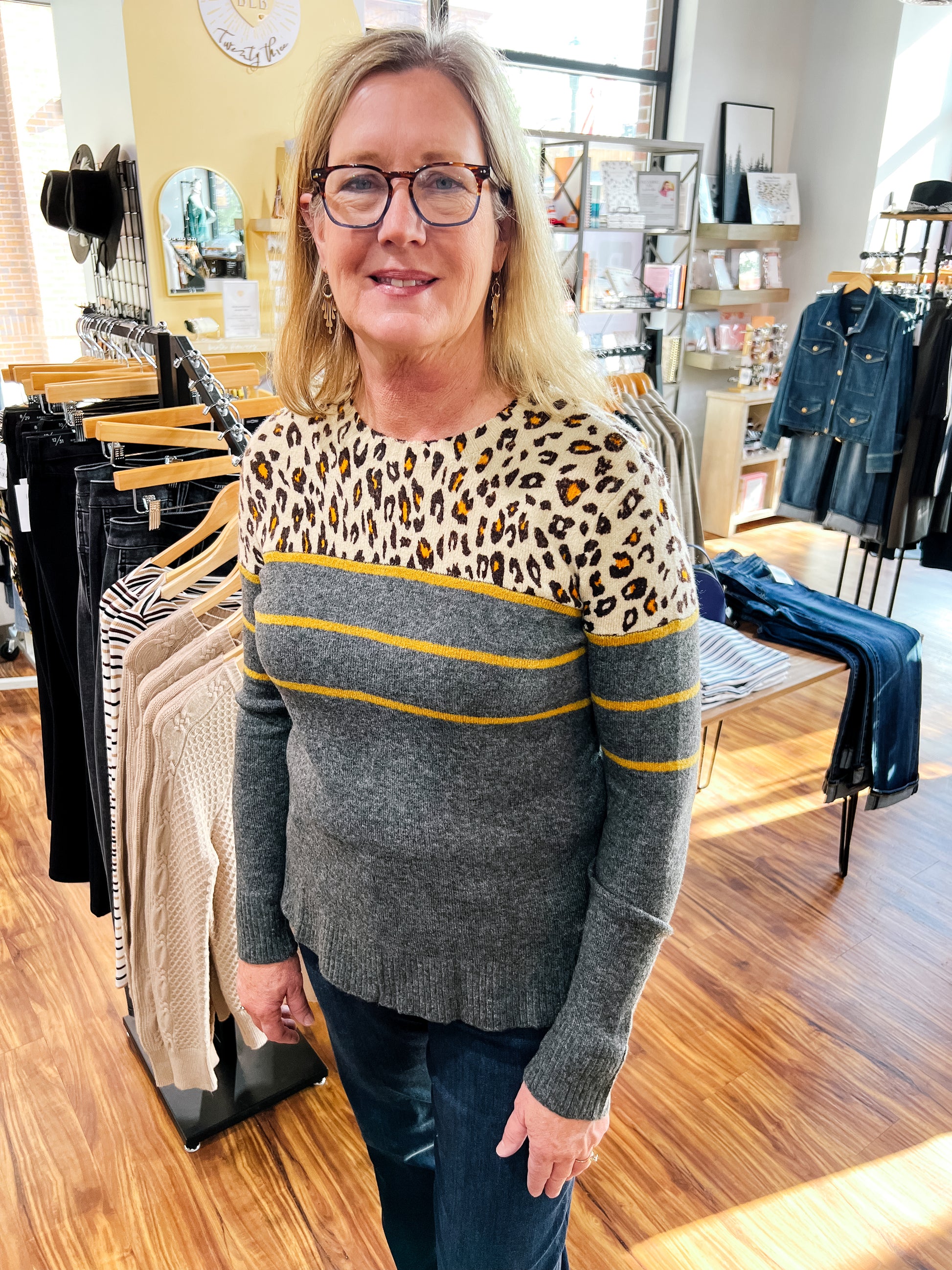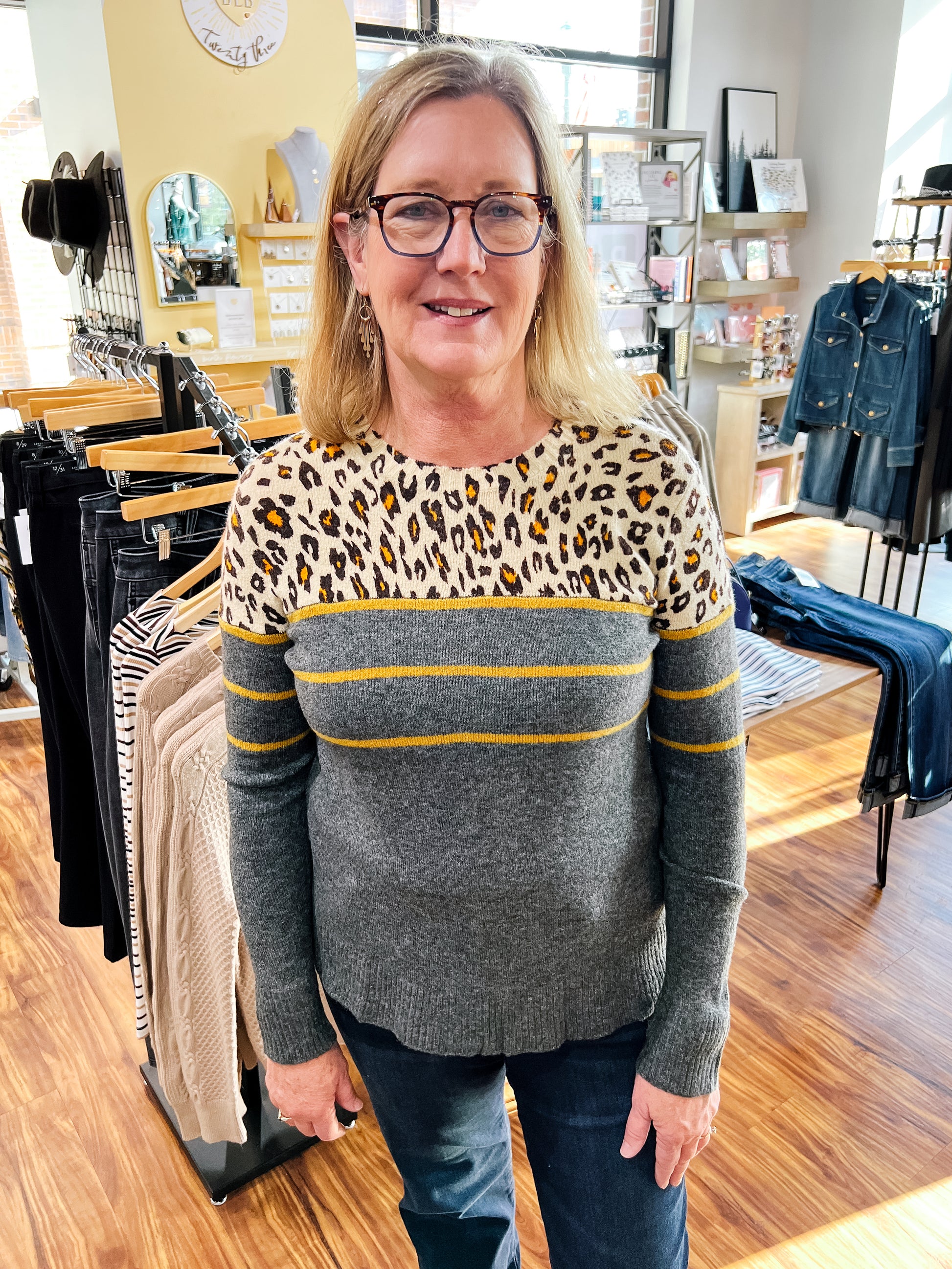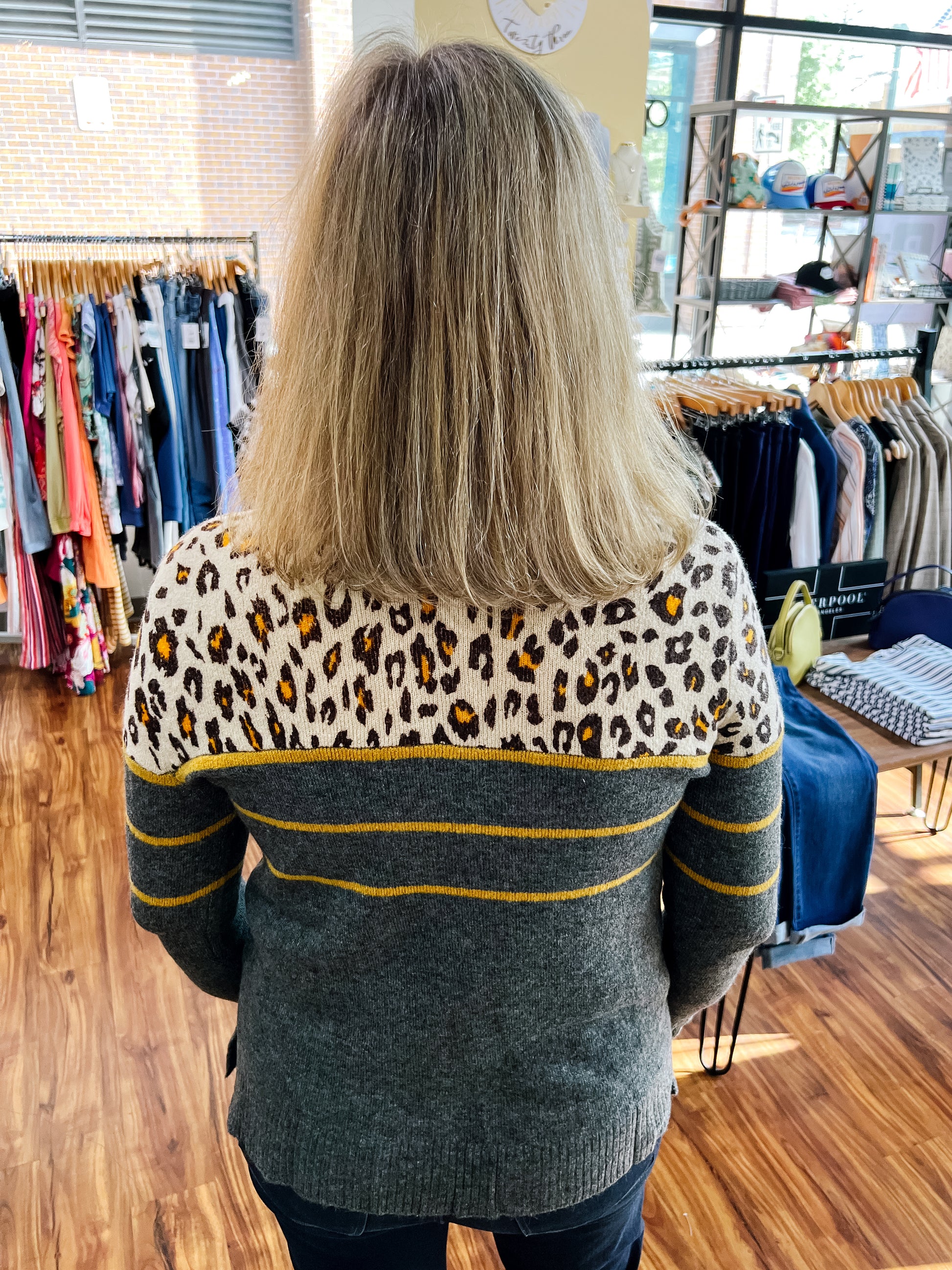 Product Description: Stand out in this eye-catching sweater featuring a bold mix of prints and color. A charcoal gray base is topped with a chic beige leopard print and accented by striking mustard yellow stripes across the center. Finished with a classic crew neckline and long sleeves, this soft knit adds a playful twist to cozy style.