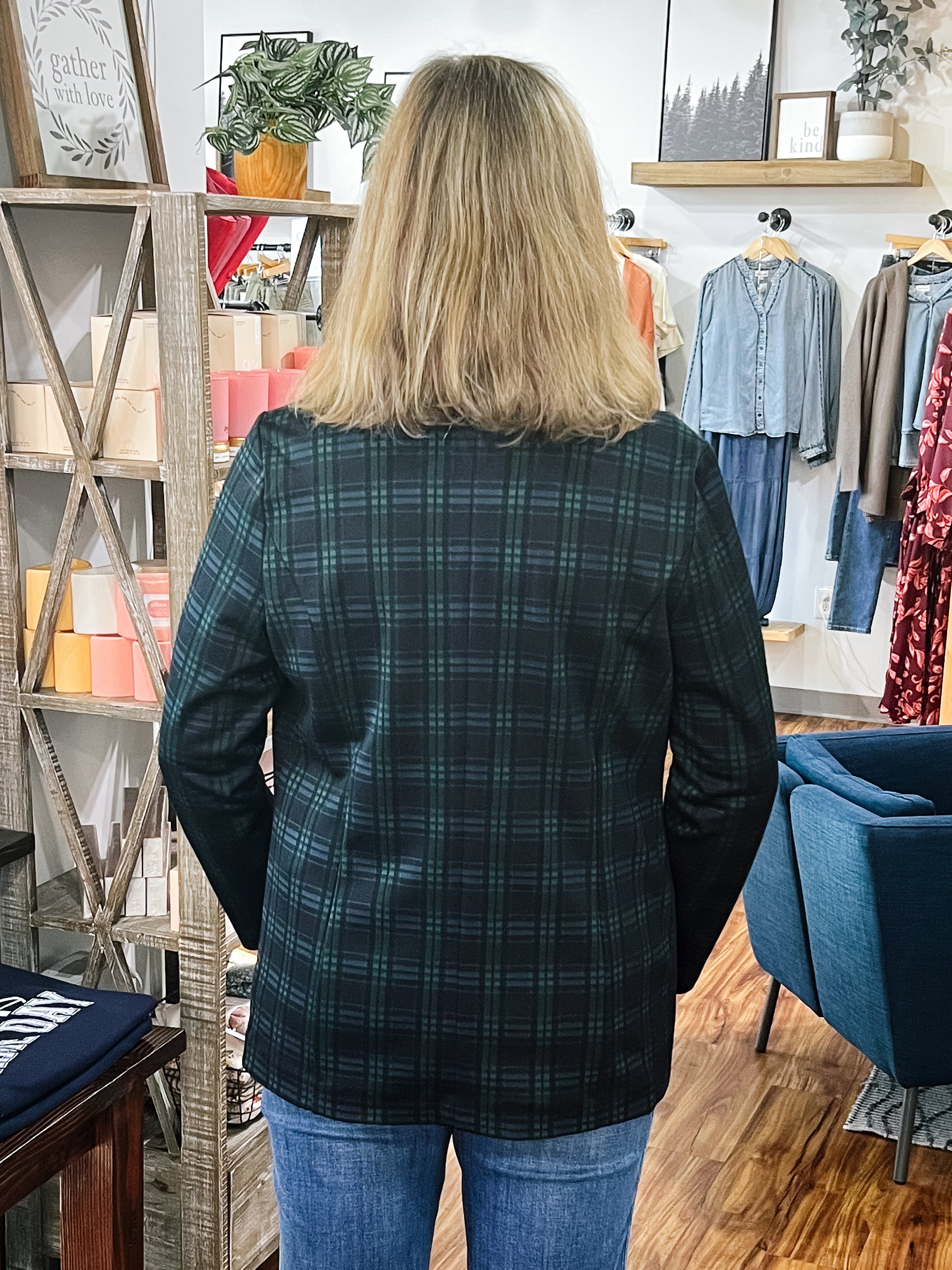 Product Description: Laid-back and stylish, this dark navy and green plaid boyfriend jacket is an easy layering piece. Designed with an open front and two front pockets, it has a relaxed fit that pairs perfectly with denim or leggings. A timeless plaid with a modern, casual vibe.