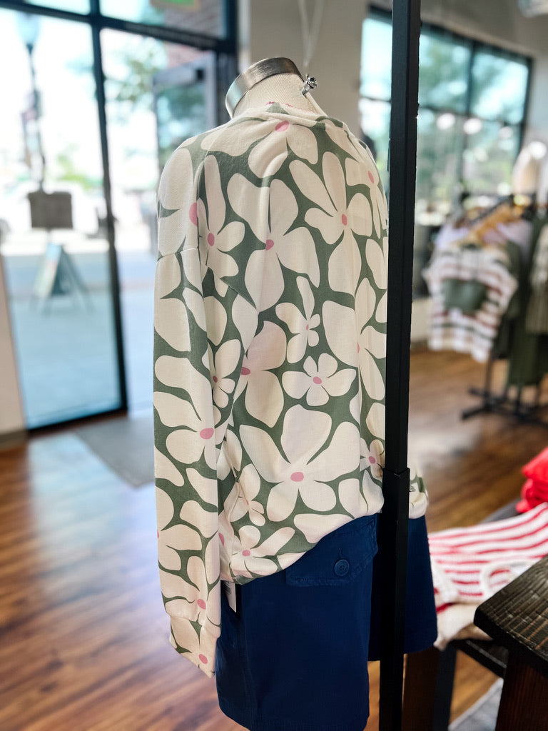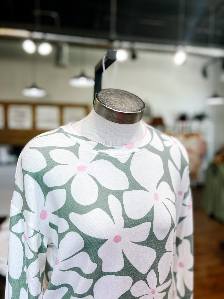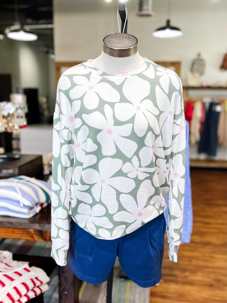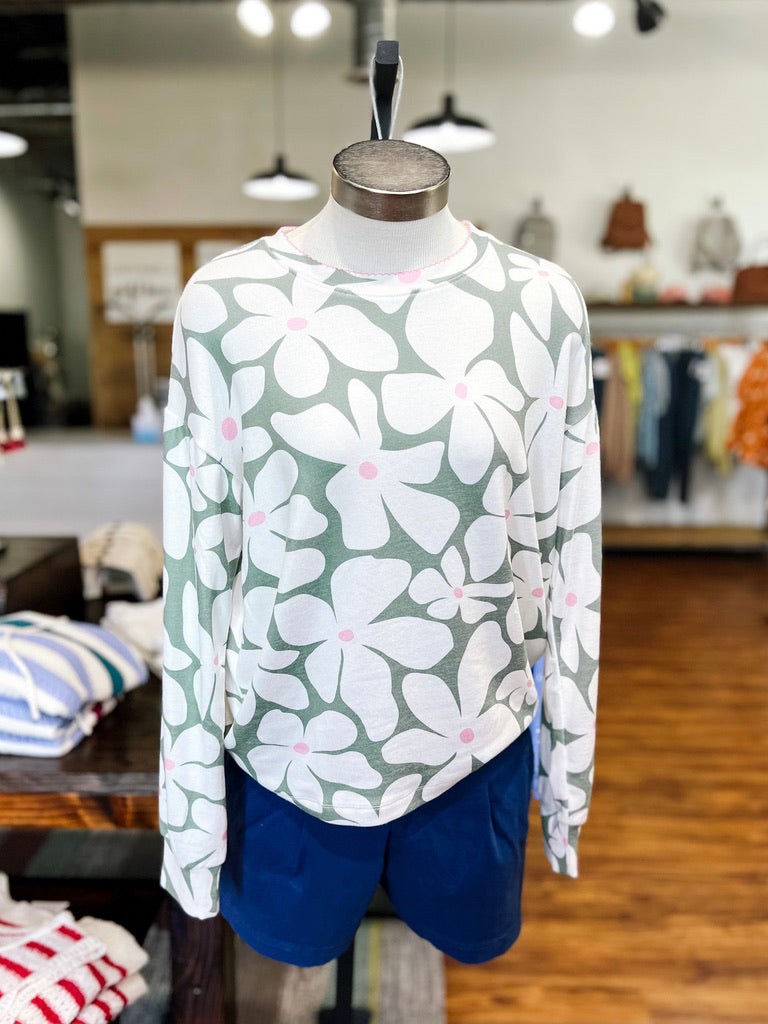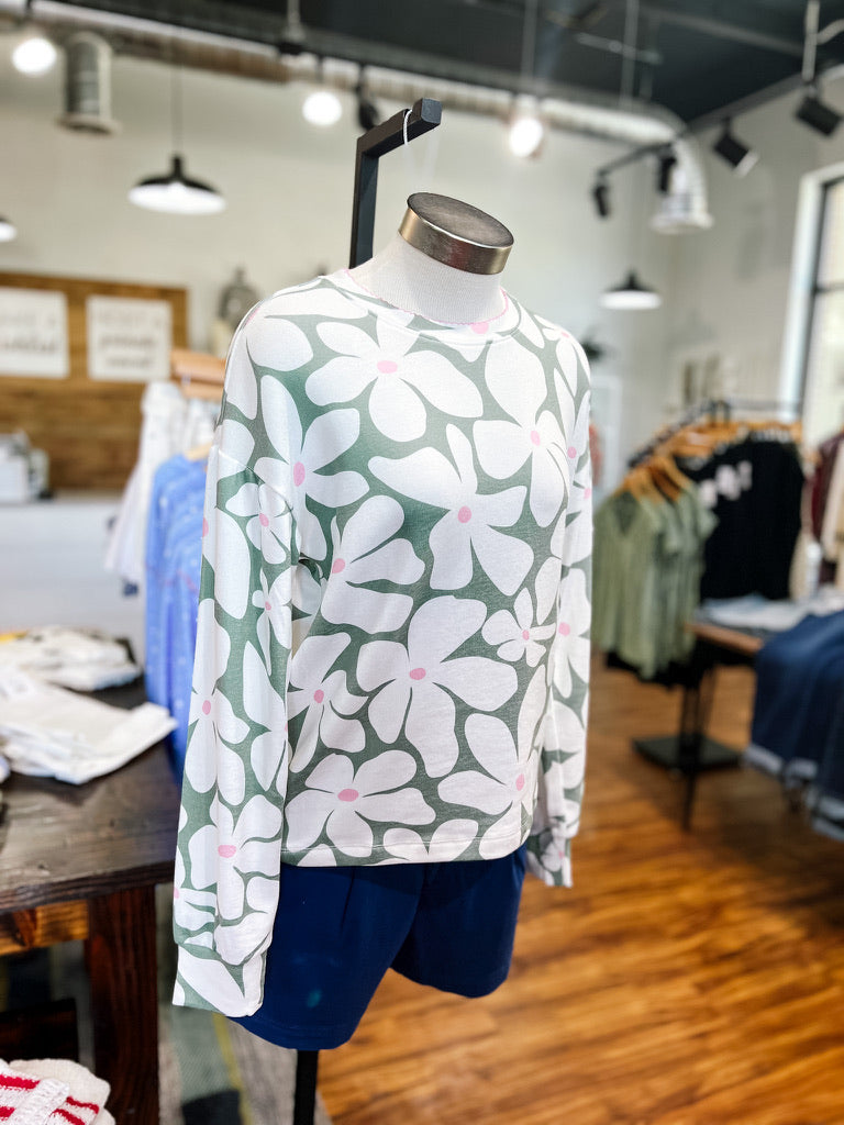 Product Description: Stay cozy in this soft long sleeve top featuring a calming sage green background and a bold cream floral pattern. With its relaxed fit and lightweight feel, it's perfect for lounging in style. Fits true to size.