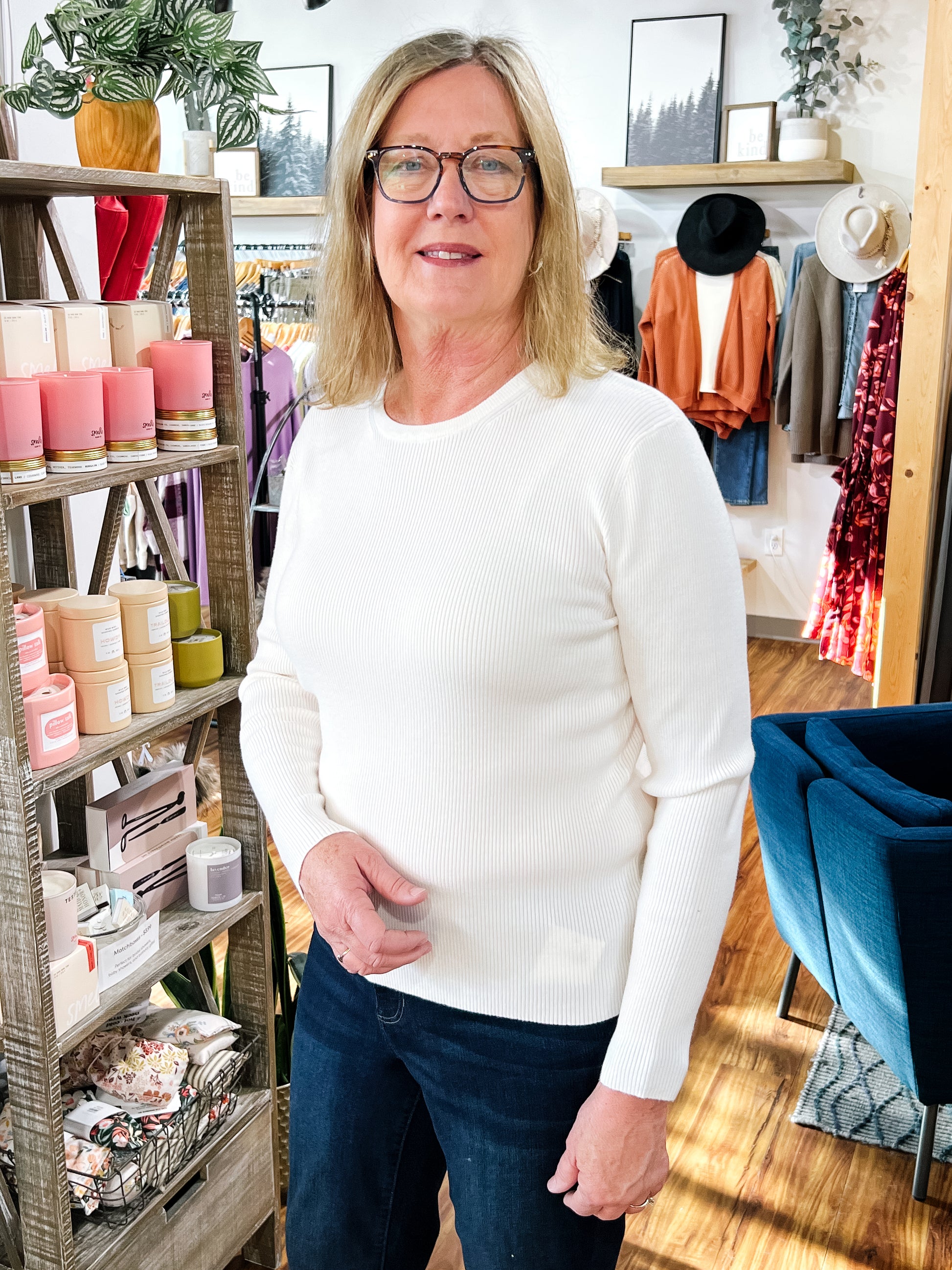 Product Description: Classic and timeless, this ivory ribbed crew neck sweater is a closet essential. The soft knit and long sleeves make it perfect for layering or wearing on its own. With its clean silhouette and versatile style, it pairs effortlessly with denim, skirts, or trousers for a put-together look all season long.