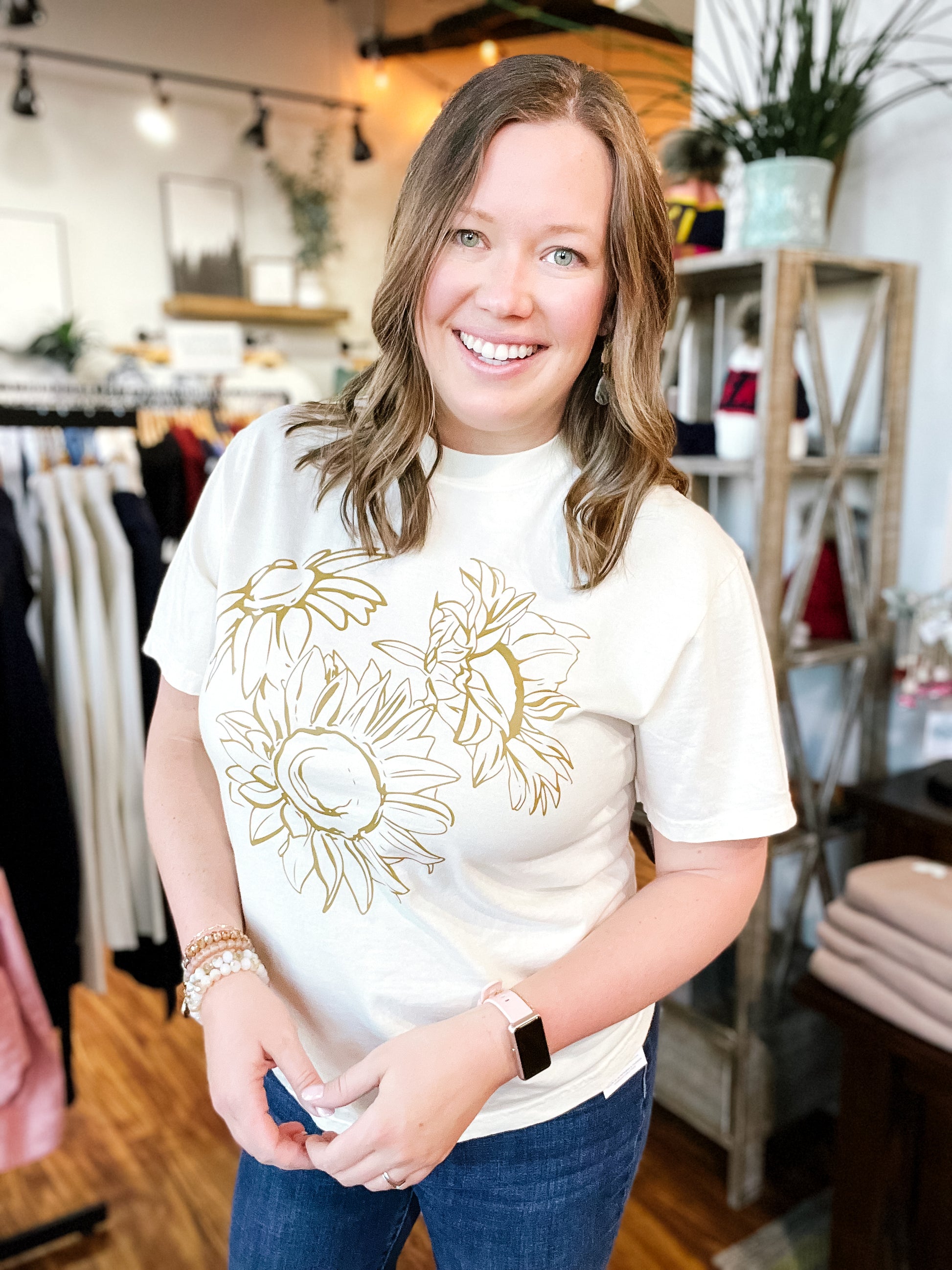 Product Description: A fresh little feel-good tee you’ll reach for on repeat. This cream colored short sleeve t-shirt features a classic crew neckline and a pretty sunflower detail on the front for just the right touch of charm. Soft, easy, and endlessly wearable, it pairs perfectly with denim, skirts, or layered under your favorite jacket.