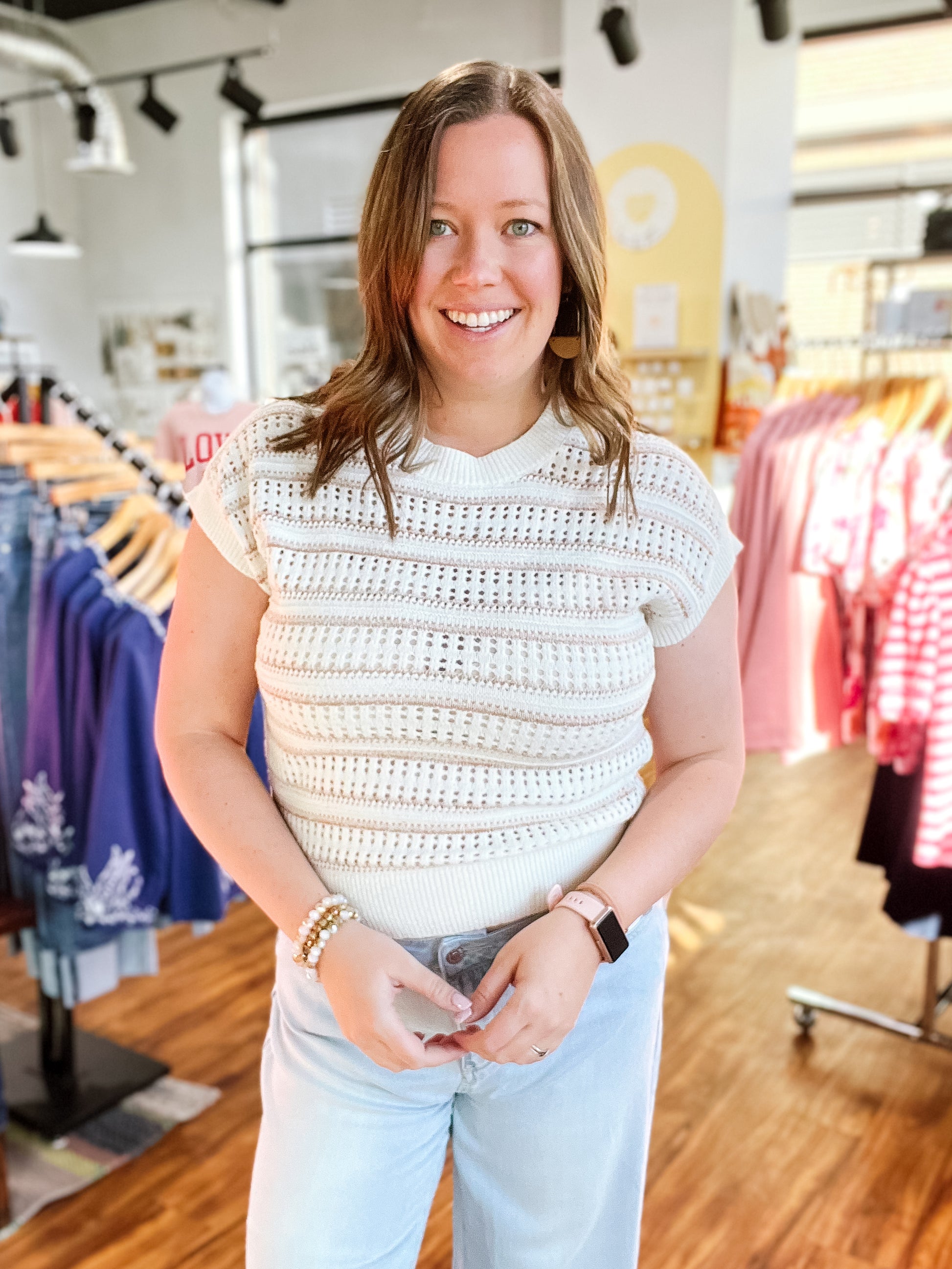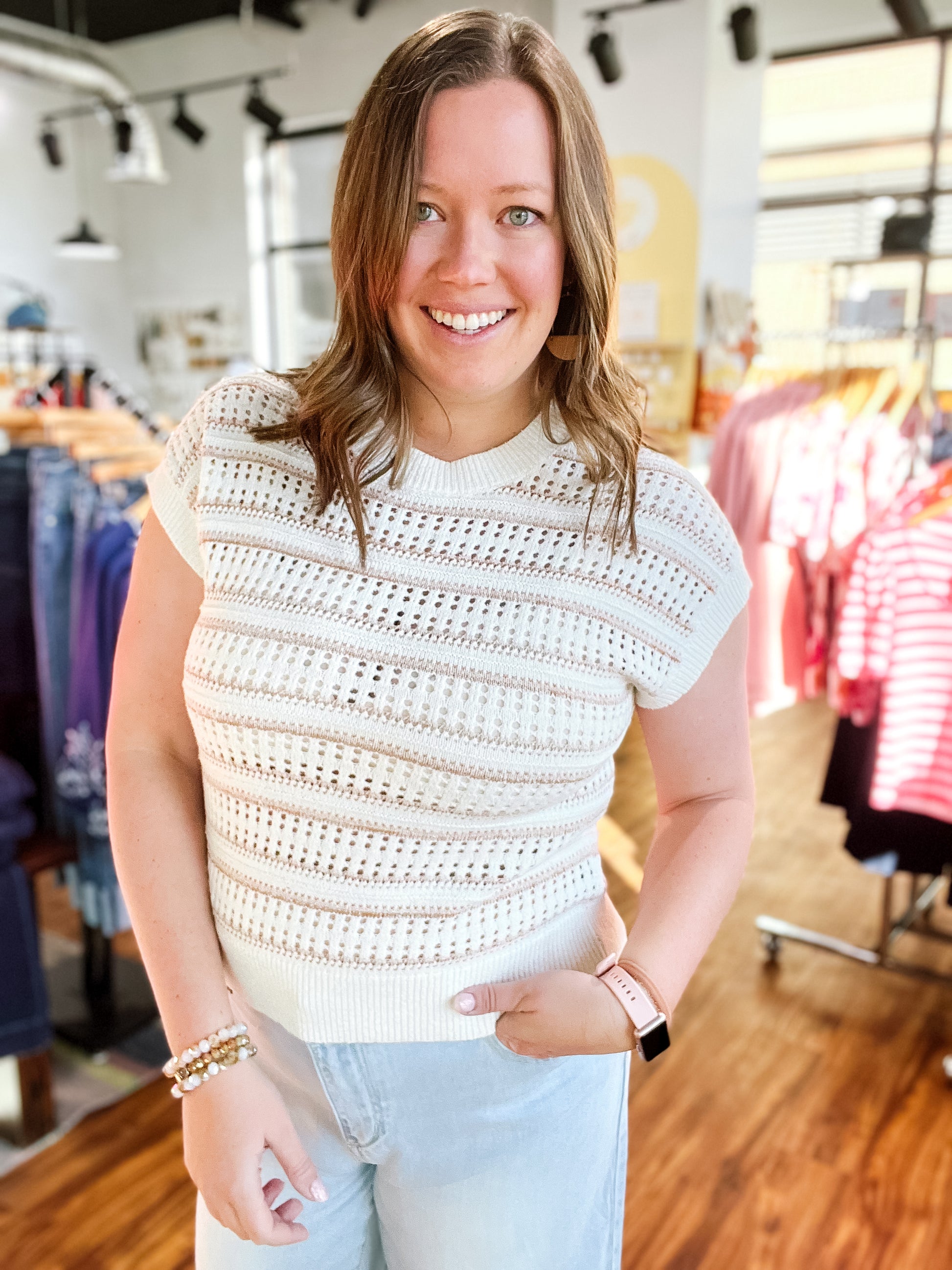 Product Description: This lightweight sleeveless sweater features an airy open-stitch knit with soft taupe stripes against an ivory base. Designed with a classic round neckline, it’s an easy layering piece that works beautifully over a tank or bralette, or worn on its own as the weather warms. Effortless, breathable, and neutral—this sweater is a perfect transition staple for spring and summer.