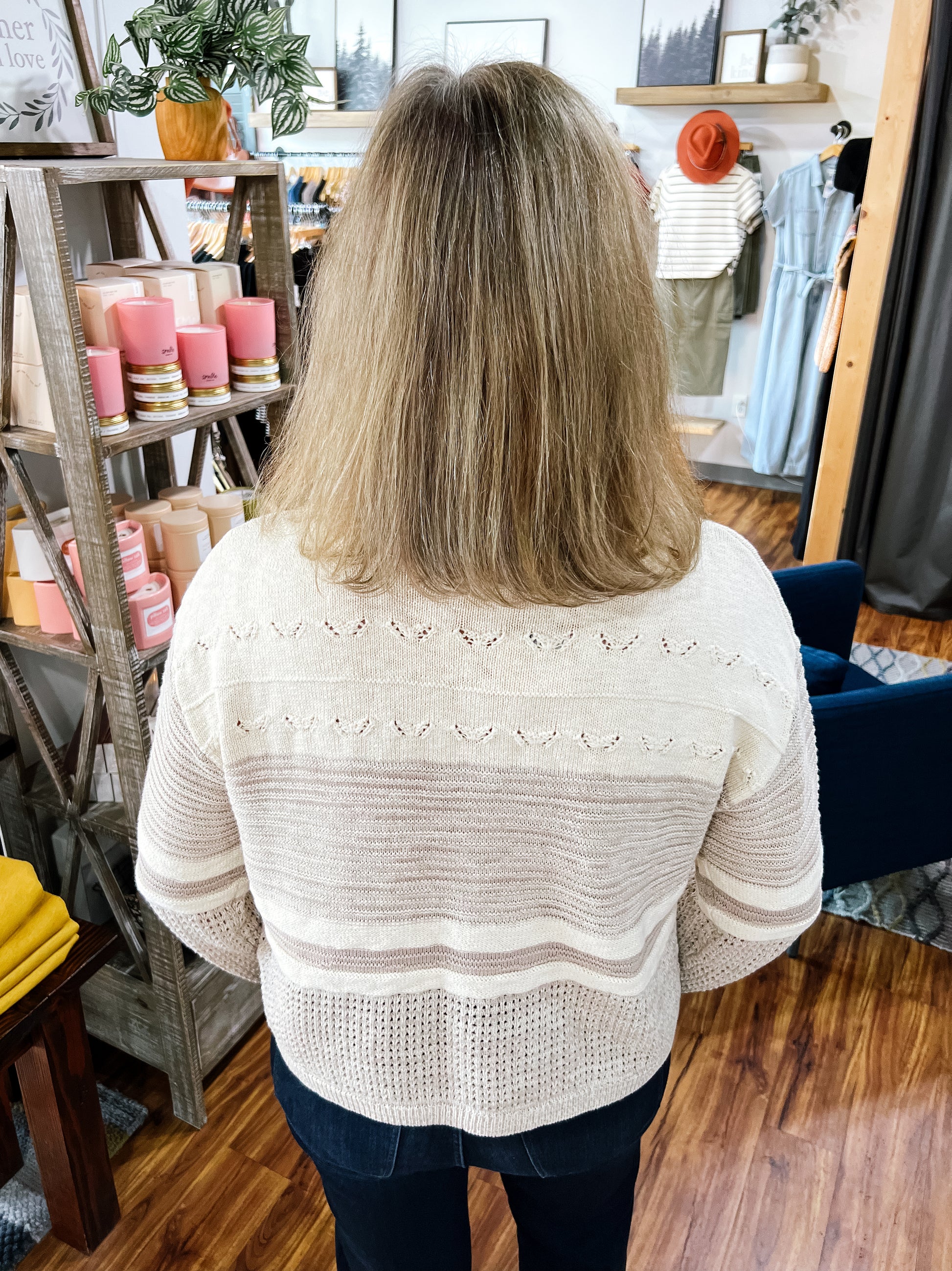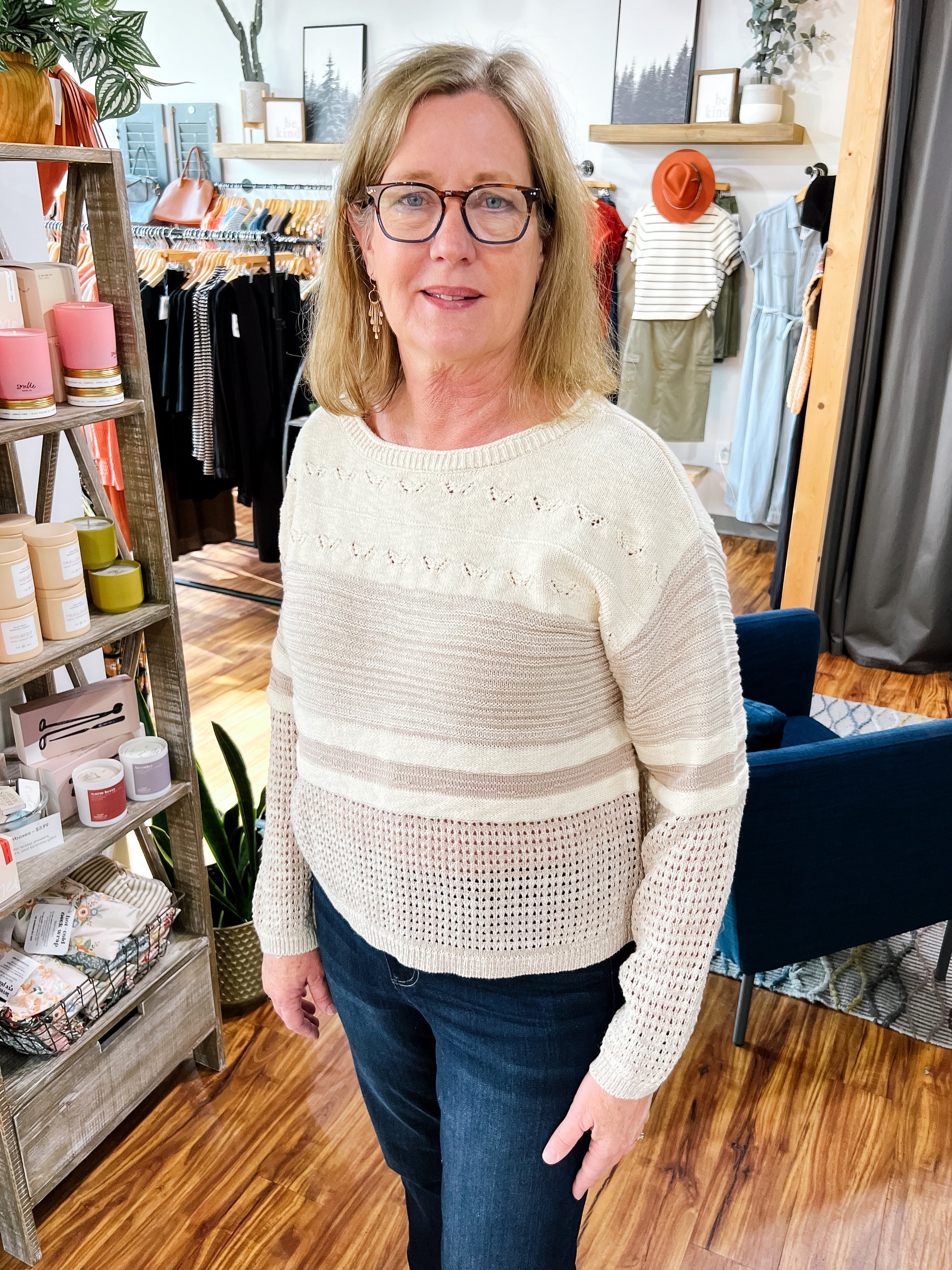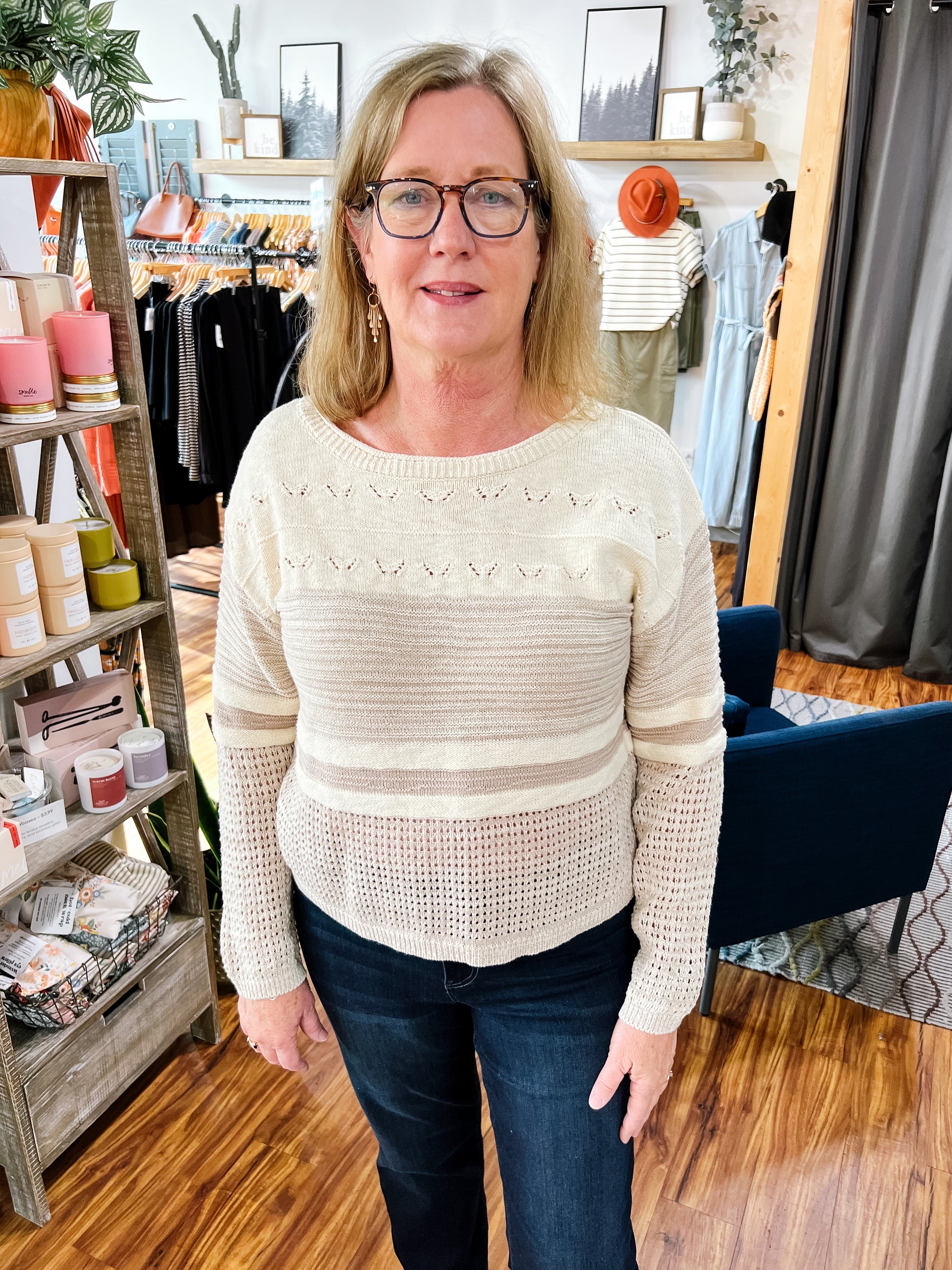 Product Description: A timeless boat neck silhouette with ivory and beige stripes. Designed with a variety of knit stitches that give it unique texture and charm. Long sleeves and a soft feel make it perfect for everyday wear.