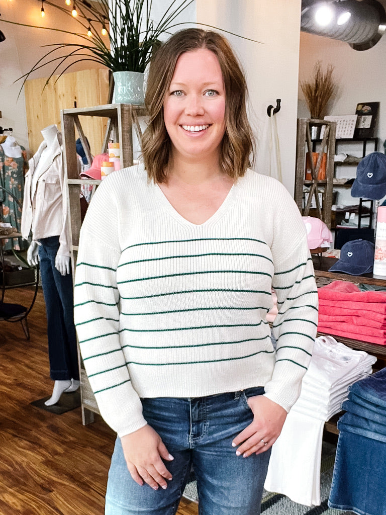 Product Description: This ivory TUCKER sweater with rich forest green stripes is a fresh take on a timeless classic. Designed with a flattering V-neckline and thoughtful side stitching for a slimming silhouette, it’s as comfortable as it is polished. The long sleeves and soft knit make it perfect for layering now and wearing on repeat all season long. Pair it with denim or your favorite trousers for an effortlessly put-together look. Fits true to size.