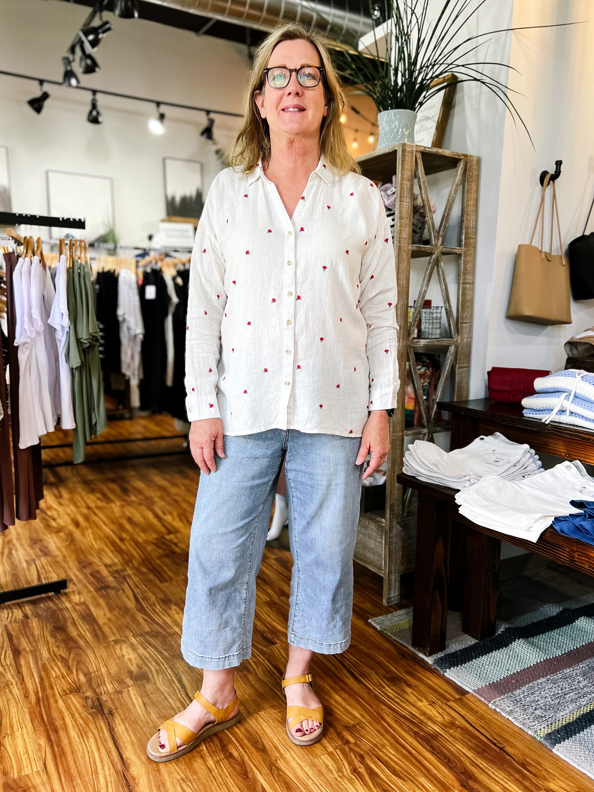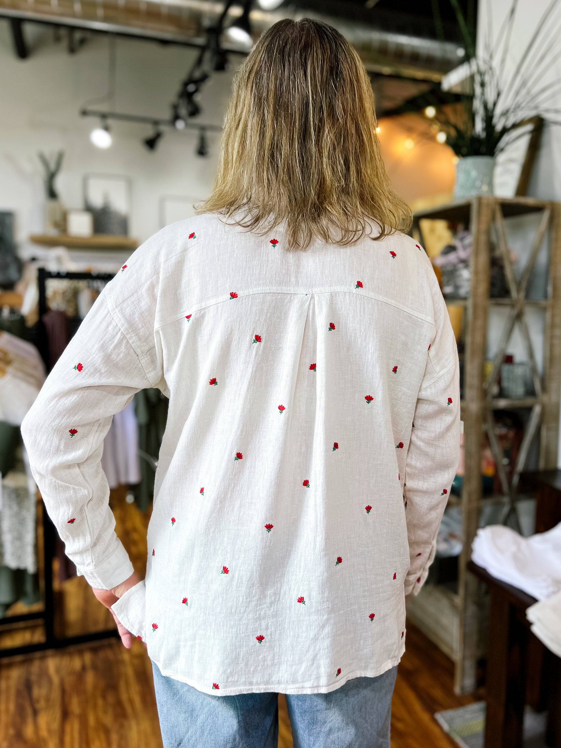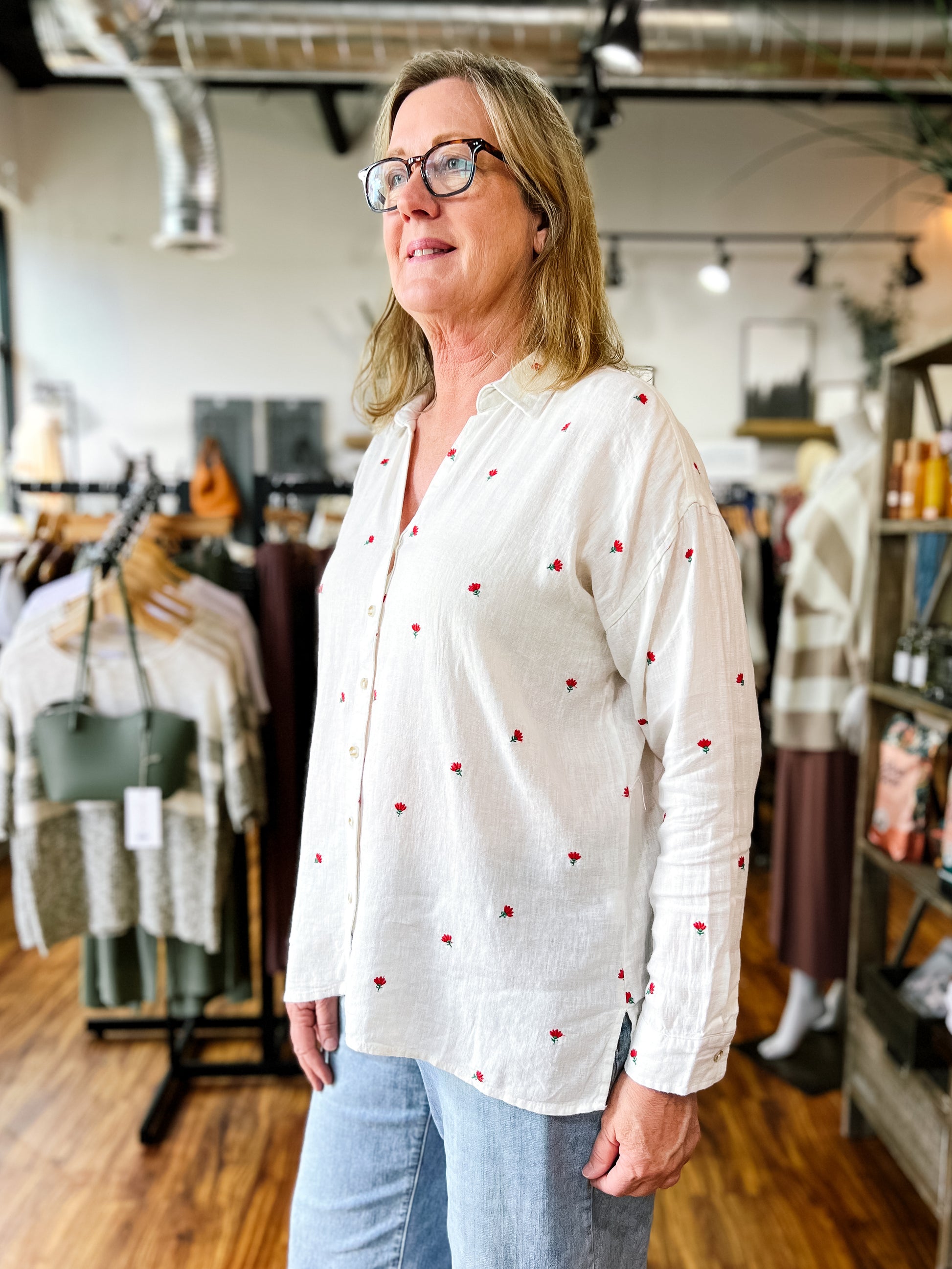 Product Description: This ivory long sleeve shirt features beautiful red and green embroidered floral detailing. With a flowy, airy feel, it’s designed with a collared v-neckline, button-down front, and subtle side slits for movement. A unique and feminine statement piece perfect for dressing up or down.