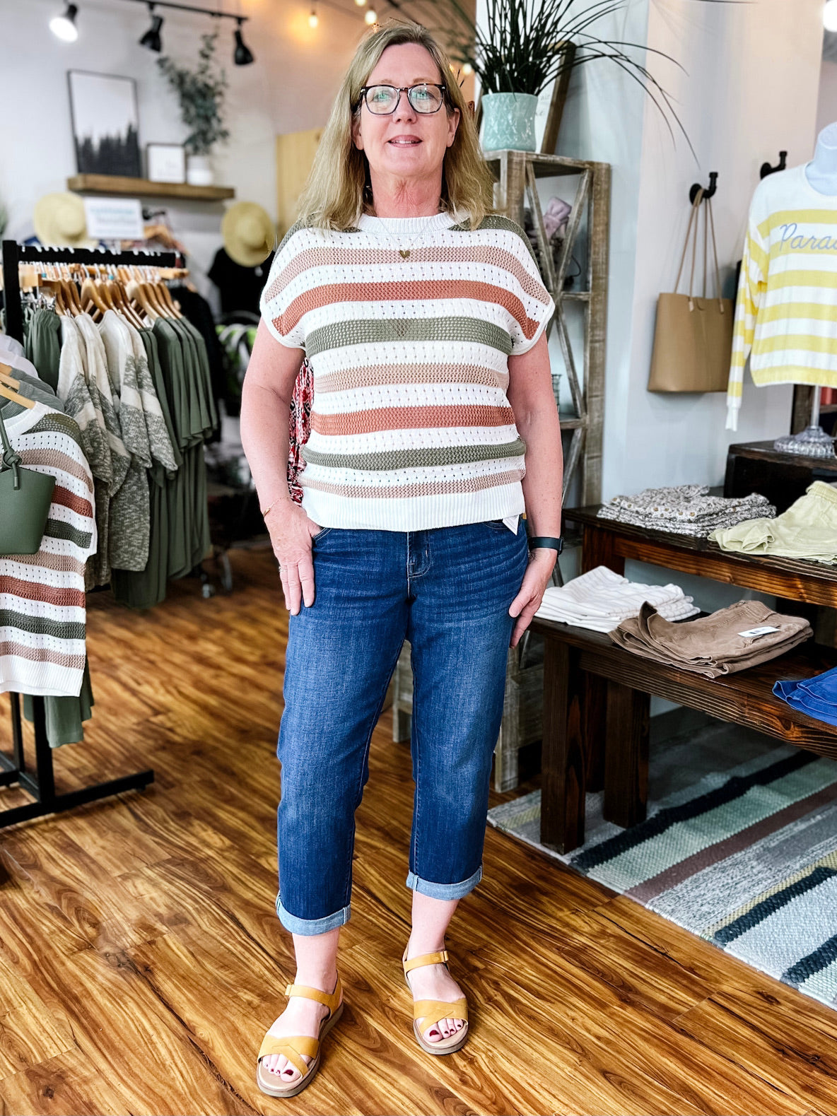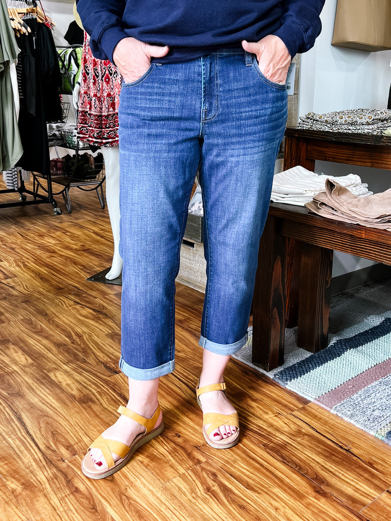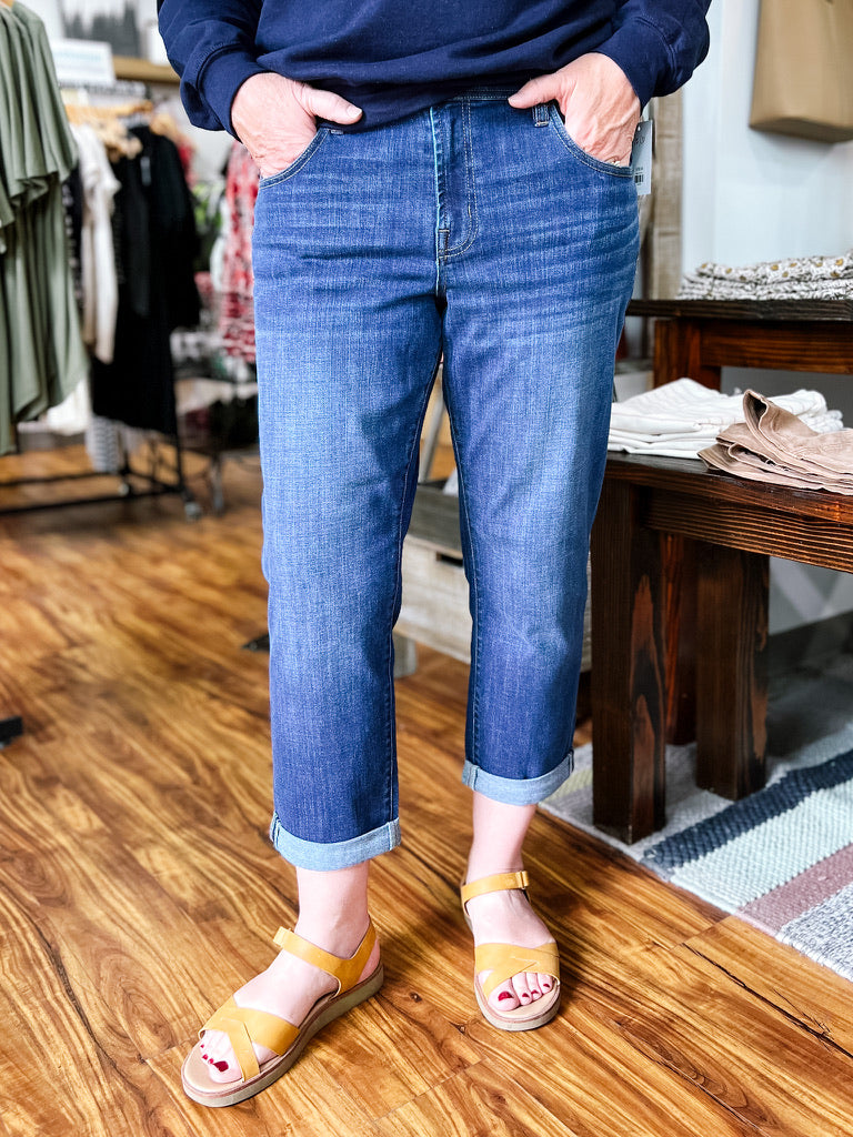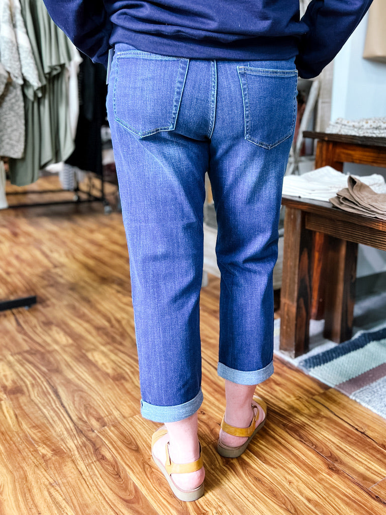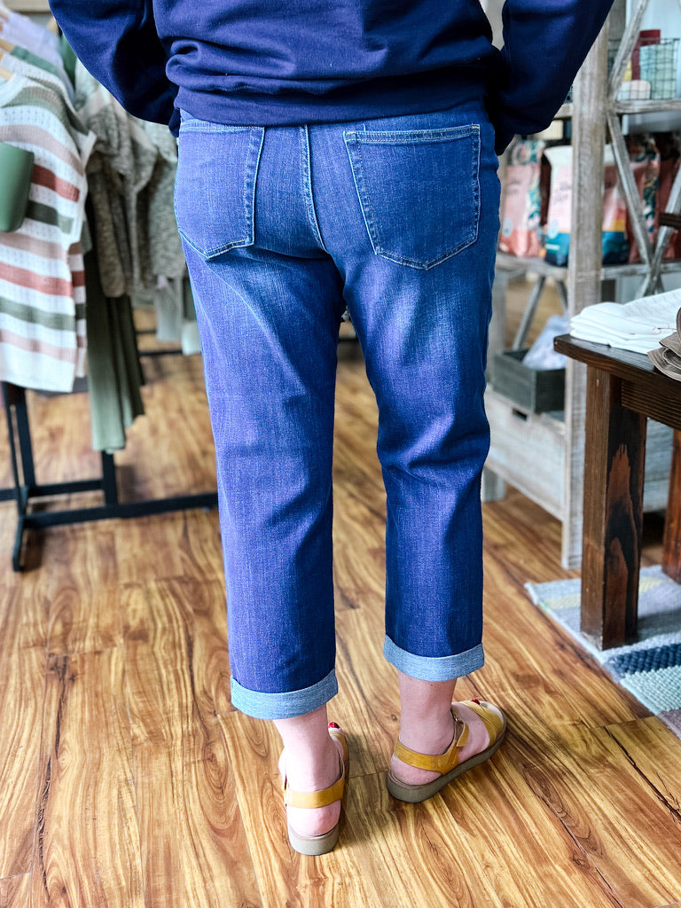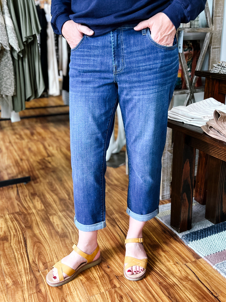 Product Description: Meet your new favorite: the "Keeper" Boyfriend Jean. In a flattering darker wash with a relaxed fit, this cropped style features a cuffed hem for an effortlessly cool, lived-in look. Perfect for pairing with sneakers or ankle boots. Fit true to size with a slouchy, comfortable fit.
