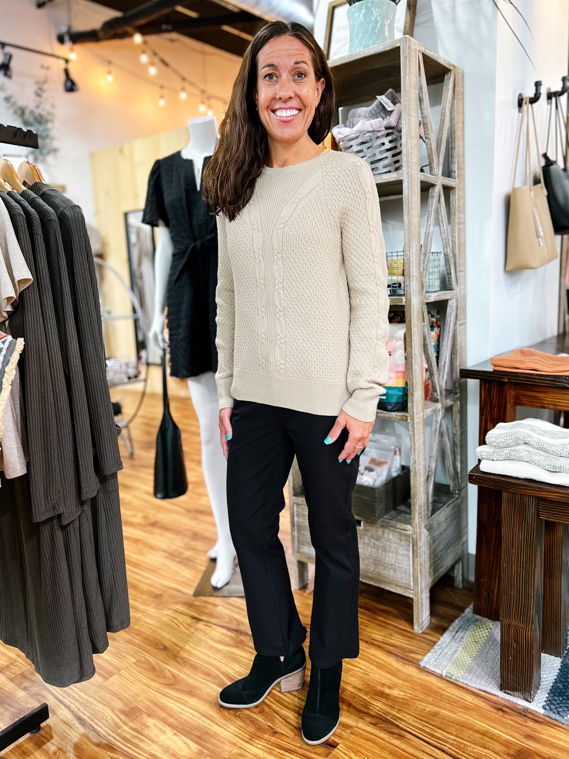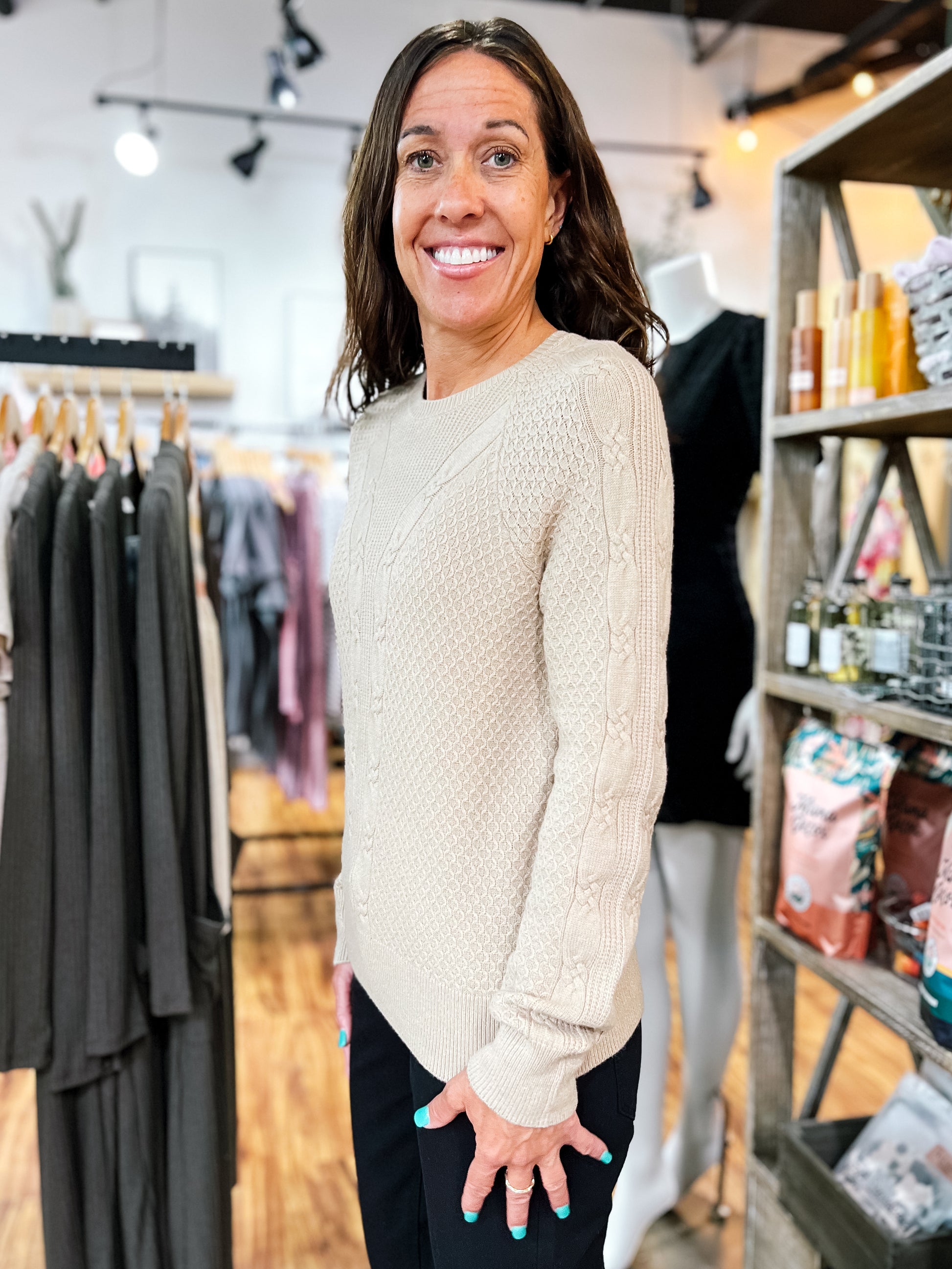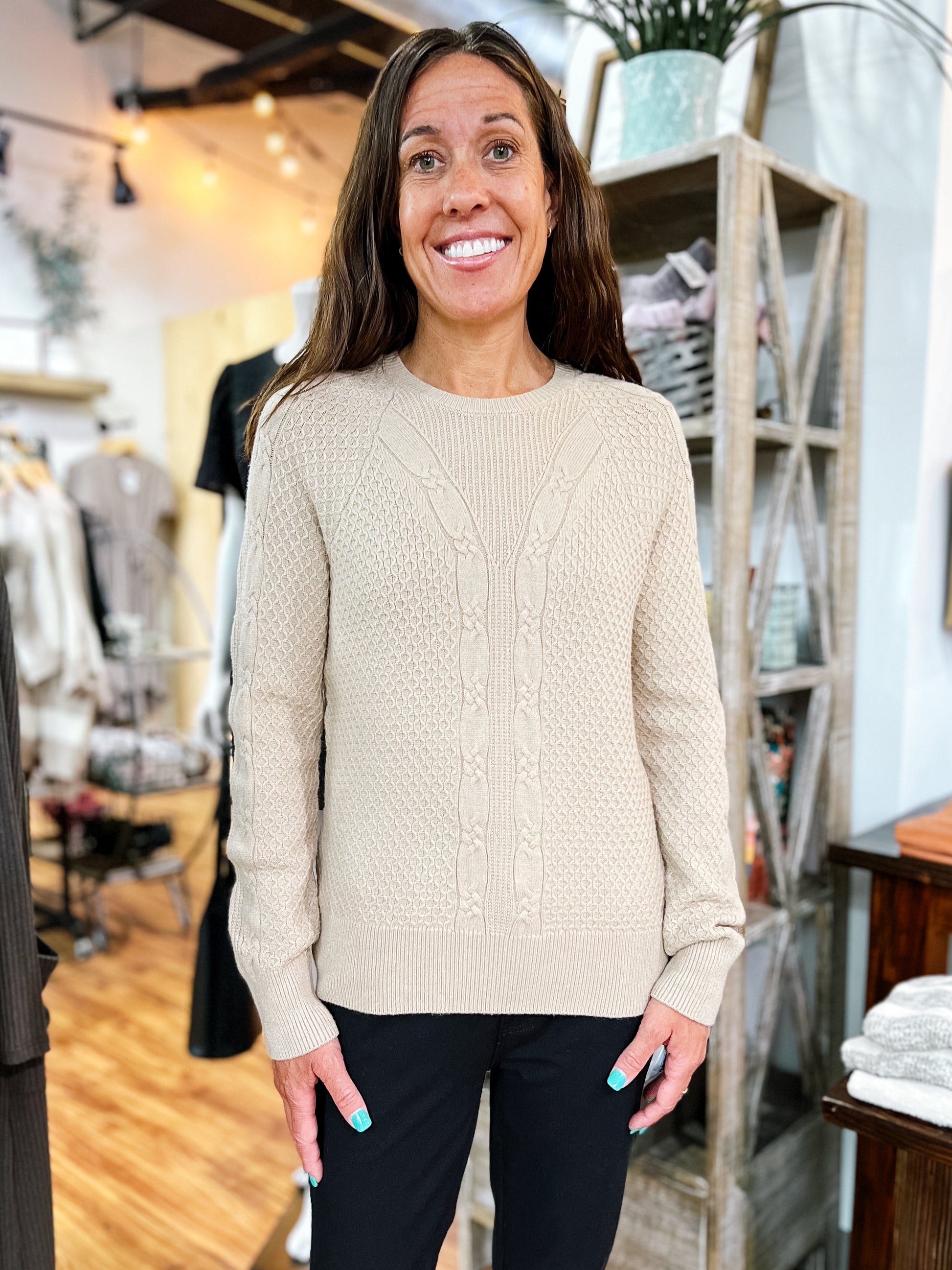 Product Description: Khaki multi-patterned knit sweater with a round neck—unique and soft with just the right amount of texture. Pair it casually with jeans and boots, or dress it up layered over a collared shirt with a skirt and boots. Great for both everyday wear and cozy fall outings.