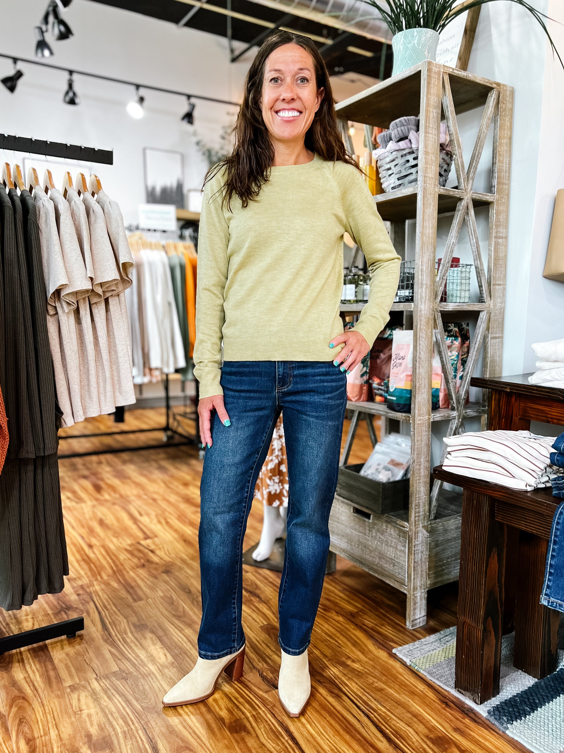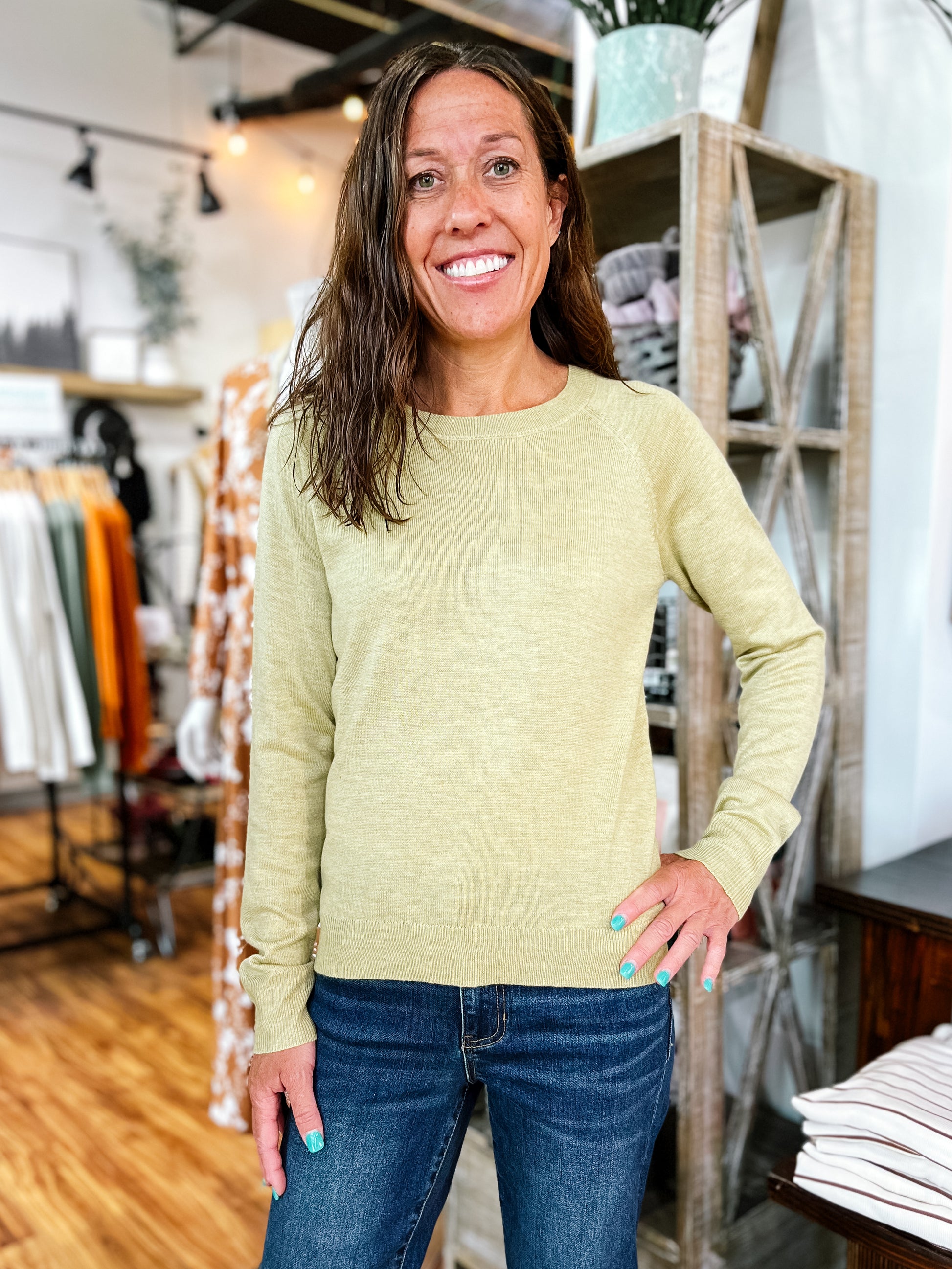 Product Description: This lightweight transitional sweater top comes in a unique greenish yellow tone that’s perfect for late summer into fall. Thoughtful stitch detailing on the front and back shoulders adds subtle interest, while ribbed cuffs and waistband give it a polished finish. A versatile piece that pairs well with jeans or layered over a dress.
