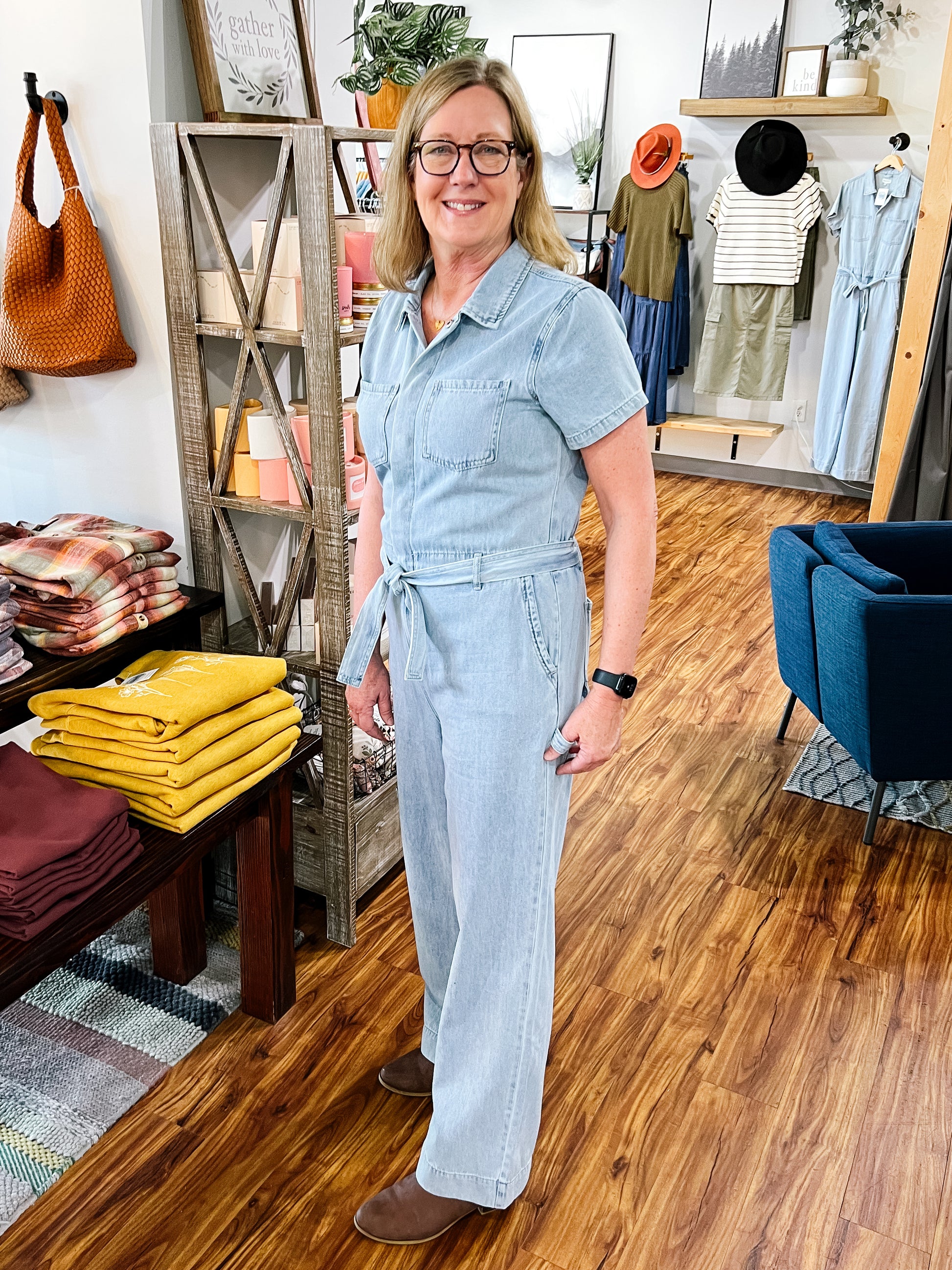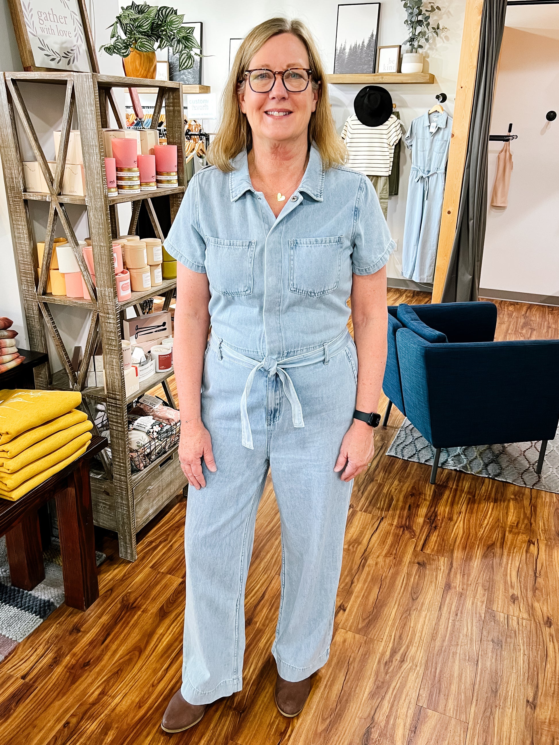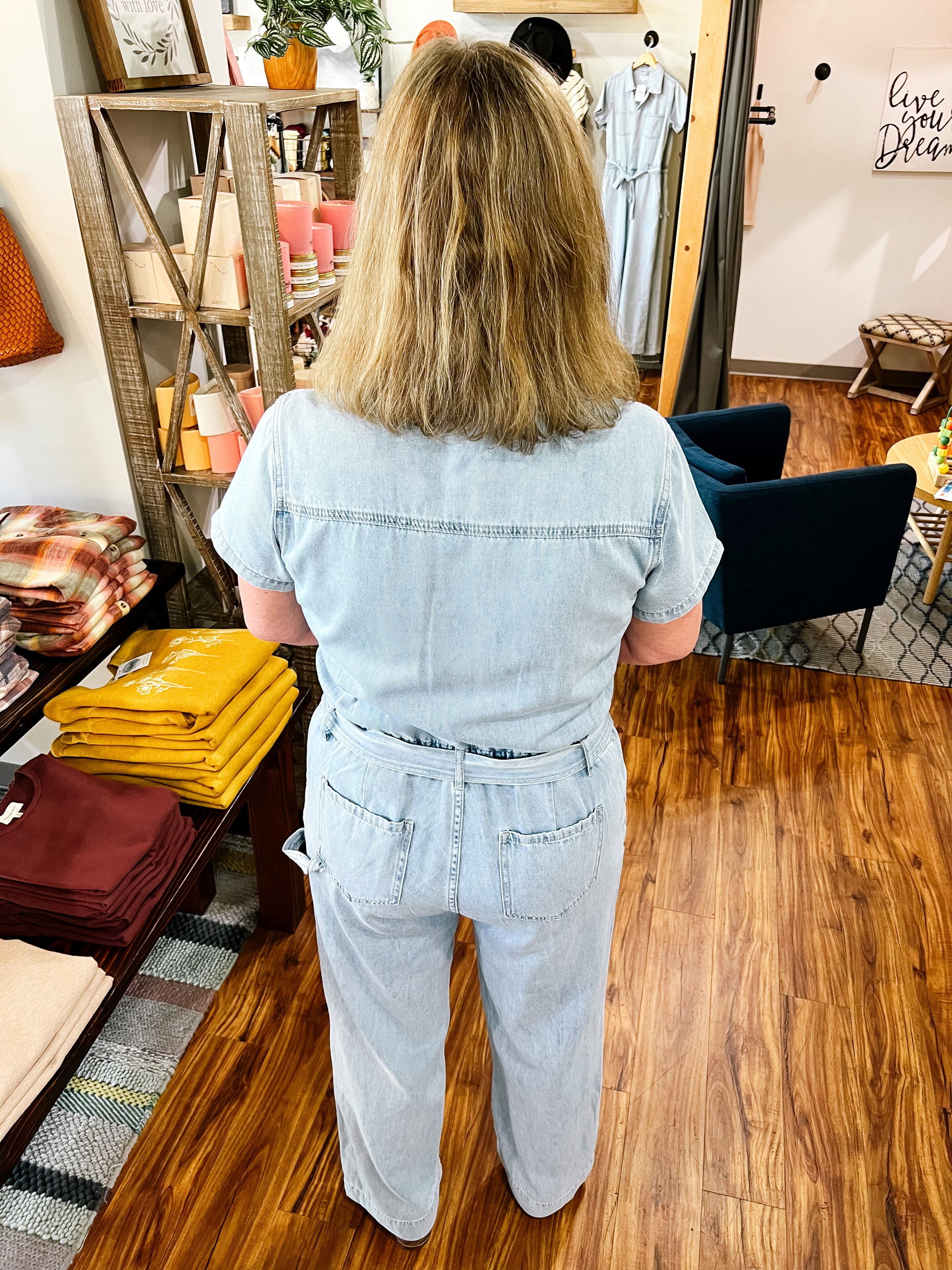 Product Description: This light wash denim jumpsuit features short sleeves, a belted snap-front closure, and classic gold stitching for a timeless, relaxed look. Front breast pockets, side pockets, and a painter’s tab add functional, stylish details, while the wide-leg cut and 30-inch inseam create a flattering silhouette. Wear it with white sneakers for casual daytime outings or pair with heeled sandals and layered jewelry for an effortless evening look.