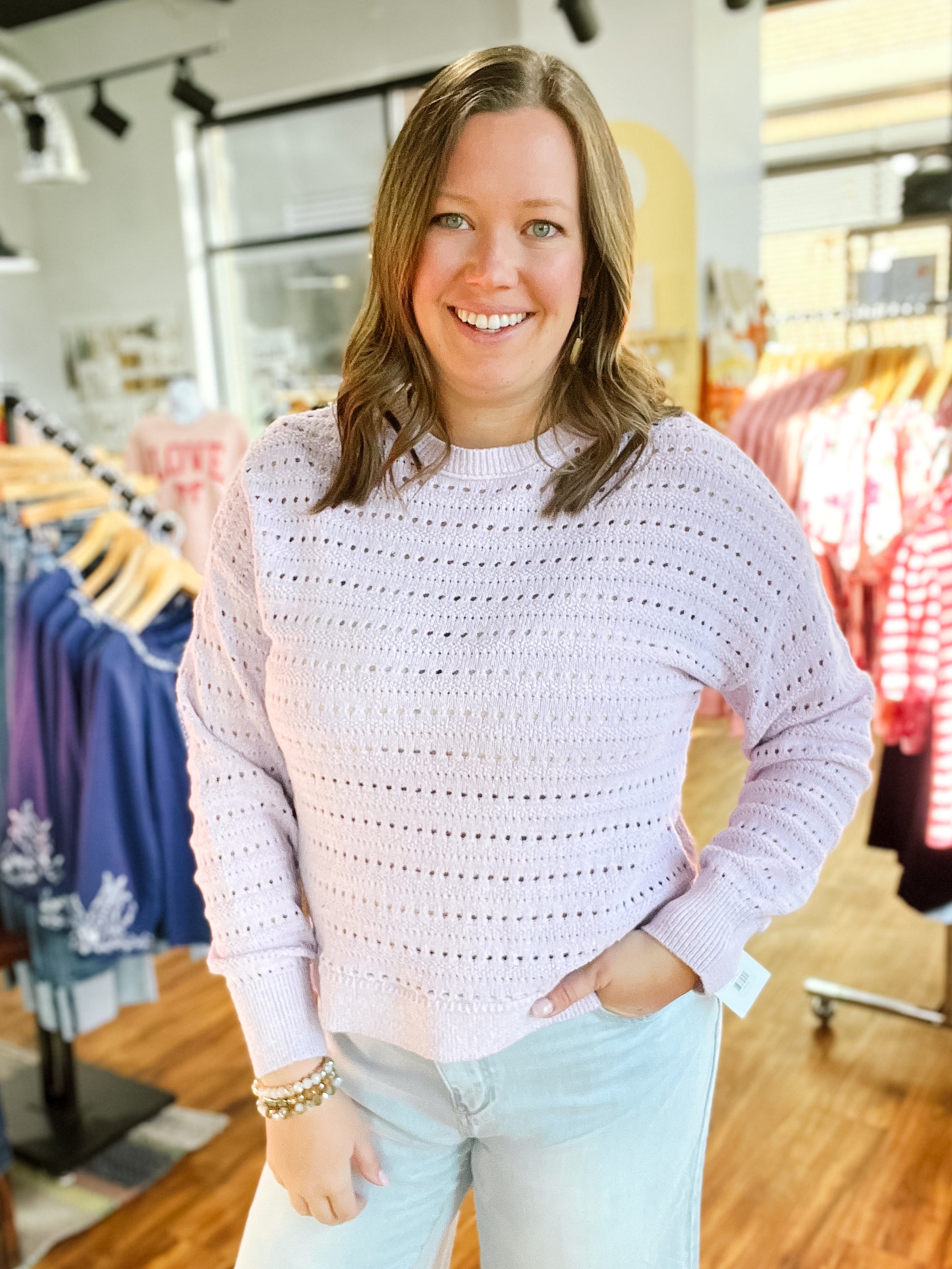 Product Description: This soft lilac sweater features an airy open-stitch knit that’s perfect for lightweight layering. Designed with a classic round neckline and long sleeves, it’s finished with side slits for easy movement and a relaxed fit. Fresh, feminine, and effortlessly wearable, this sweater is ideal for transitioning between seasons while keeping your look light and cozy.