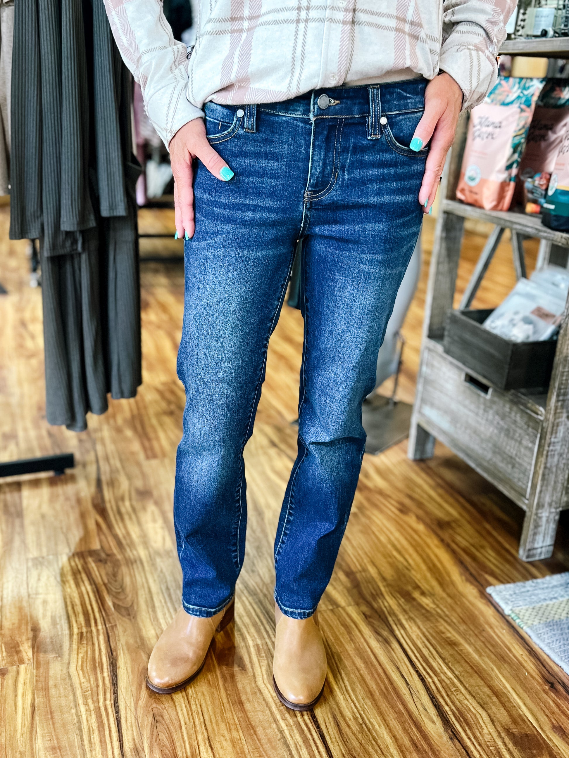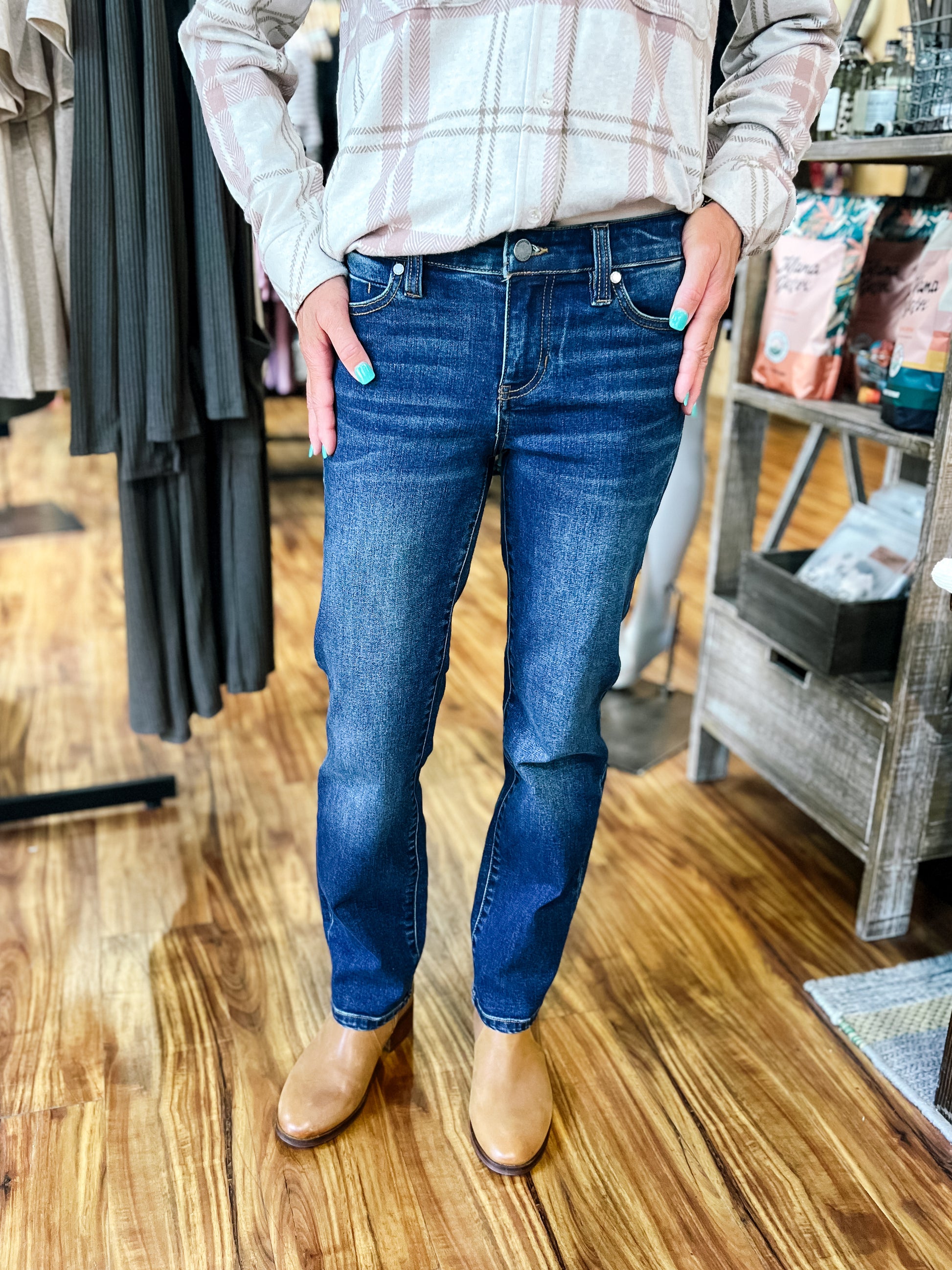 Product Description: The Liv Non-Skinny Skinny Gleason Jean features a dark wash with subtle distressing and classic gold stitching. Designed with a flattering 9-inch rise and 28-inch inseam, these jeans offer amazing stretch for all-day comfort and a sleek, not-too-skinny fit.