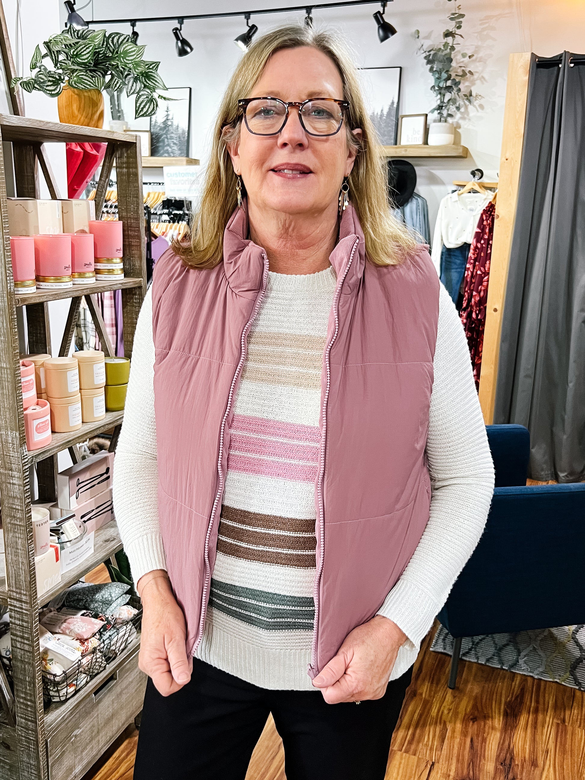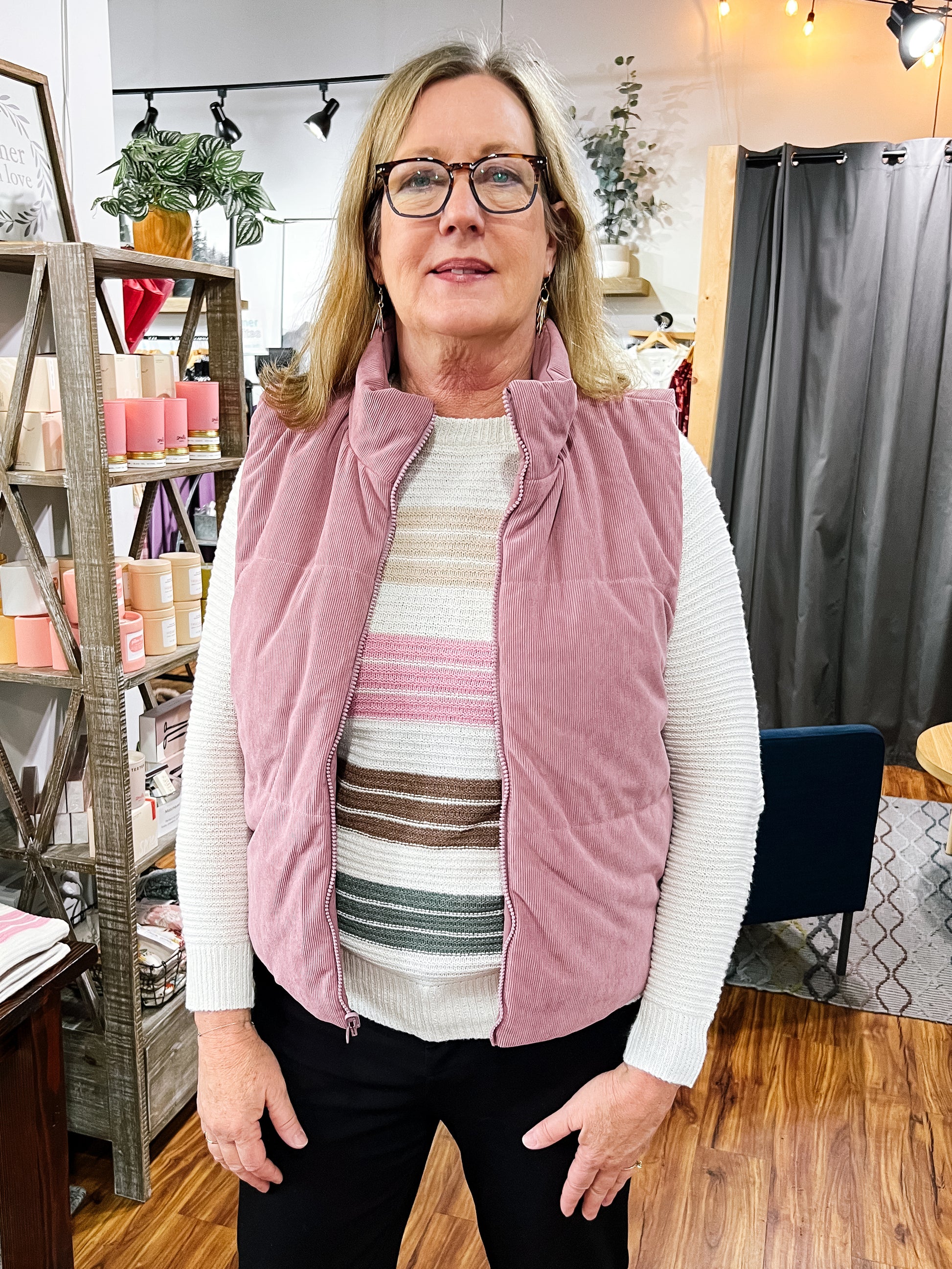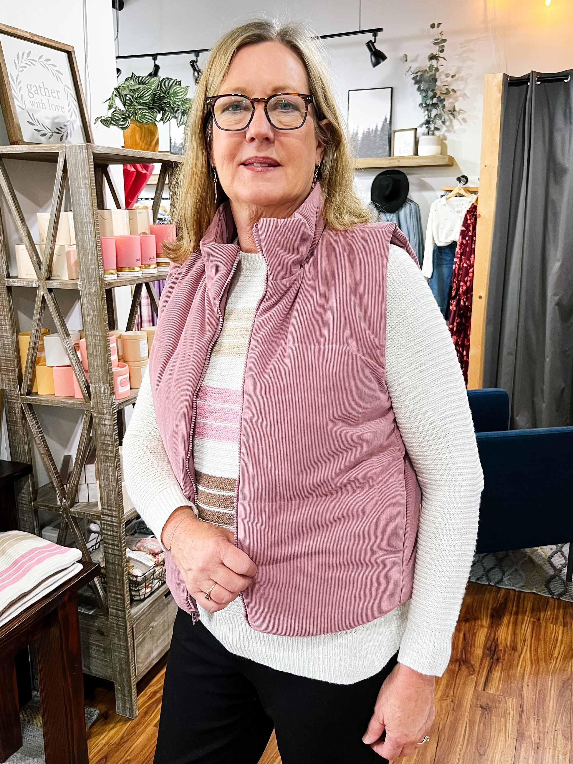 Product Description: A versatile layer with cozy texture and style. This vest features soft mauve corduroy on one side and a smooth finish on the other, making it easy to switch up your look. Designed with a front zip closure and side slit pockets for function and ease, it’s the perfect piece to add warmth without bulk.